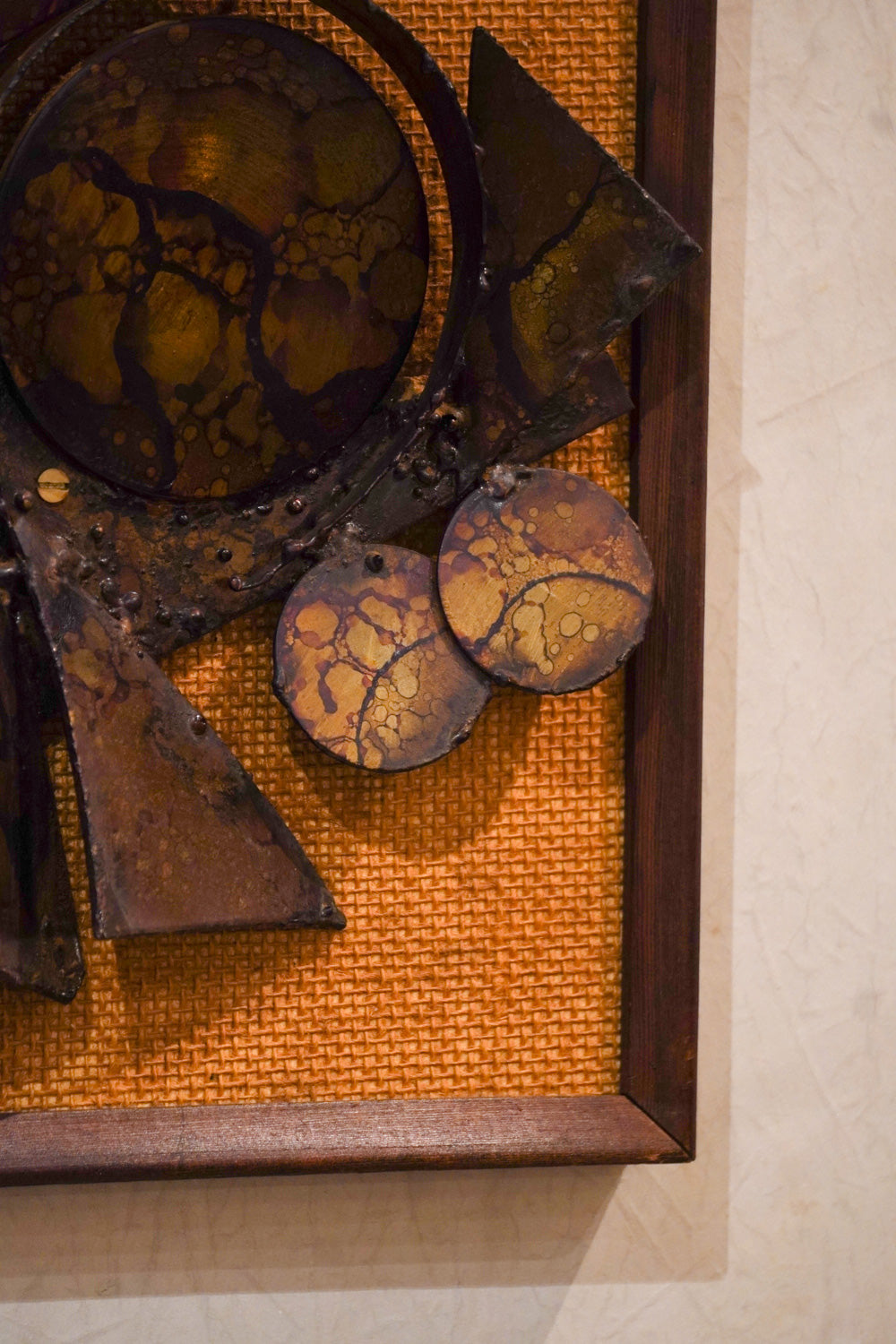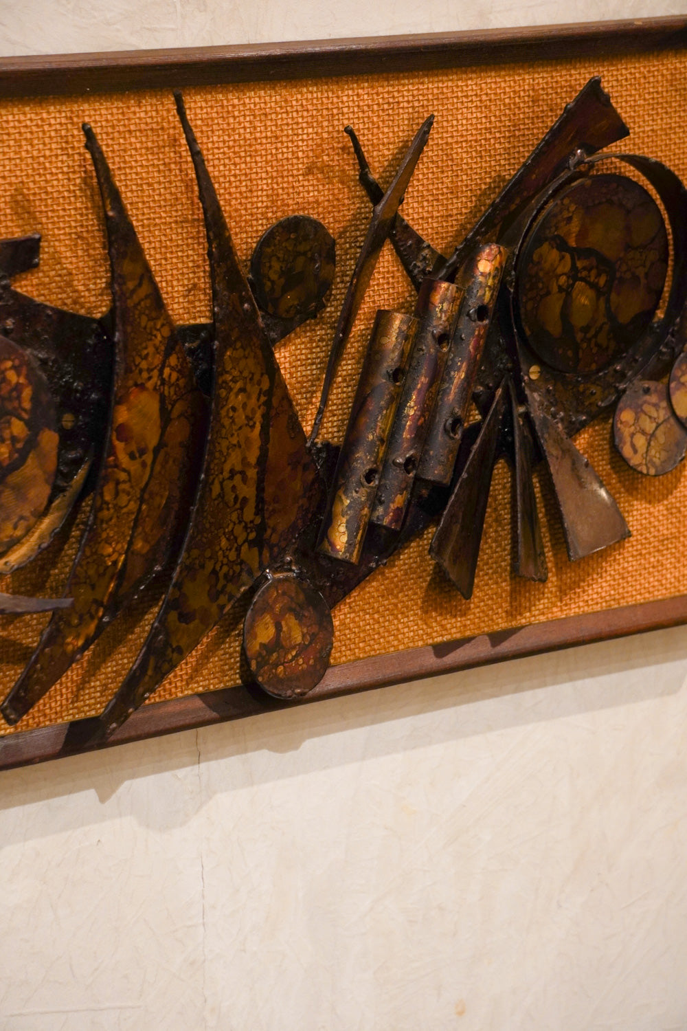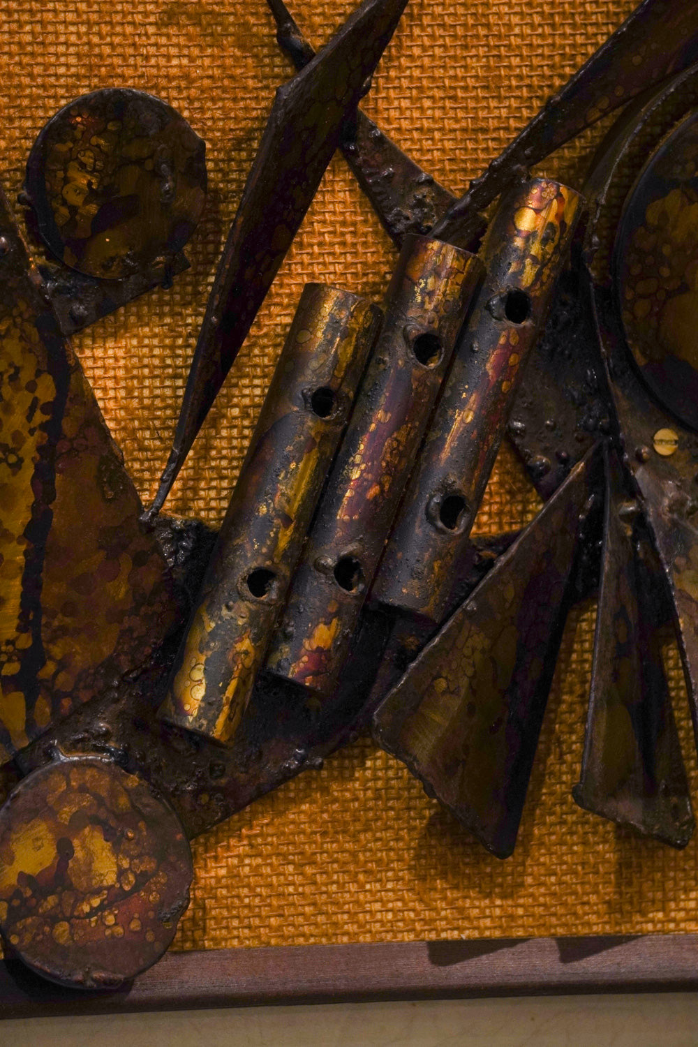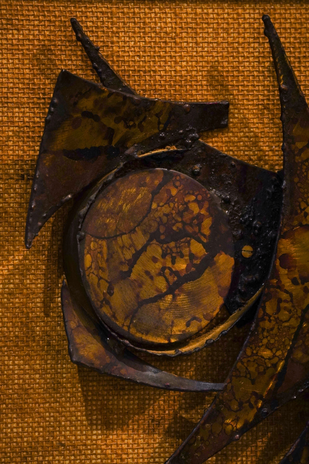 金属片を組み合わせ、制作されているようです。金属の表面には、熱による変色や斑点状の加工が施されており、独特の風合いを出しています。