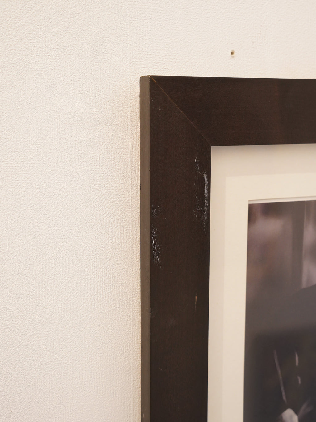 ブラックの木製の額縁と、写真周囲の白い台紙の組み合わせが、モノクロ写真の持つドラマチックな雰囲気と洗練された質感を際立たせています。