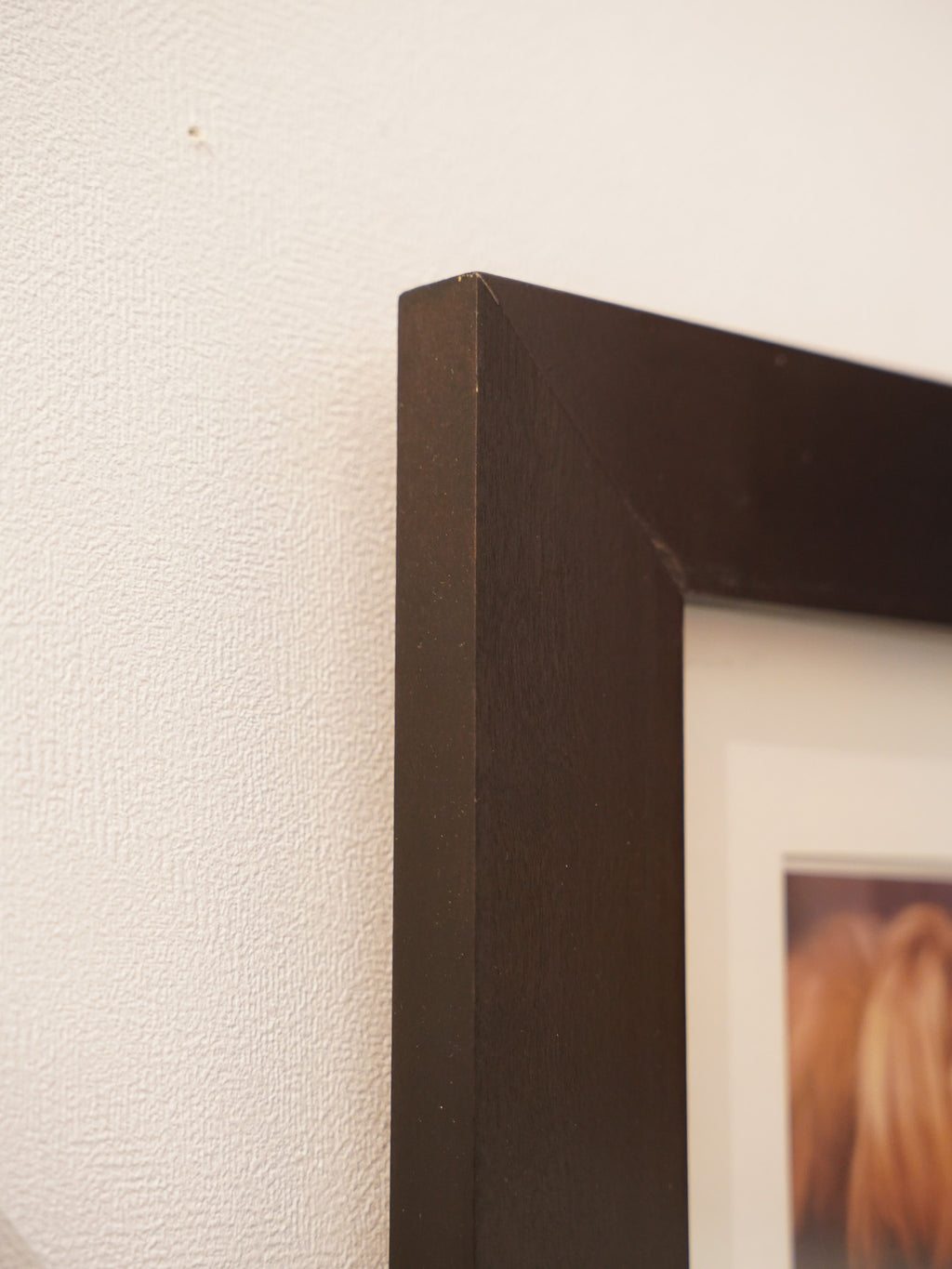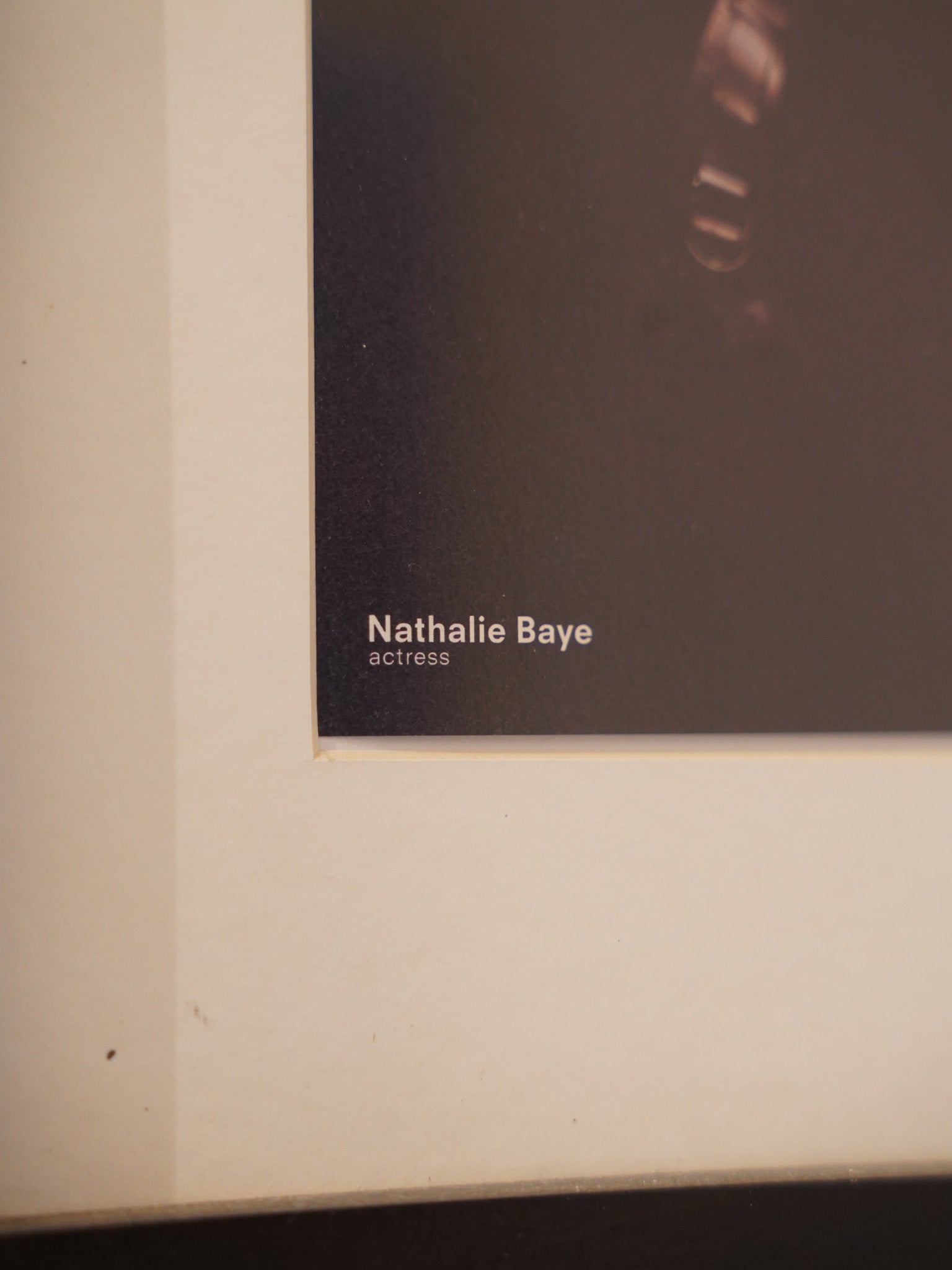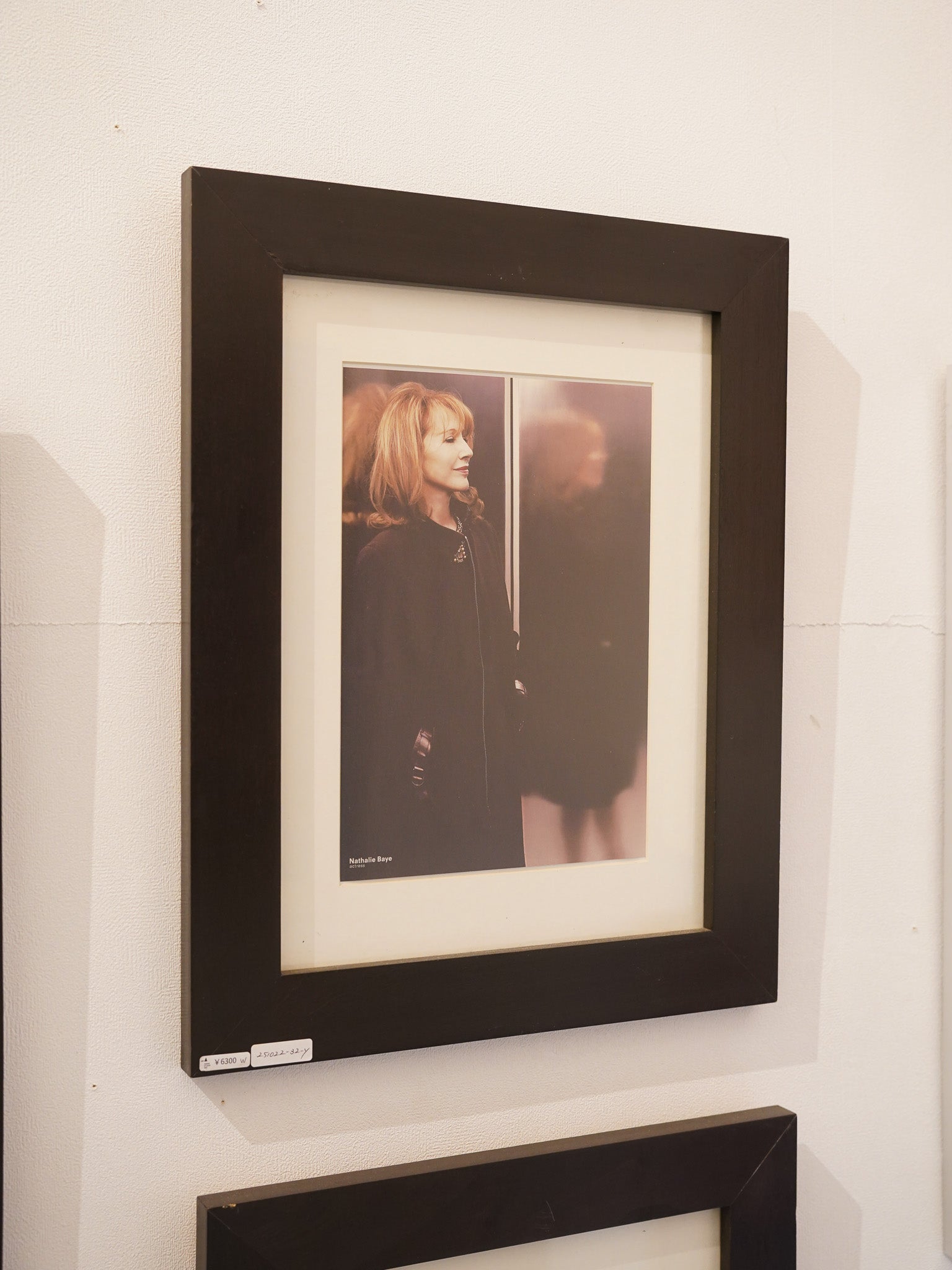 ブラックの木製フレームと、マットな白の台紙が、フランス映画界を代表する女優の持つ洗練された雰囲気を引き立てています。