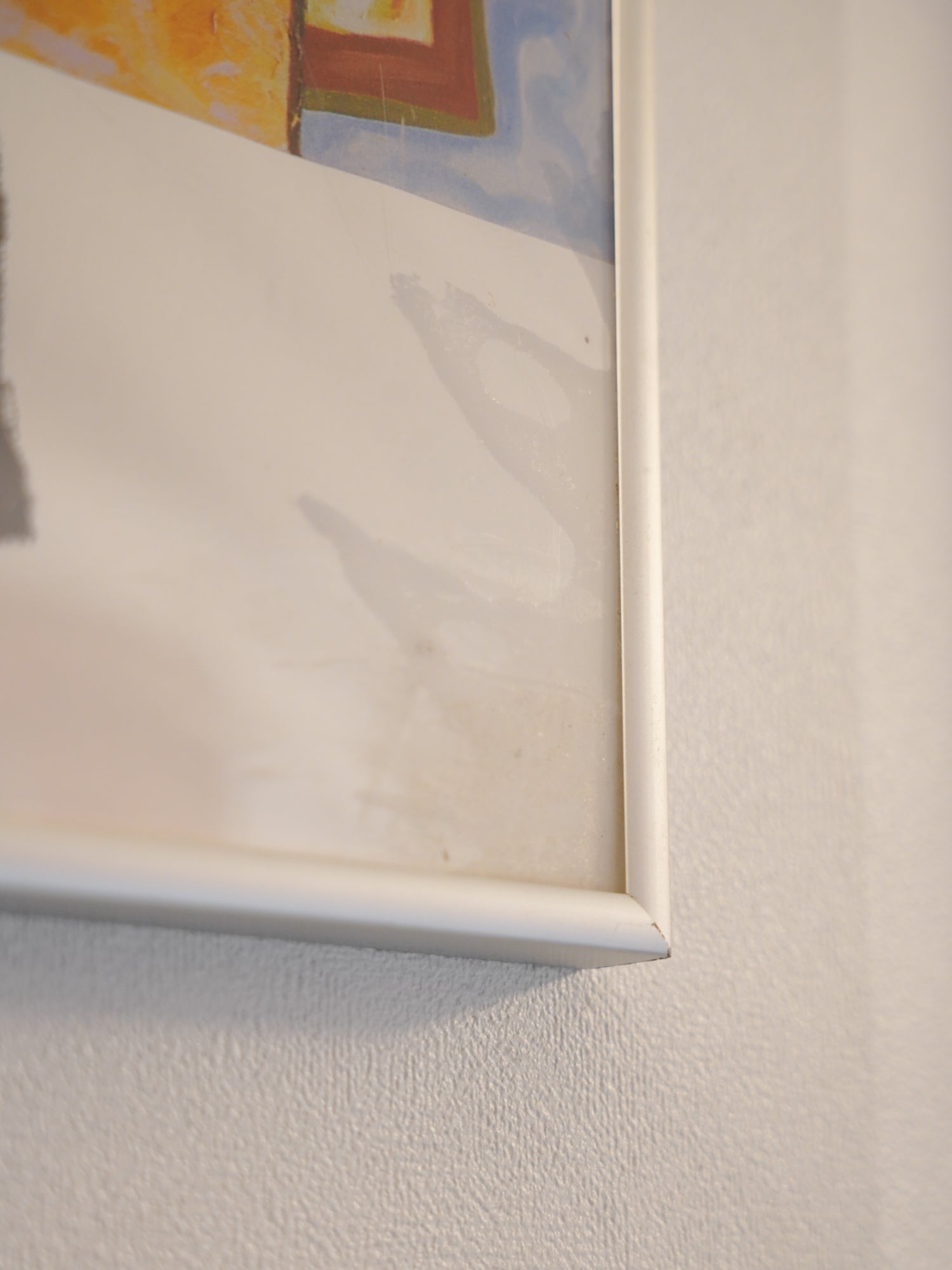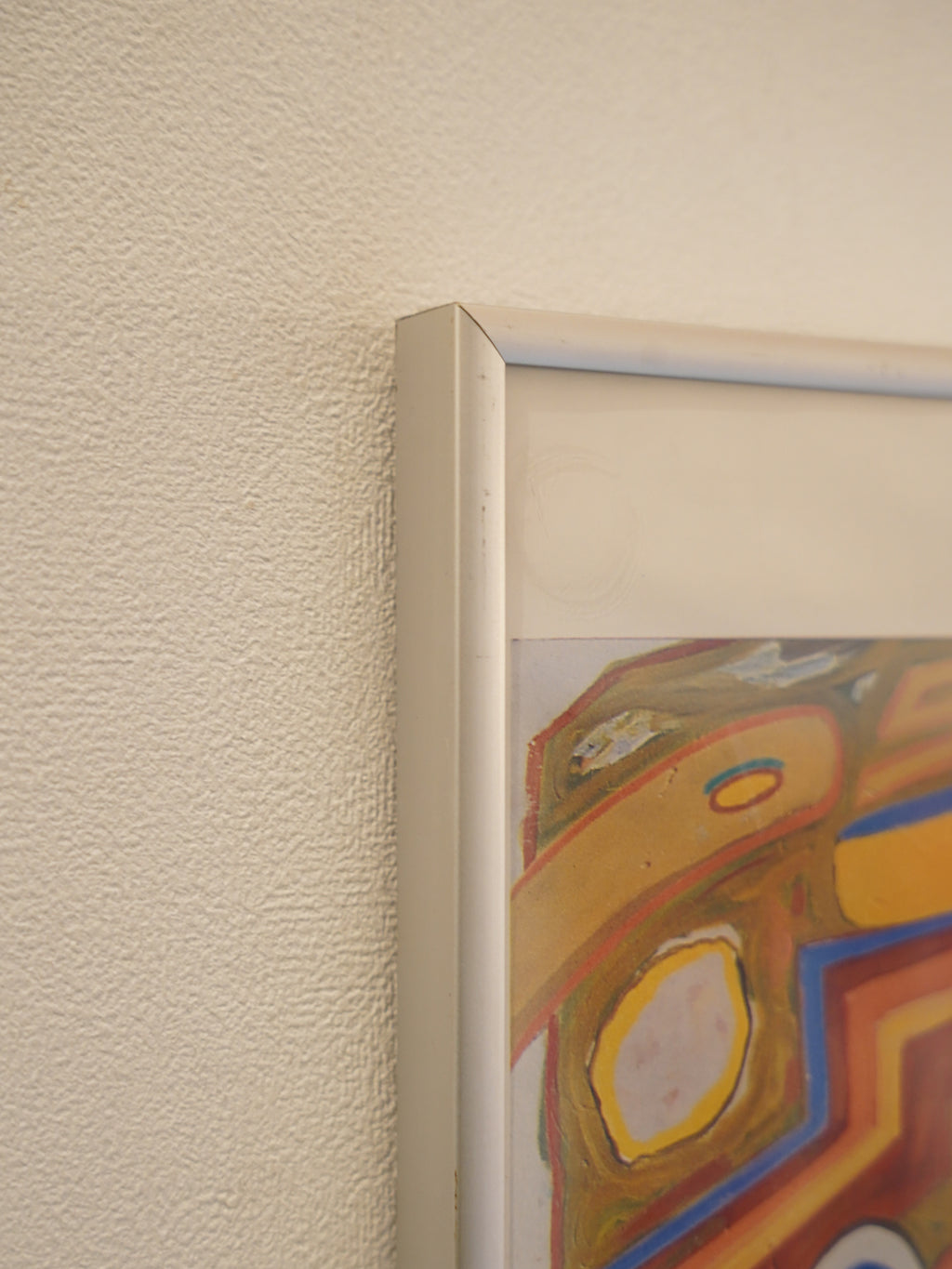 フレームはアルミ製で、作品のモダンな雰囲気を際立たせています。リビングや廊下、または店舗の壁面を華やかに彩る、感性を刺激する一点です。