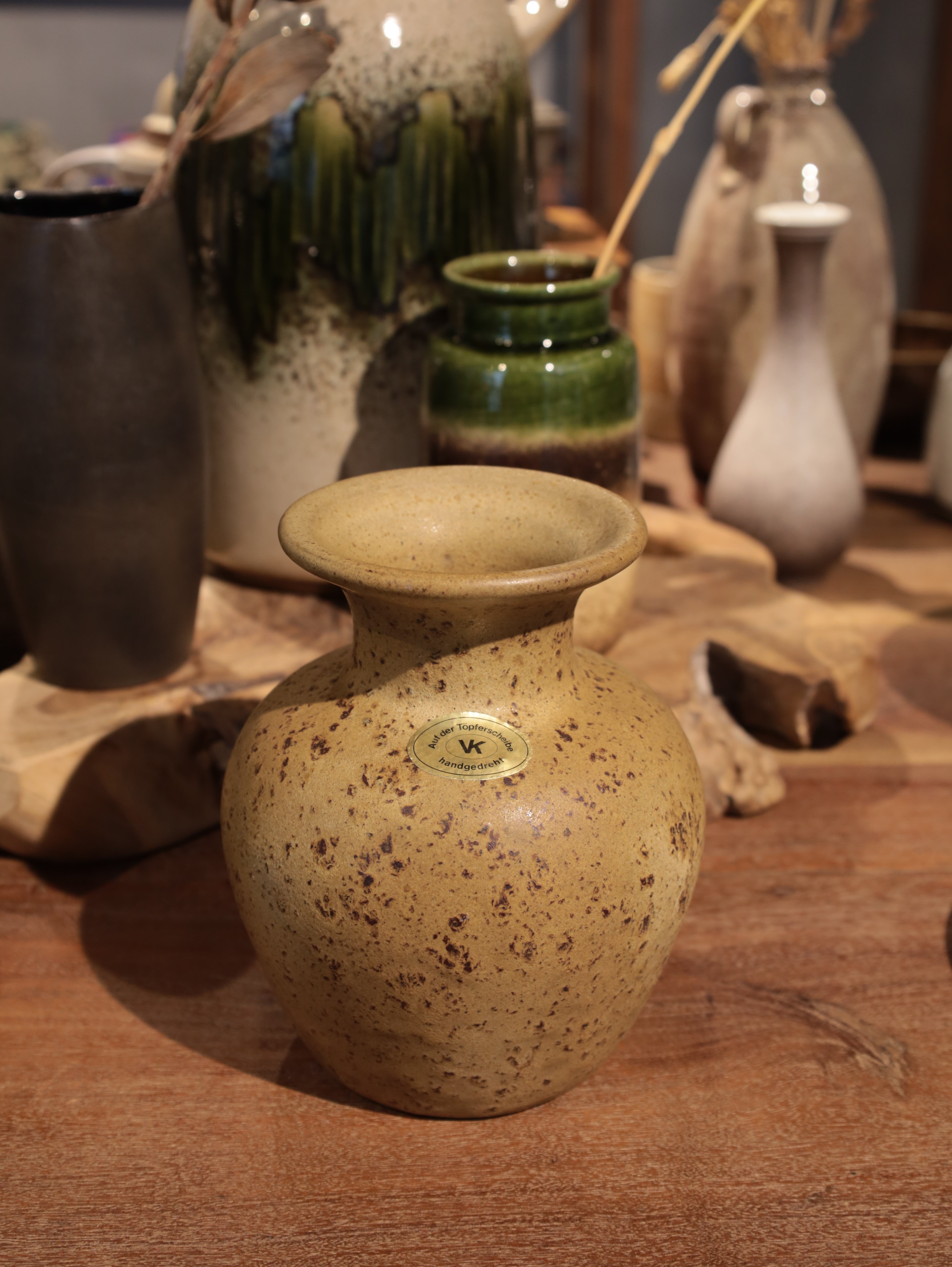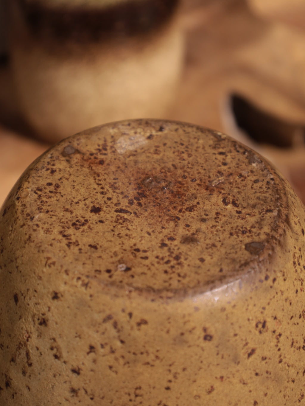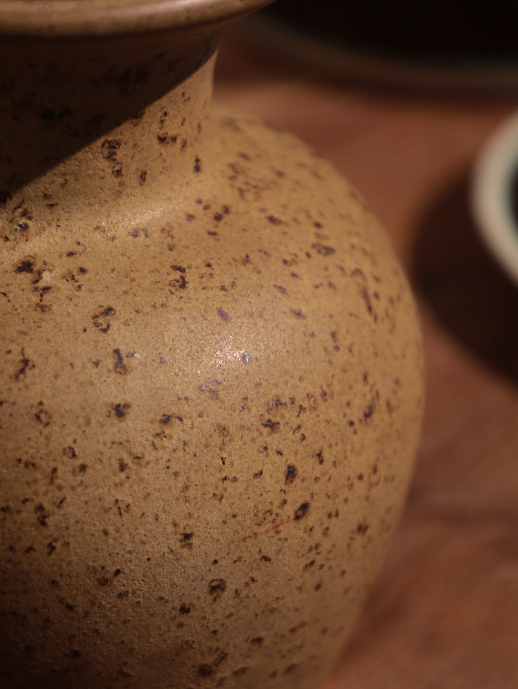 表面全体は、マットな黄土色の釉薬に濃いブラウンの斑点が散りばめられており、土の温もりと力強いテクスチャを感じさせます。