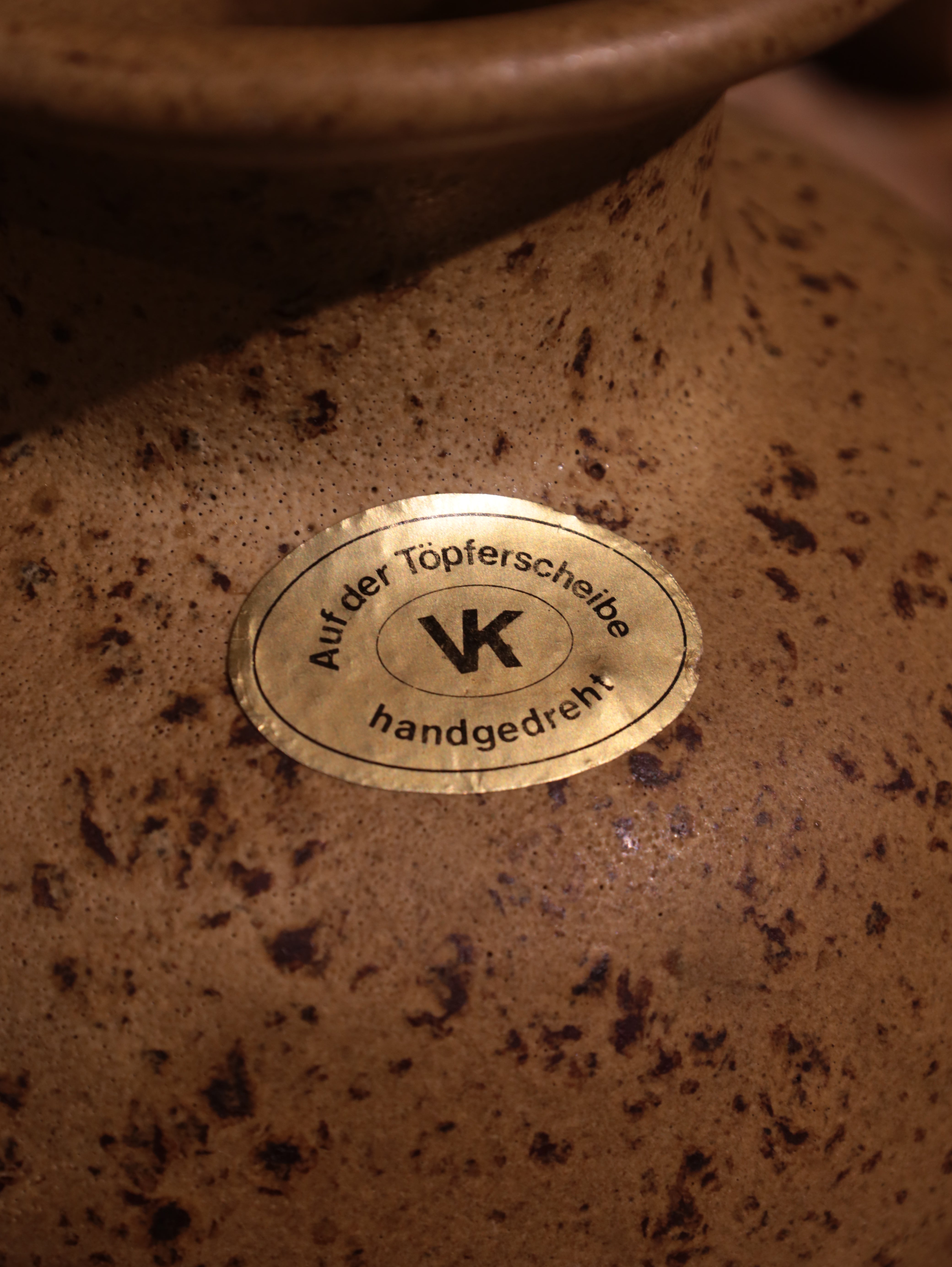 胴体に貼られた金色の楕円形シールには、ドイツ語で「Auf der Töpferscheibe handgedreht」と記されています。これは、本作品が機械的な大量生産品ではなく、熟練の陶芸家によって一つ一つ手作業で成形されたことを証明する、極めて重要なマークです。