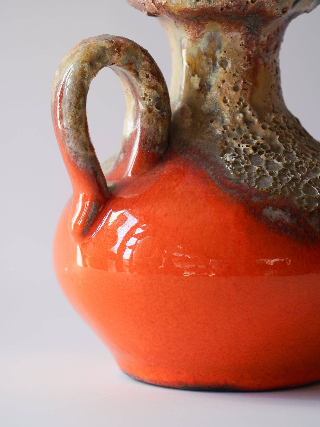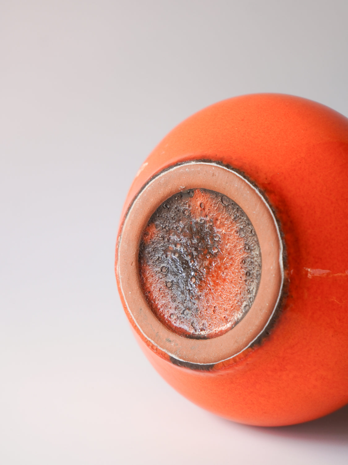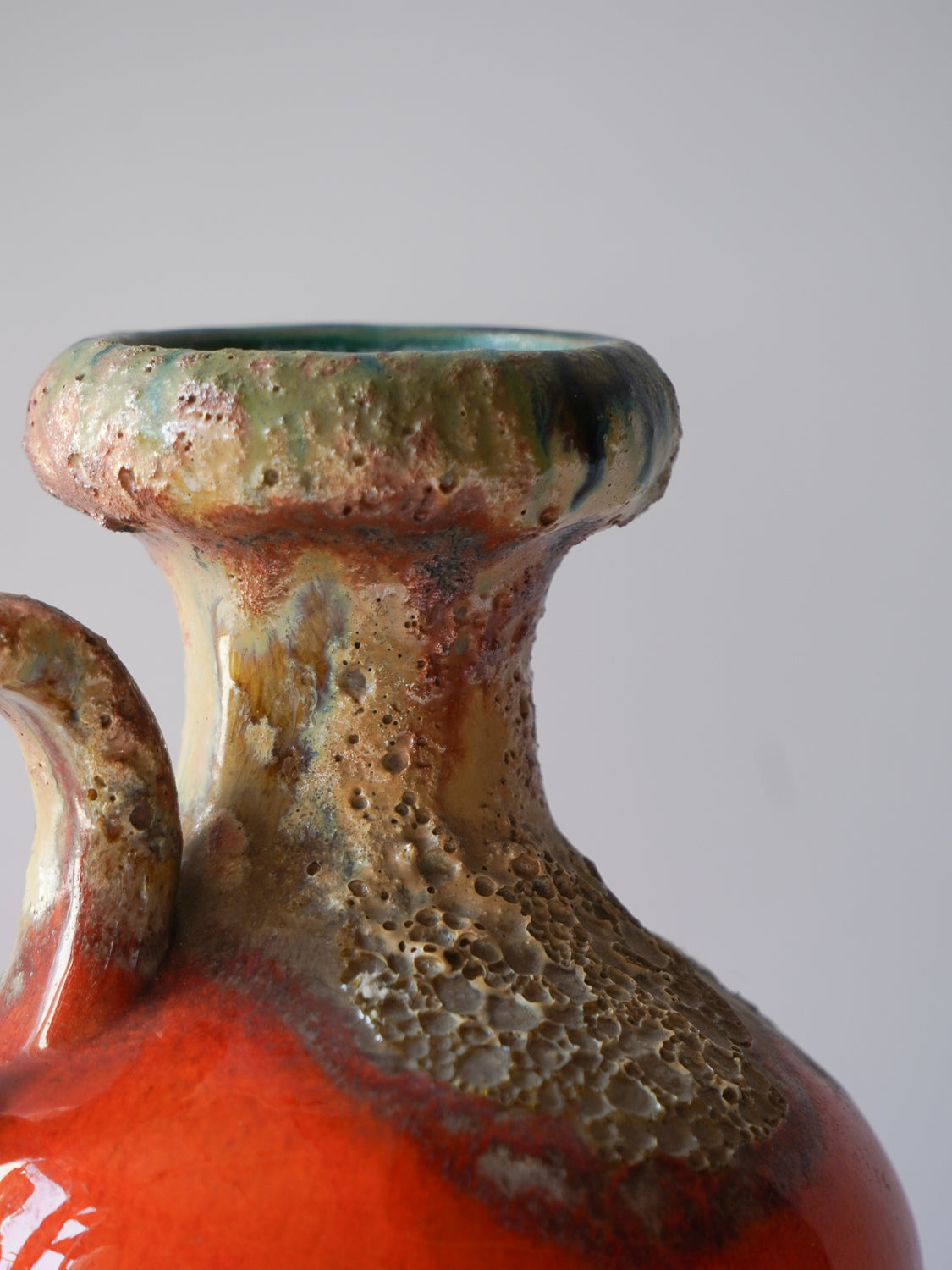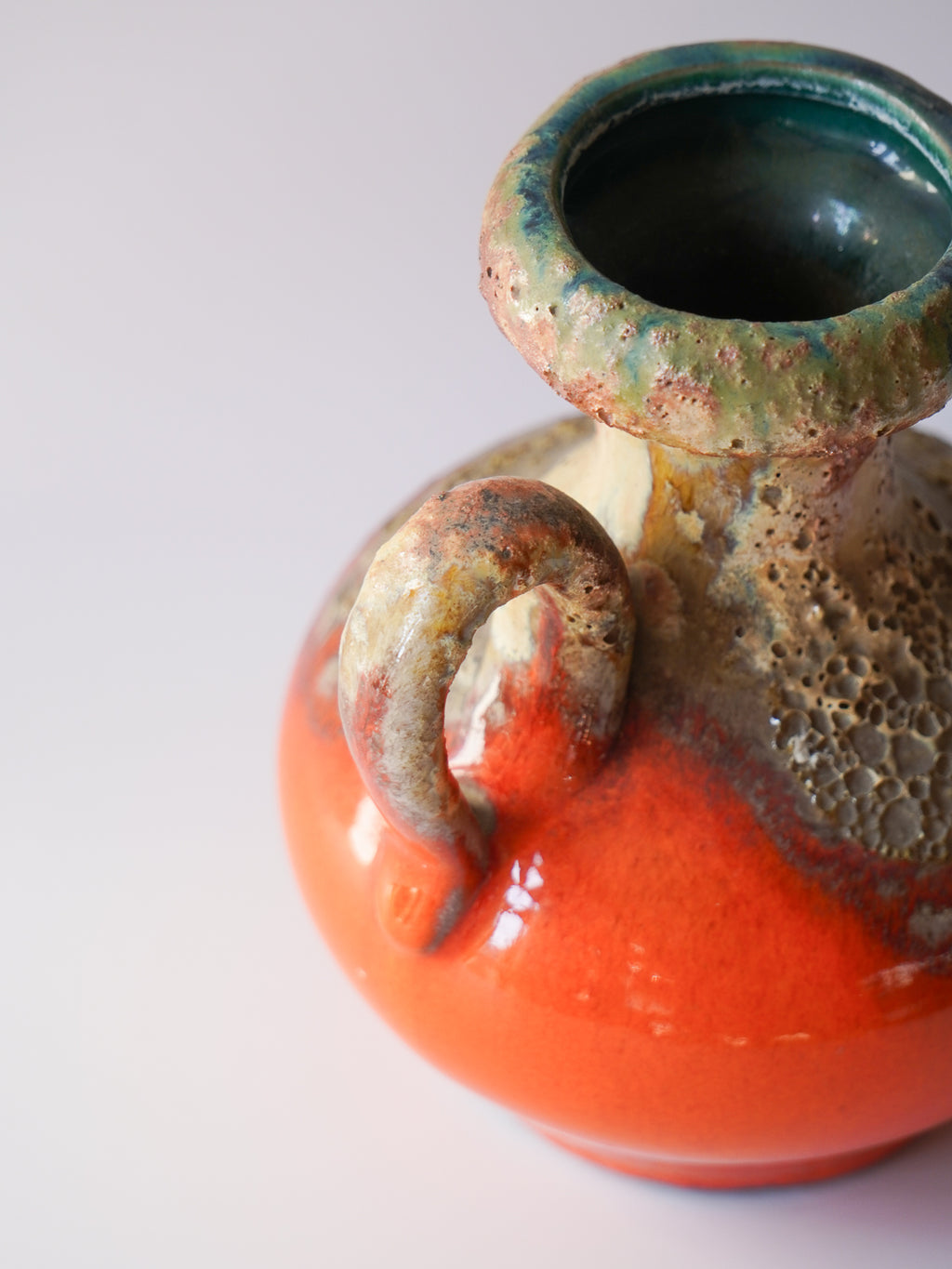 艶やかな鮮烈なオレンジ色のグロス釉薬と、その上部に流れ落ちるような粗いFat Lava釉薬のコントラストがドラマチックなフラワーベースです。