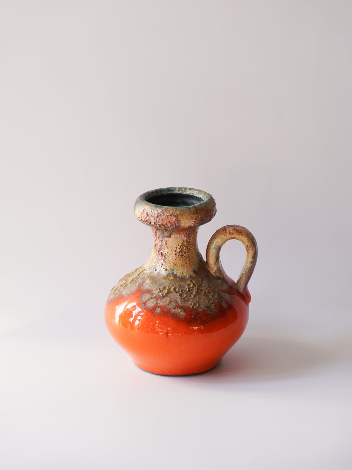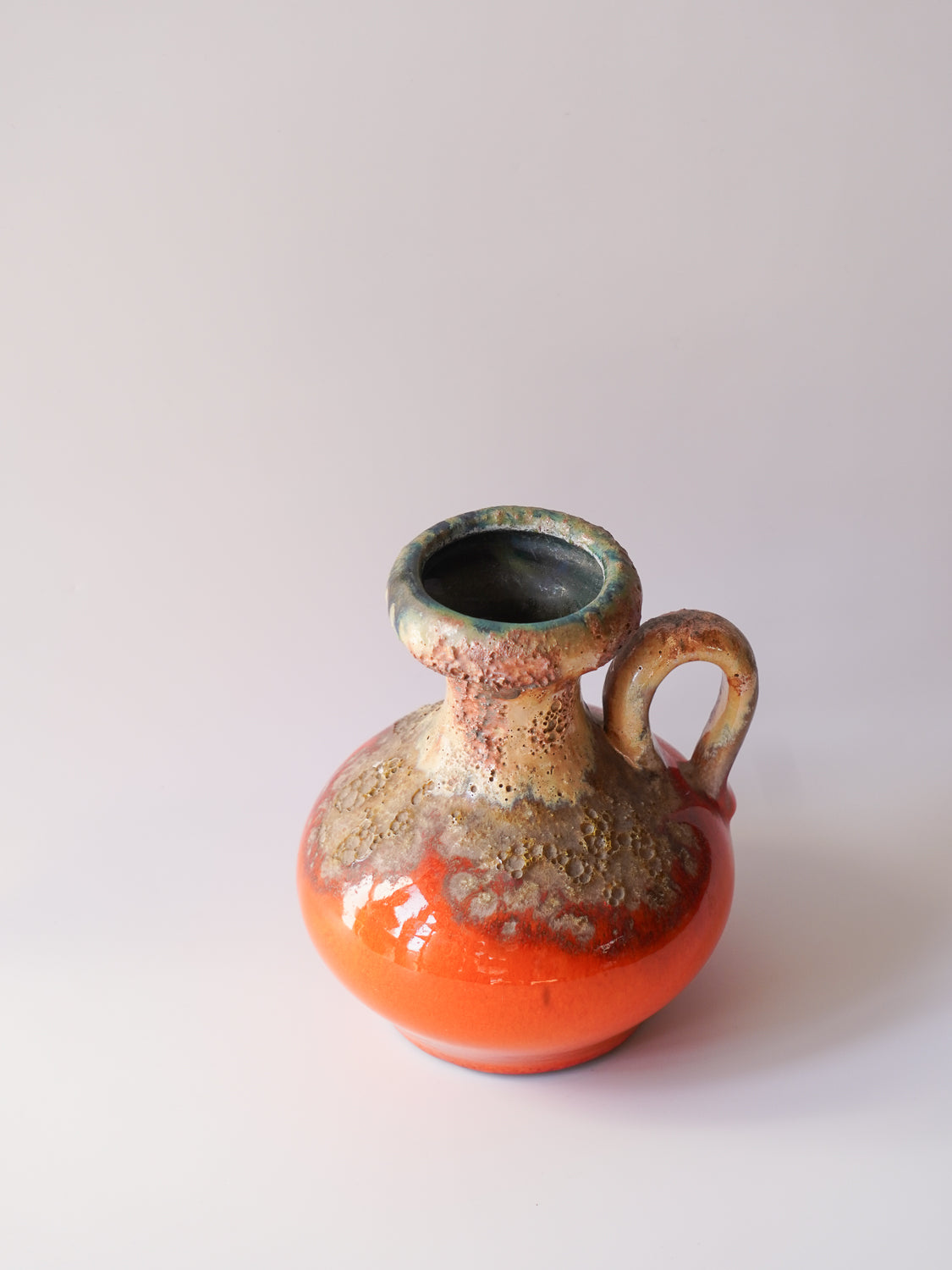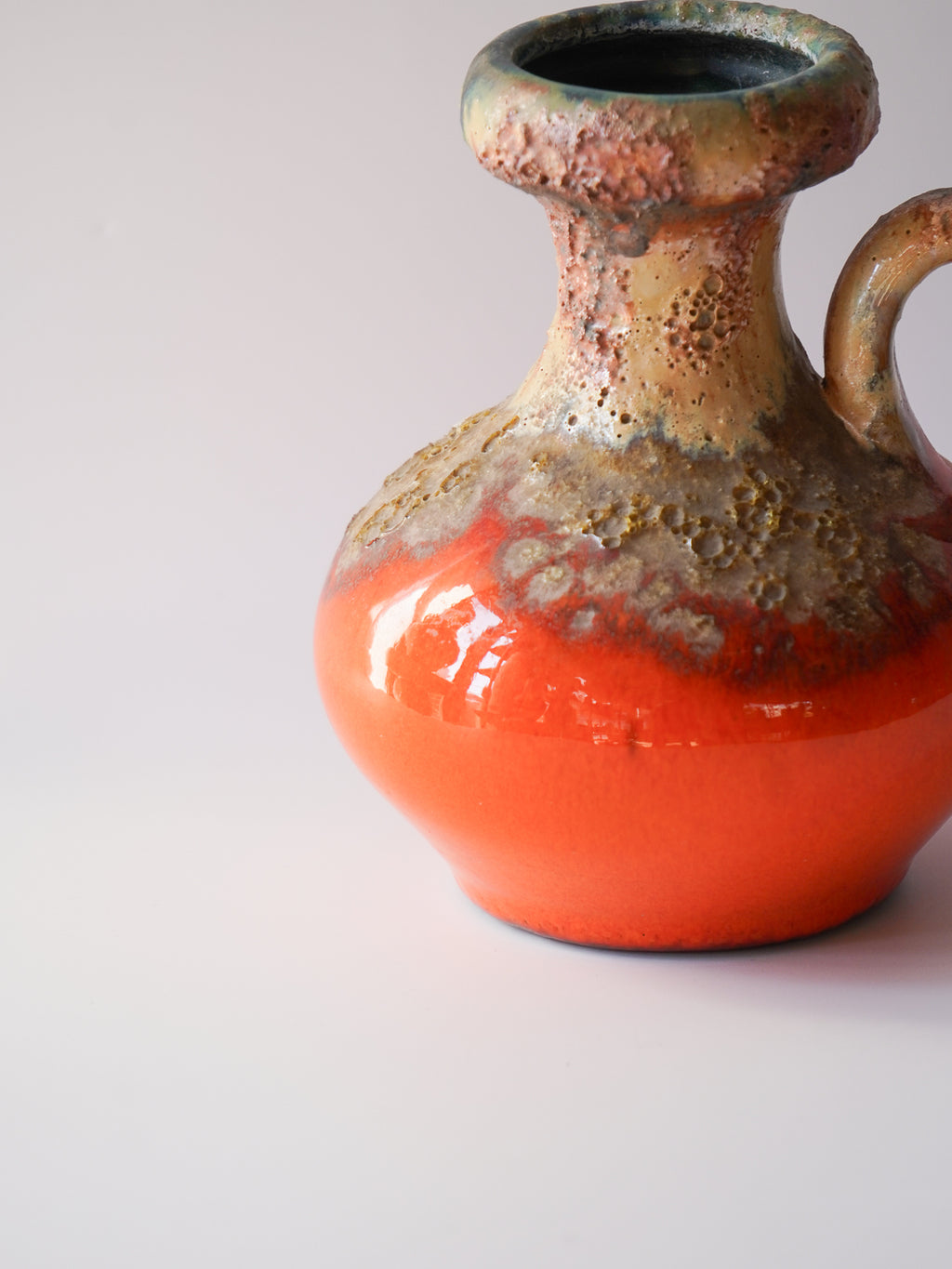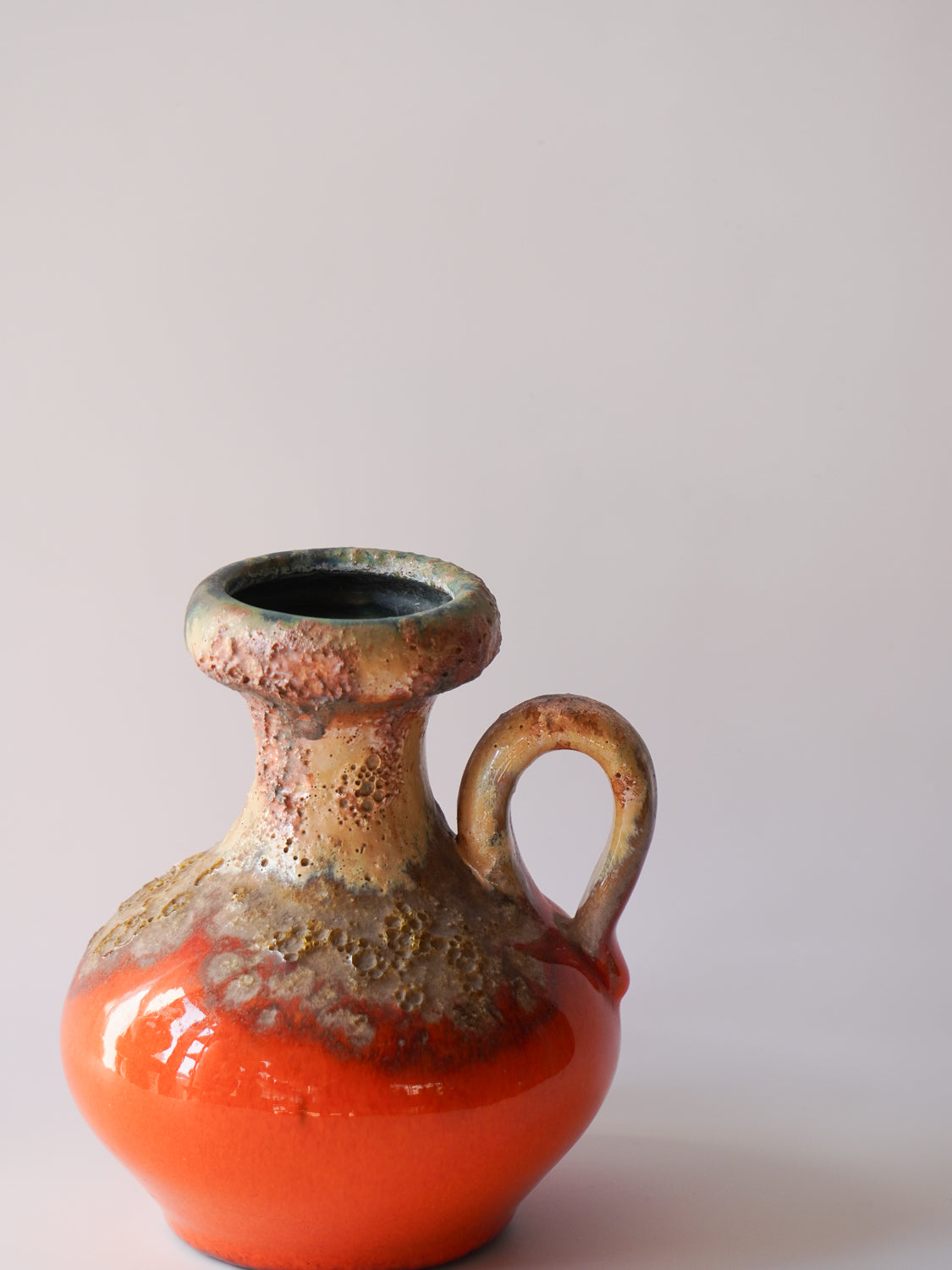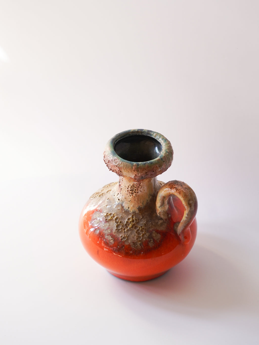 艶やかな鮮烈なオレンジ色のグロス釉薬と、その上部に流れ落ちるような粗いFat Lava釉薬のコントラストがドラマチックなフラワーベースです。