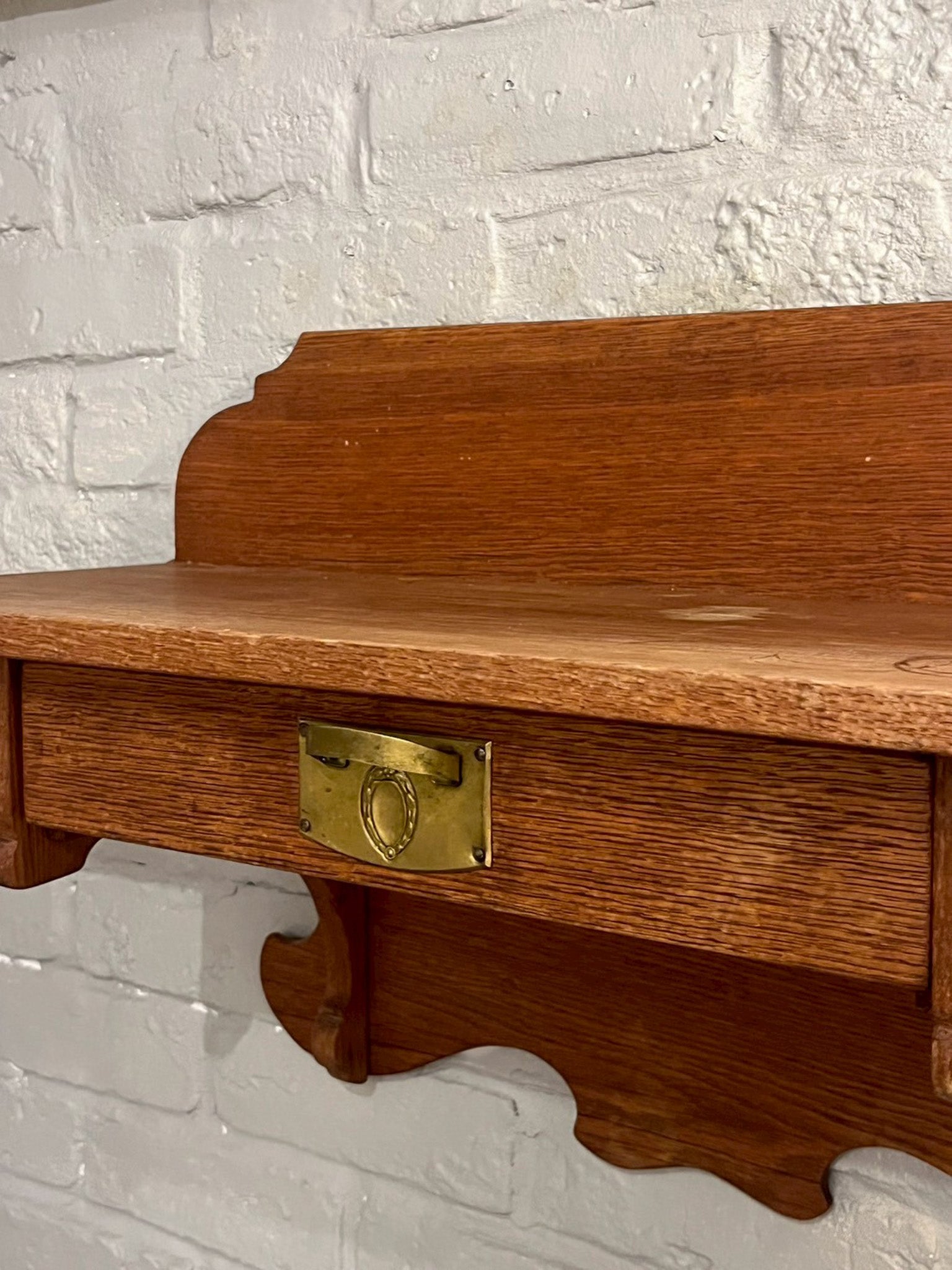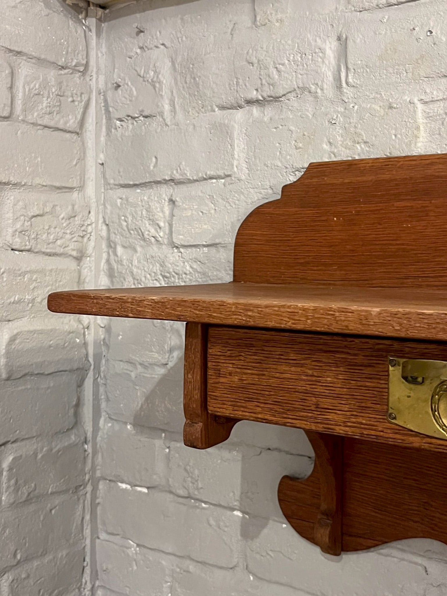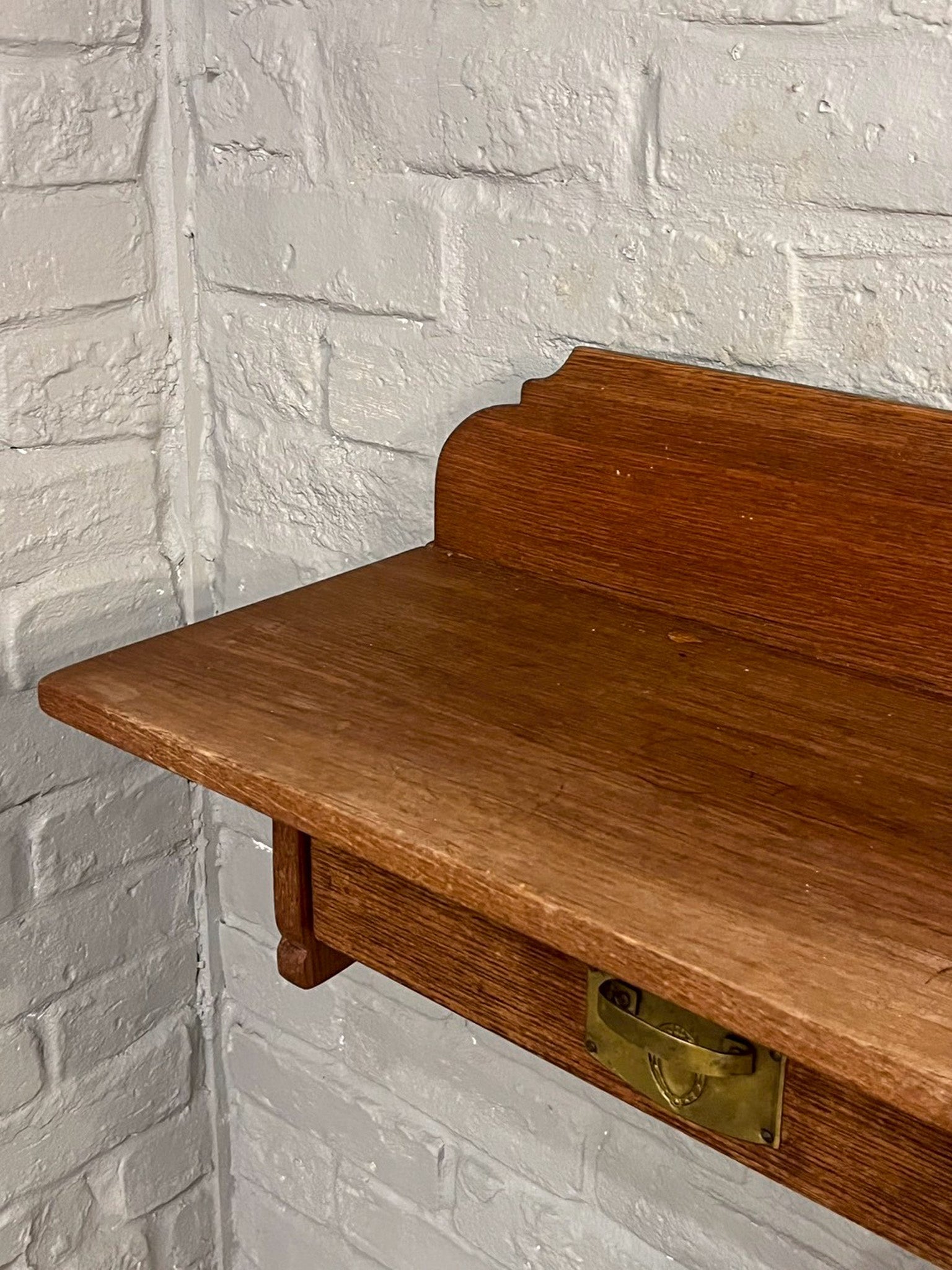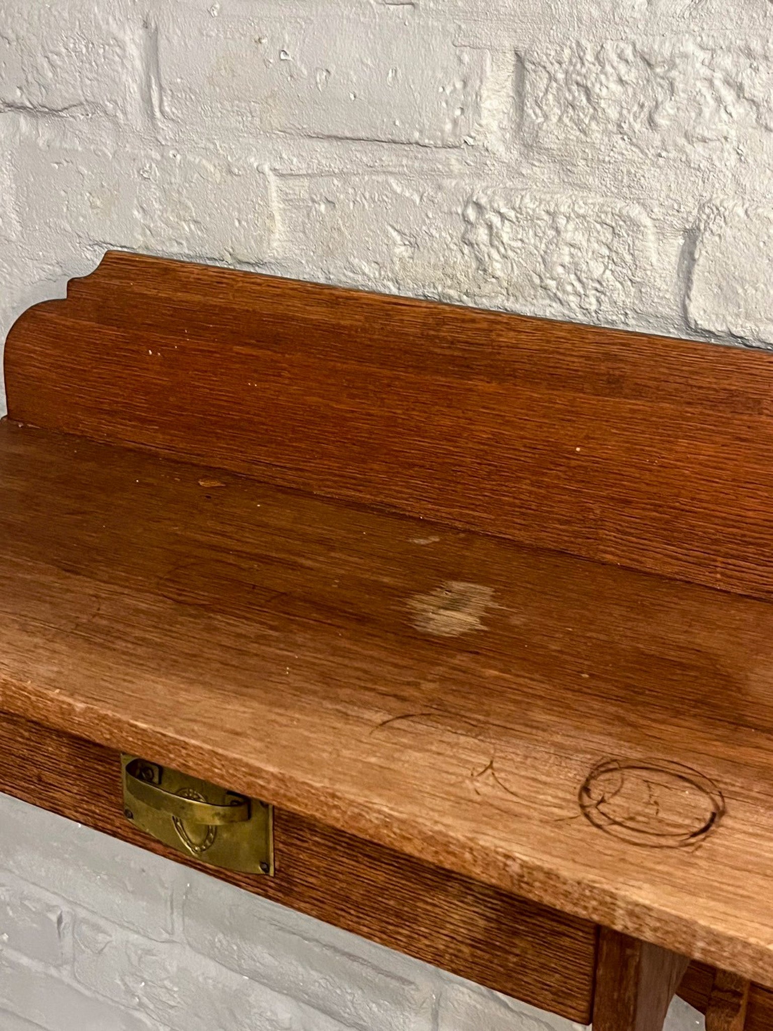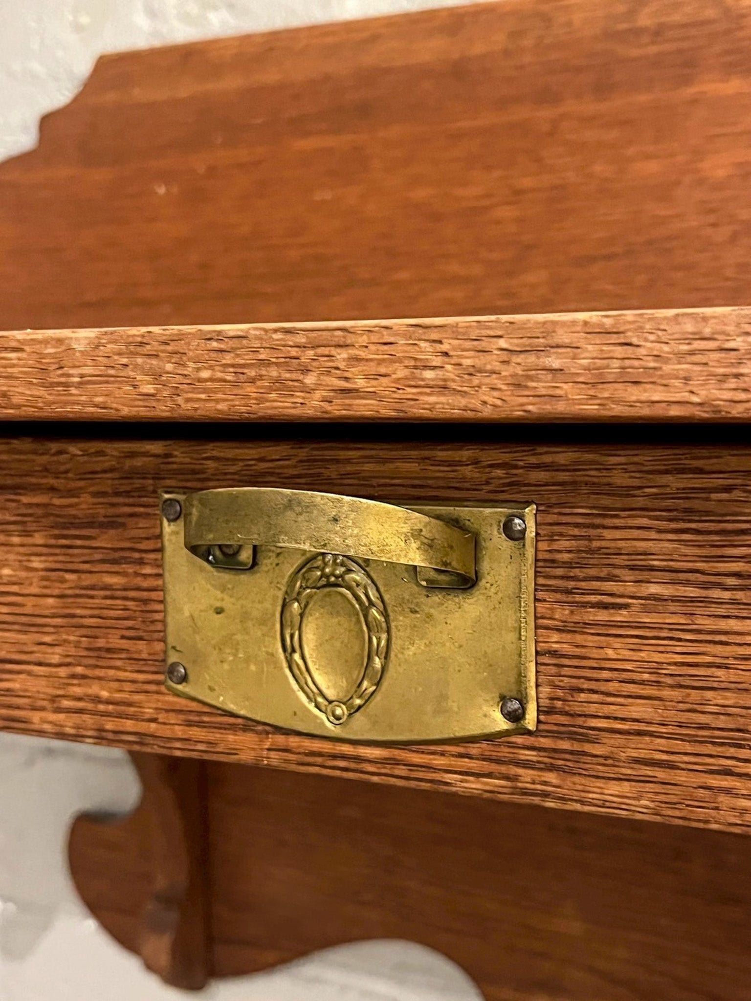 中央に配された小引き出しには、経年変化によって独特の風合いを増した真鍮製のハンドルがあしらわれ、重厚な木肌の中で上品な輝きを放つデザインのアクセントとなっています。