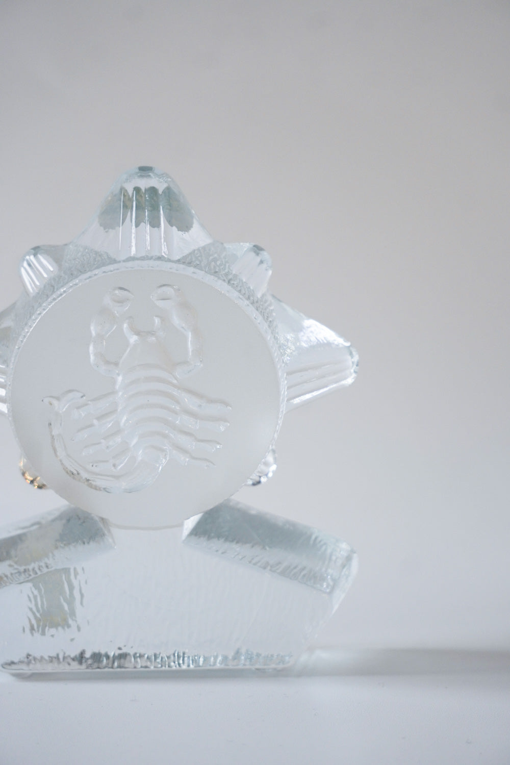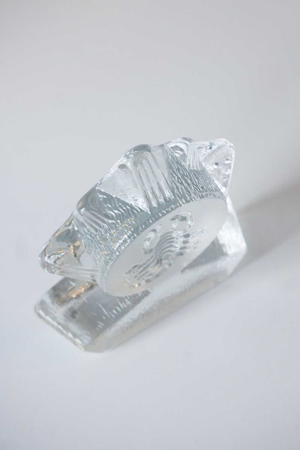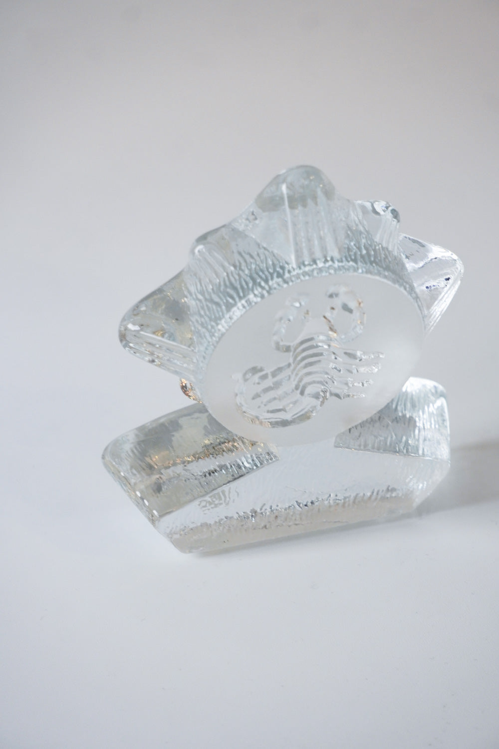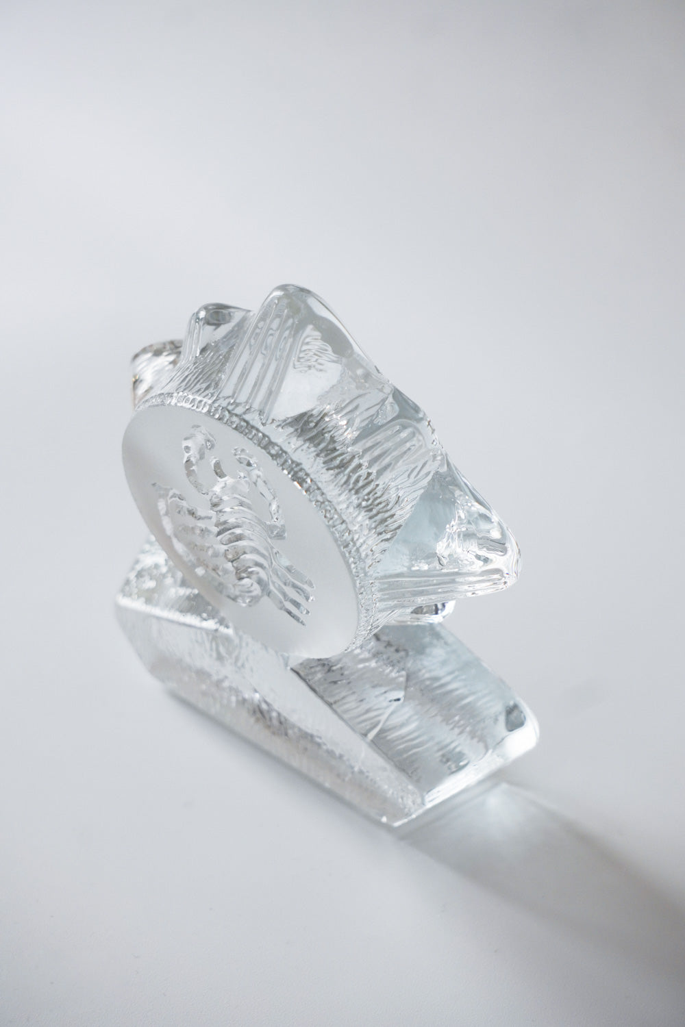サソリをモチーフにしており、星座シリーズのオブジェです。厚みのあるクリアガラスでできており、表面にはゴツゴツとした氷のような、あるいは荒々しい岩のようなテクスチャが施されています。