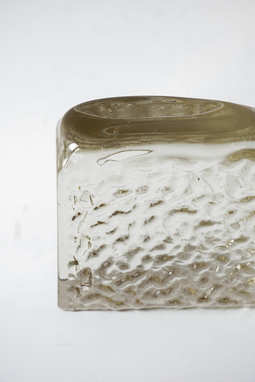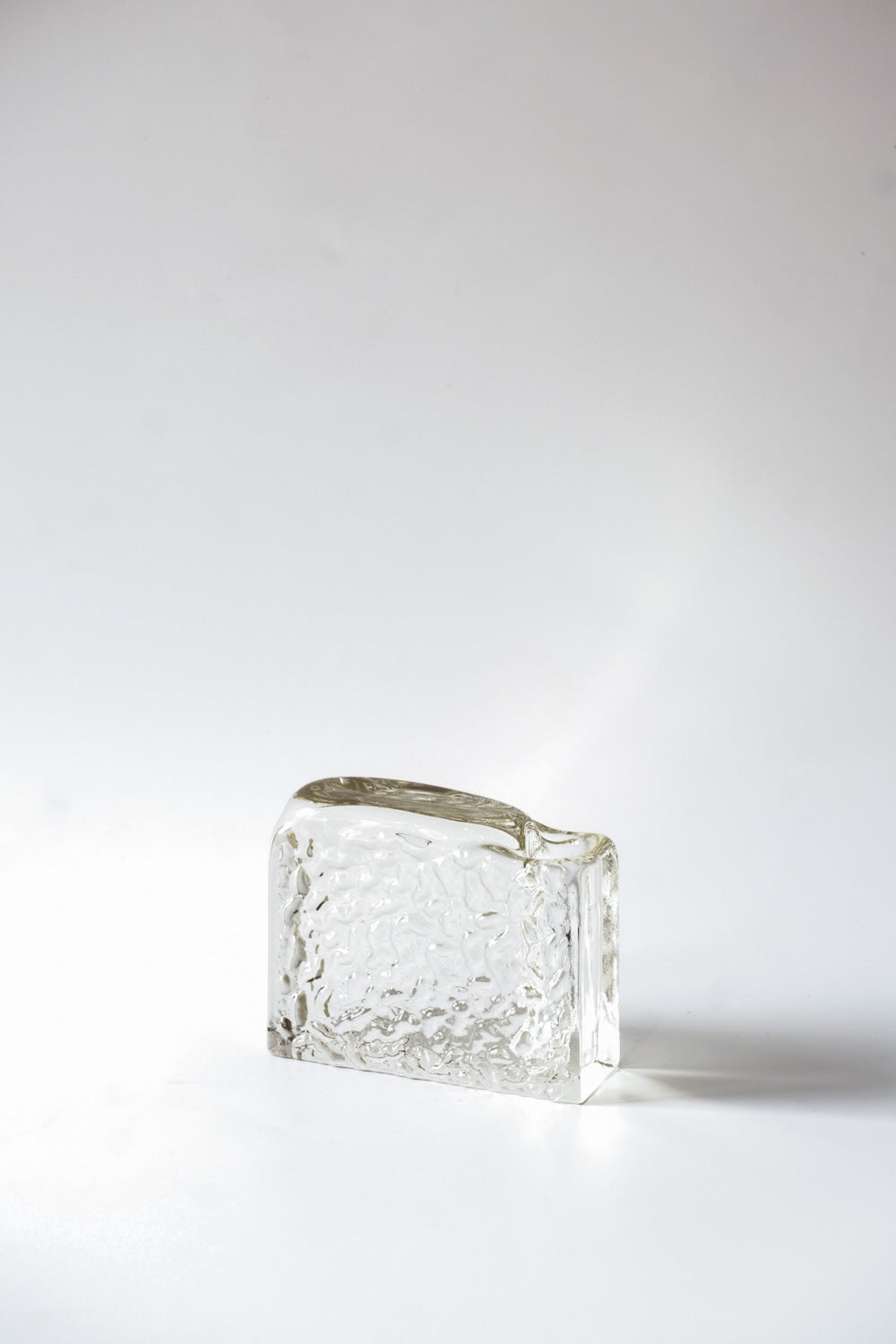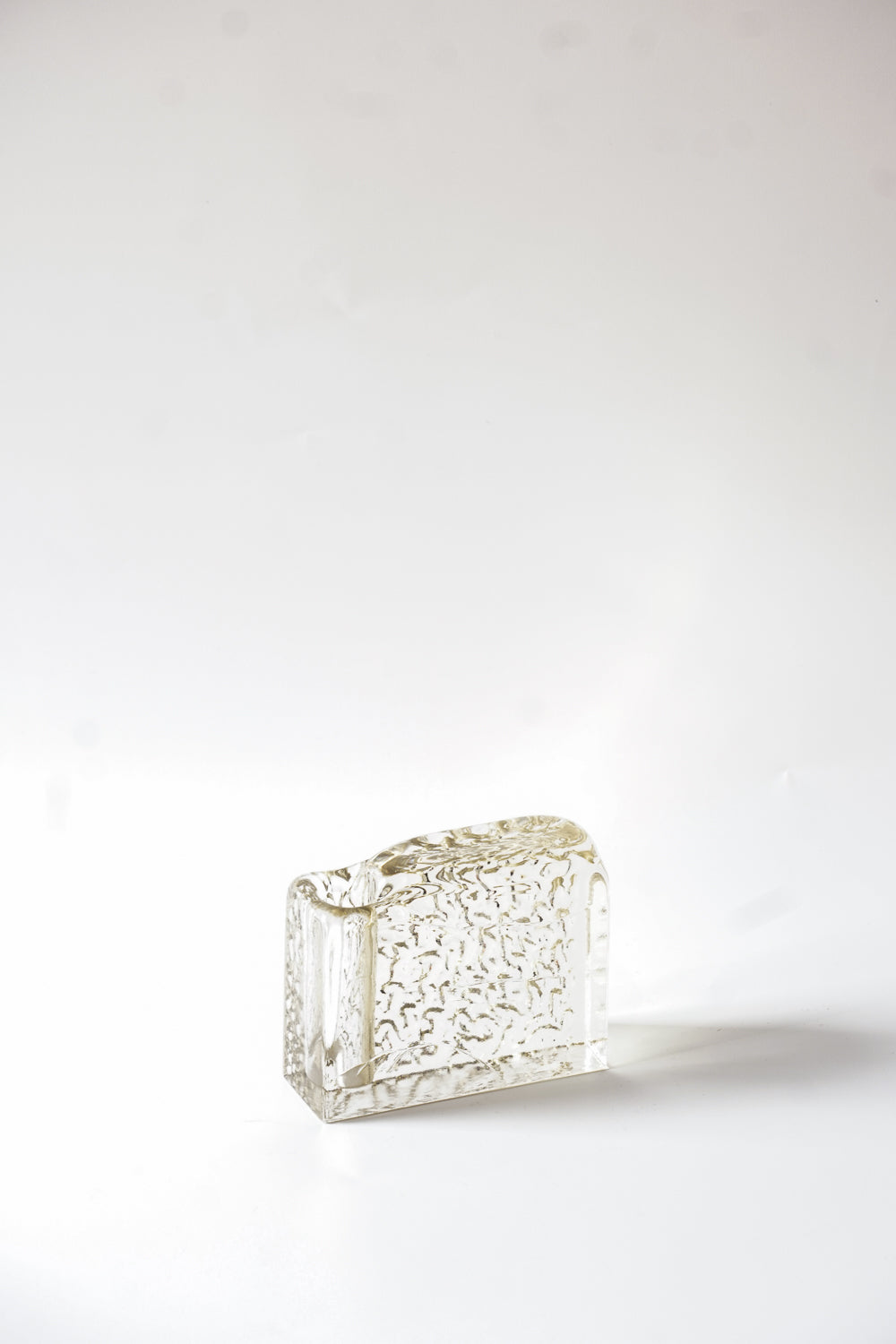 重厚なクリアガラスが持つ揺らぎと、ハンドクラフトを思わせる有機的なフォルムは、現代的な空間にも、クラシックなインテリアにもしっくりと馴染みます。
