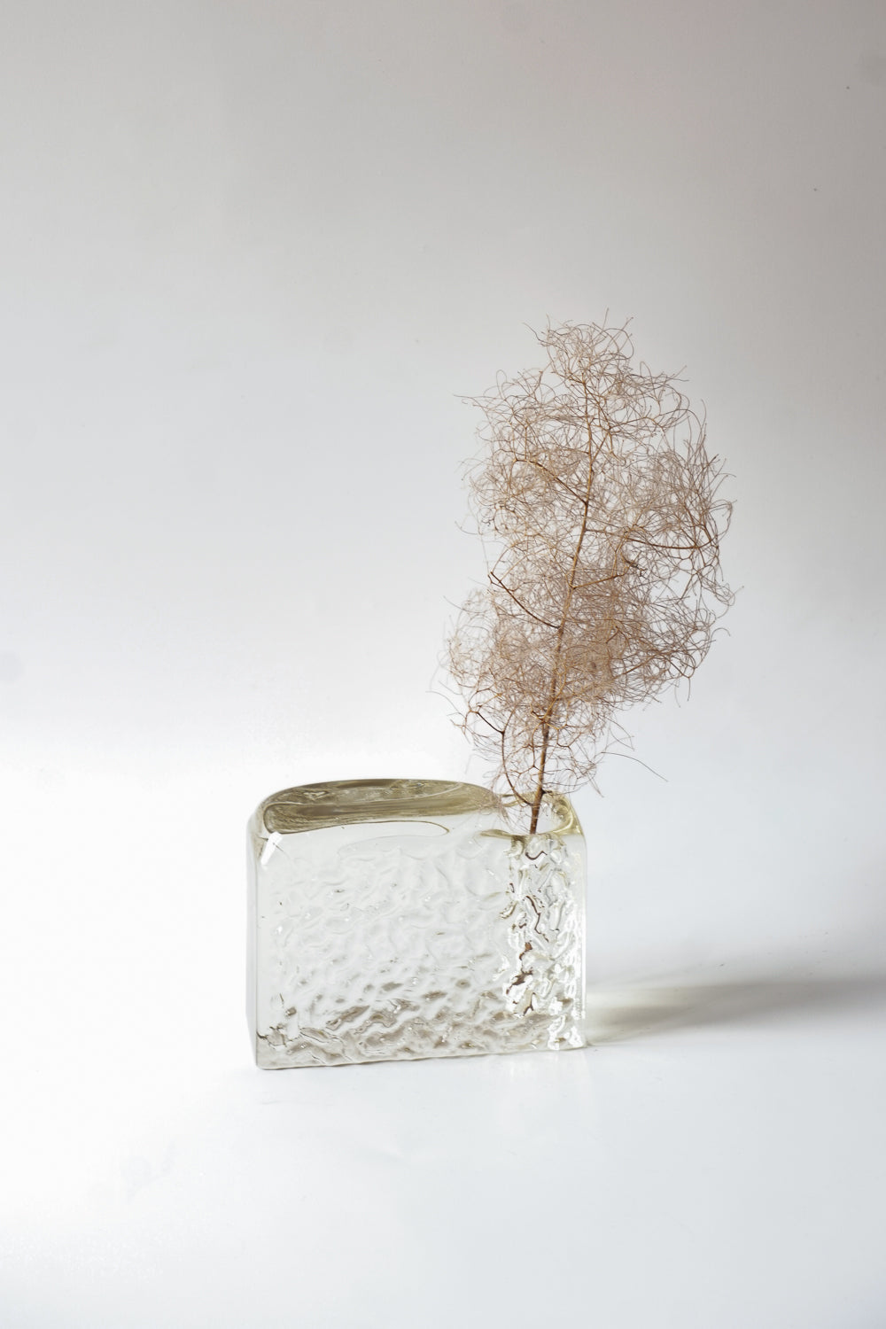 単体でオブジェとして置いても存在感を放ちますが、小さな花や枝物を活けることで、ガラスの透明感と生命のコントラストが際立ちます。日々の暮らしに、上質な光とアートなアクセントを添えてみませんか。