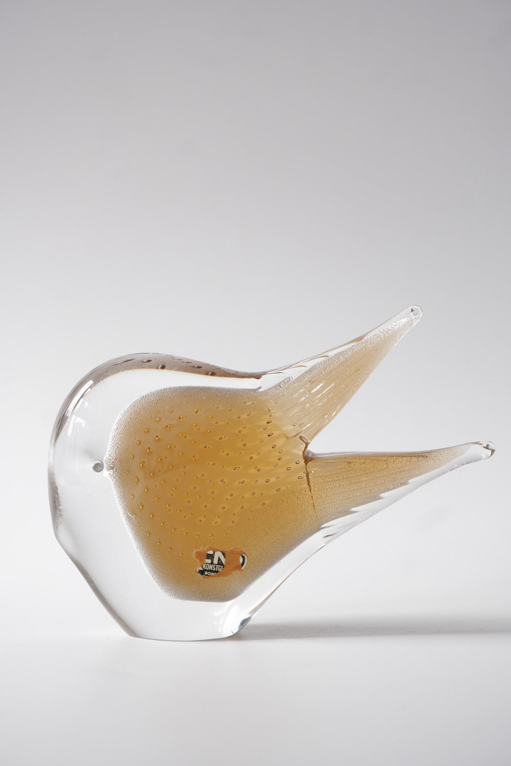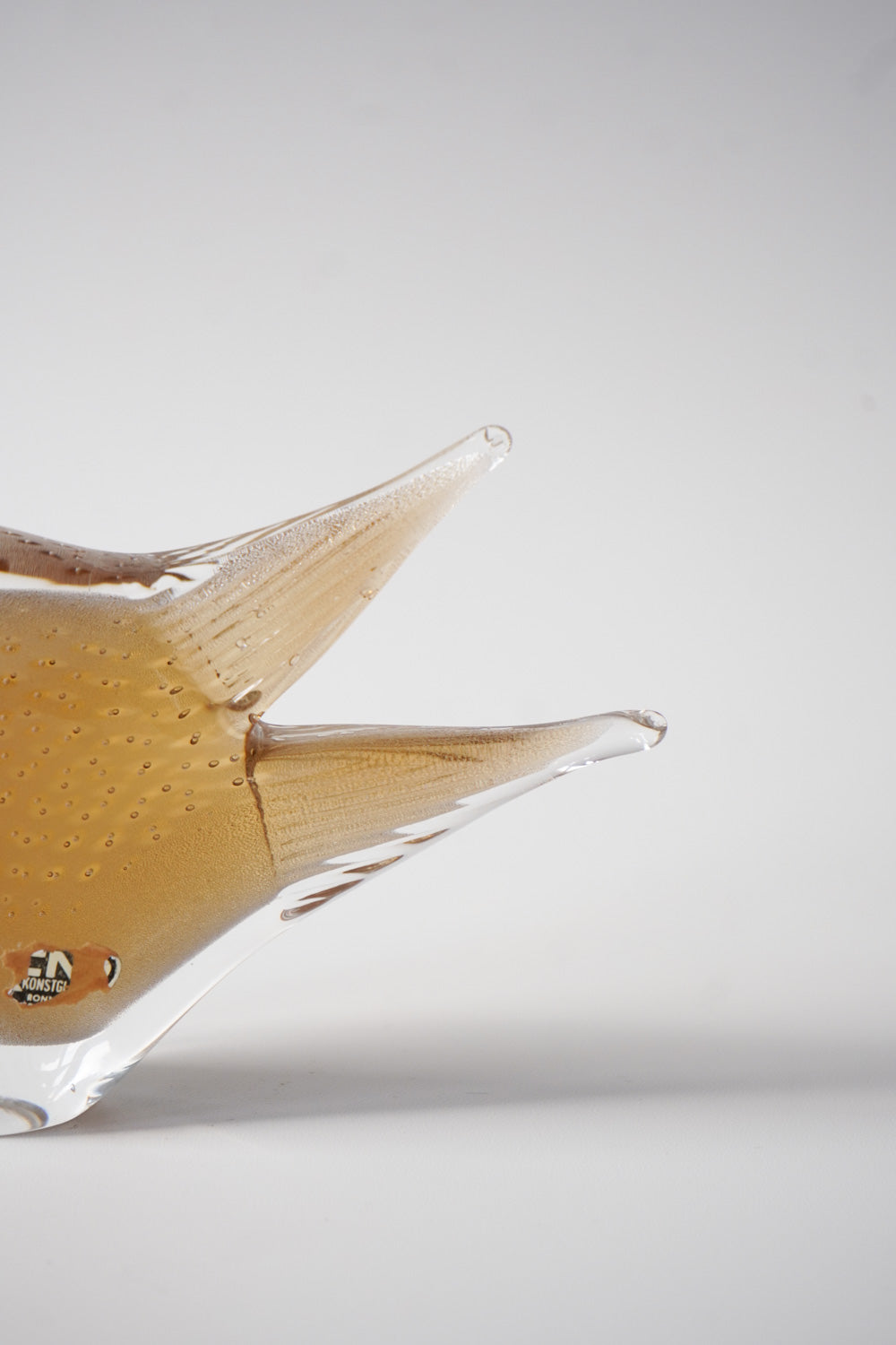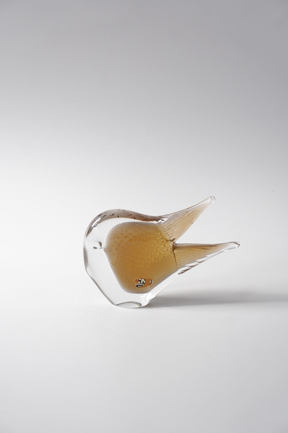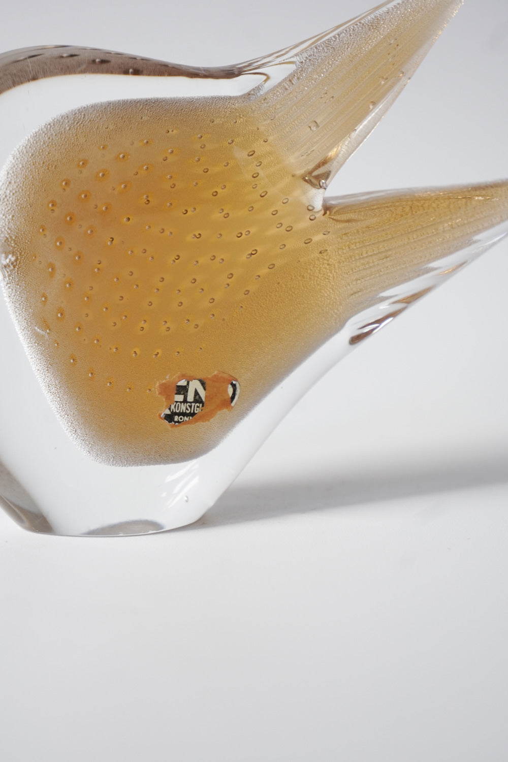 シャープに伸びた二股の尾びれで、モダンで抽象的な印象を与えます。光を浴びると、クリアガラスの部分は輝きを放ち、内側の金色と気泡がキラキラと反射し、お部屋に優しい彩りをもたらします。
