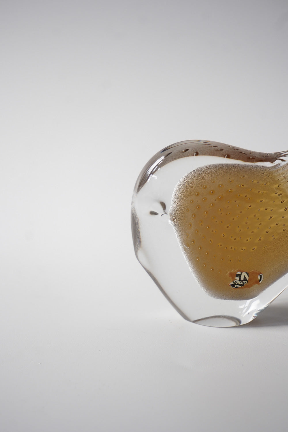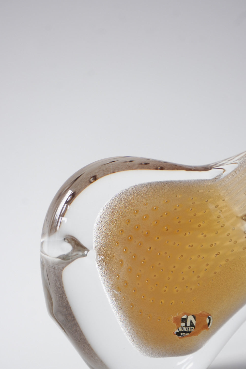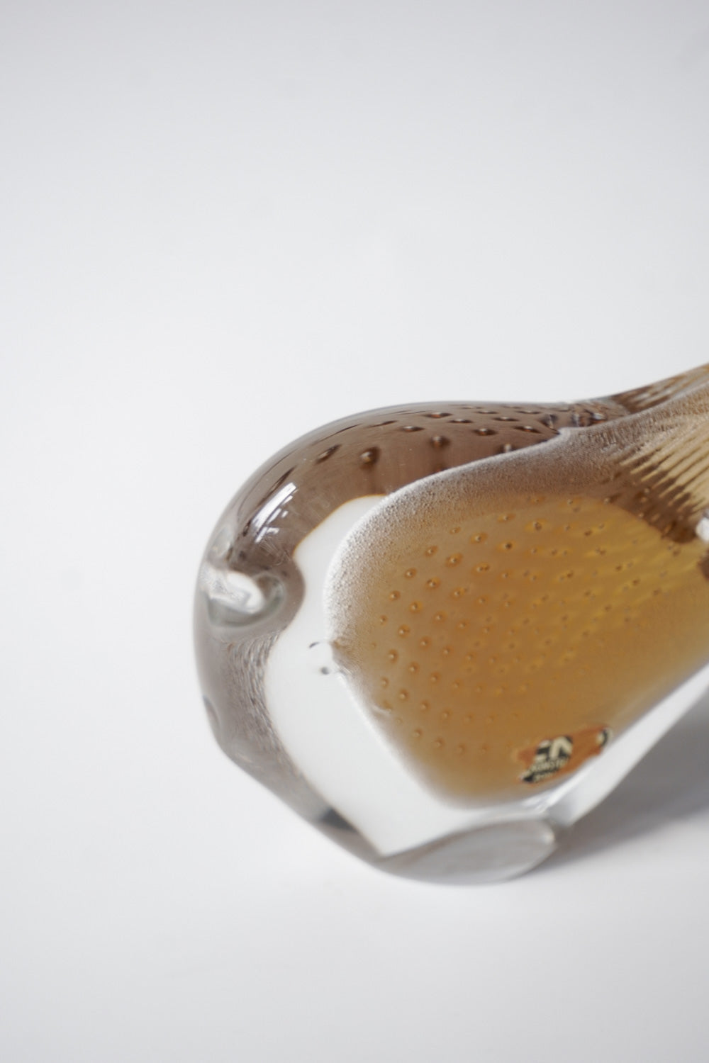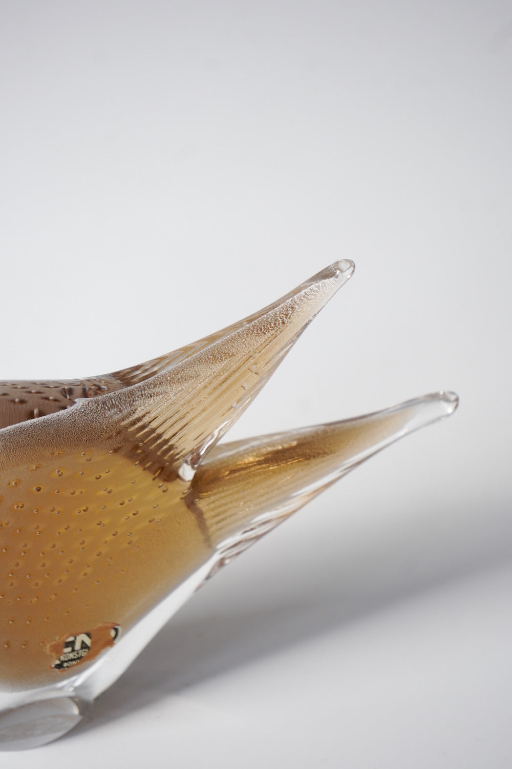 シャープに伸びた二股の尾びれで、モダンで抽象的な印象を与えます。光を浴びると、クリアガラスの部分は輝きを放ち、内側の金色と気泡がキラキラと反射し、お部屋に優しい彩りをもたらします。