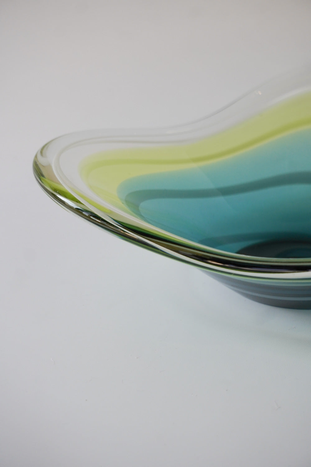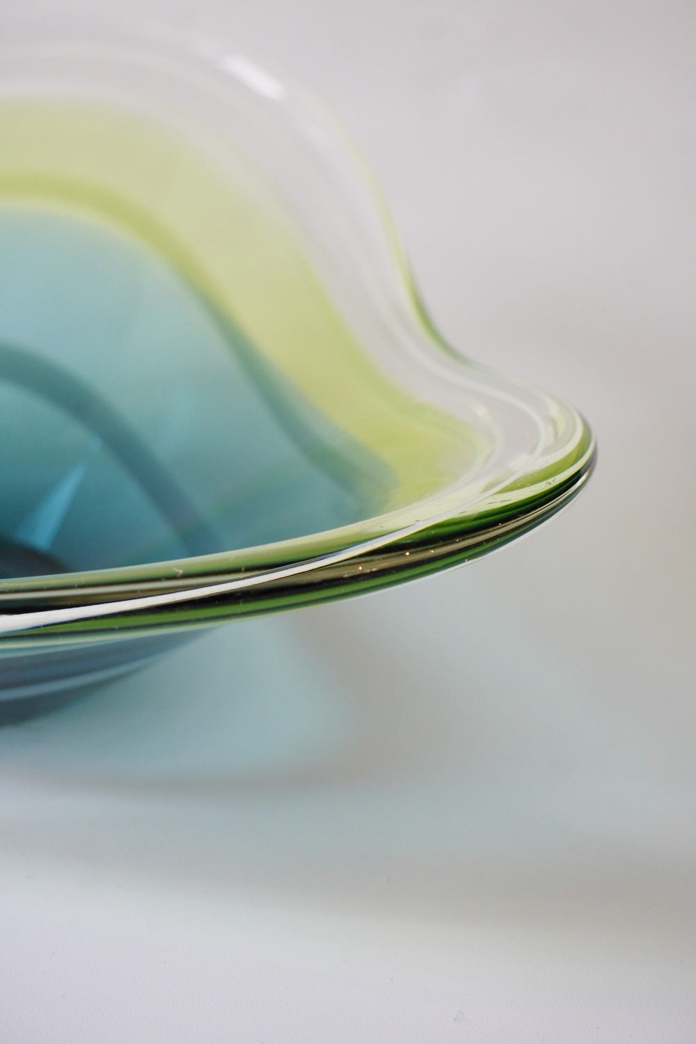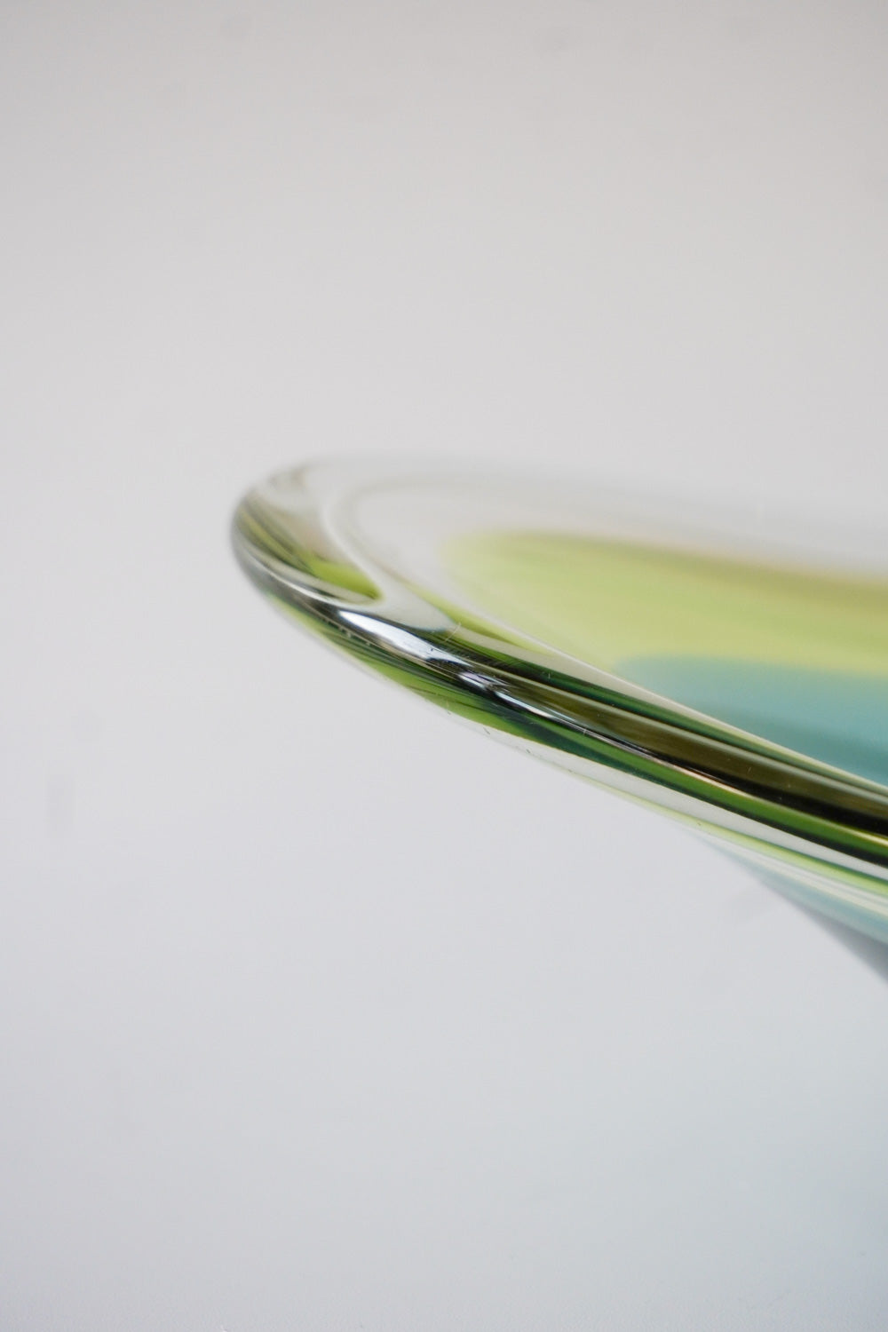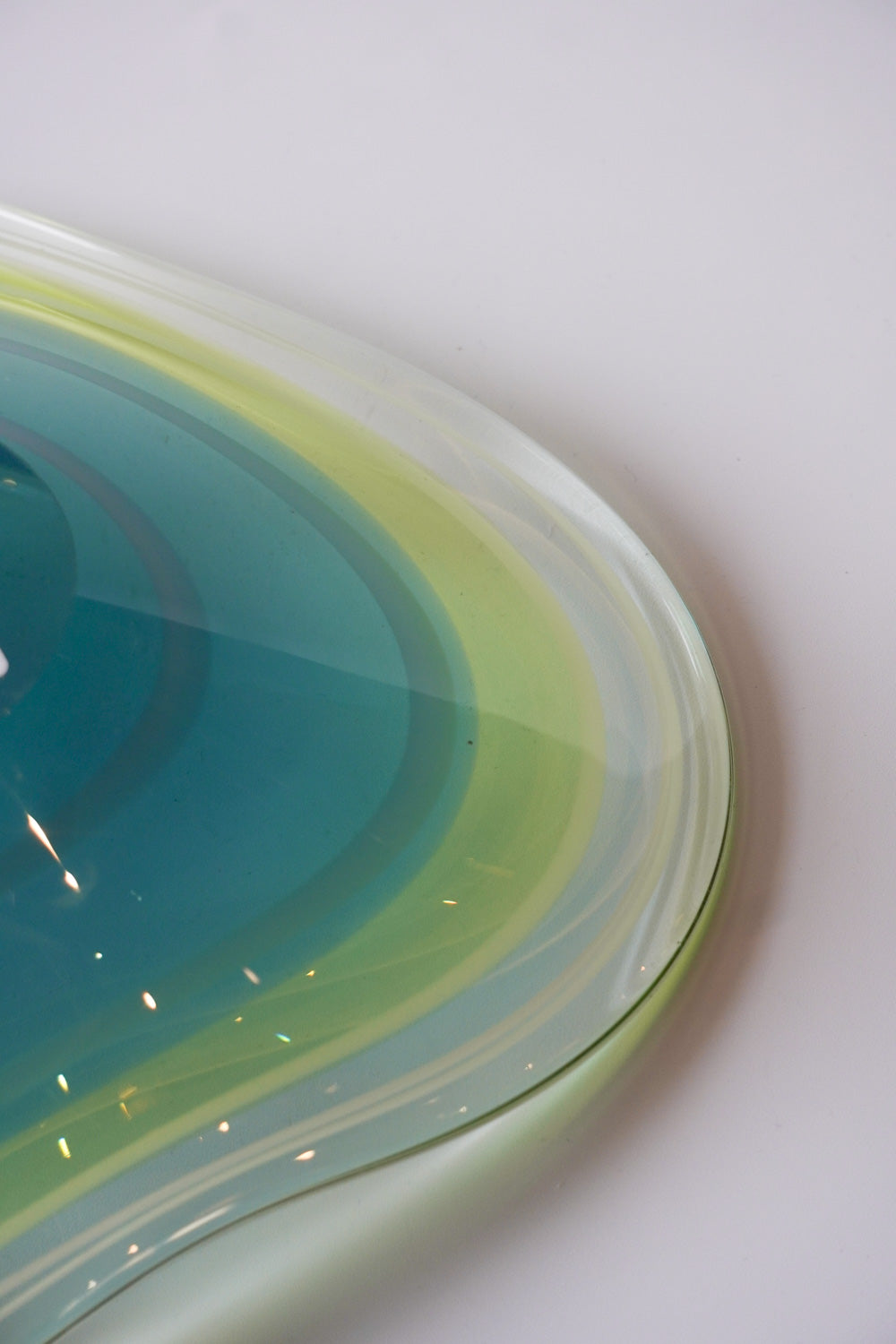 優美なカーブを描く、ユニークなフォルムが目を引くアートガラスプレートです。鮮やかなライムグリーンから深いエメラルドグリーンへと移り変わるグラデーションが、水面や自然の奥行きを感じさせます。