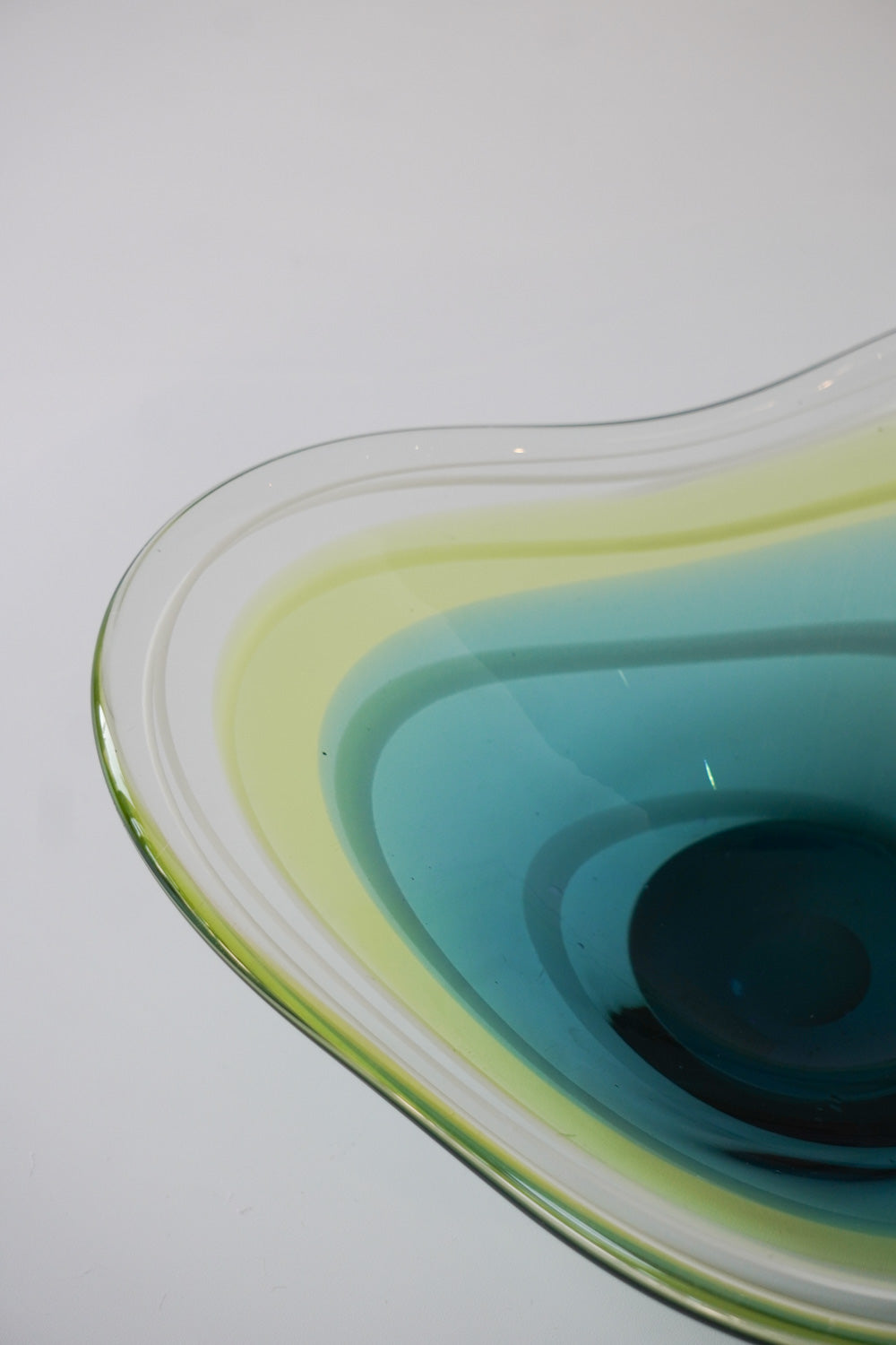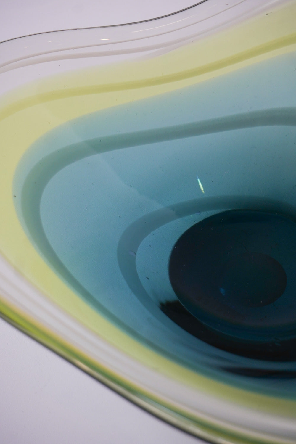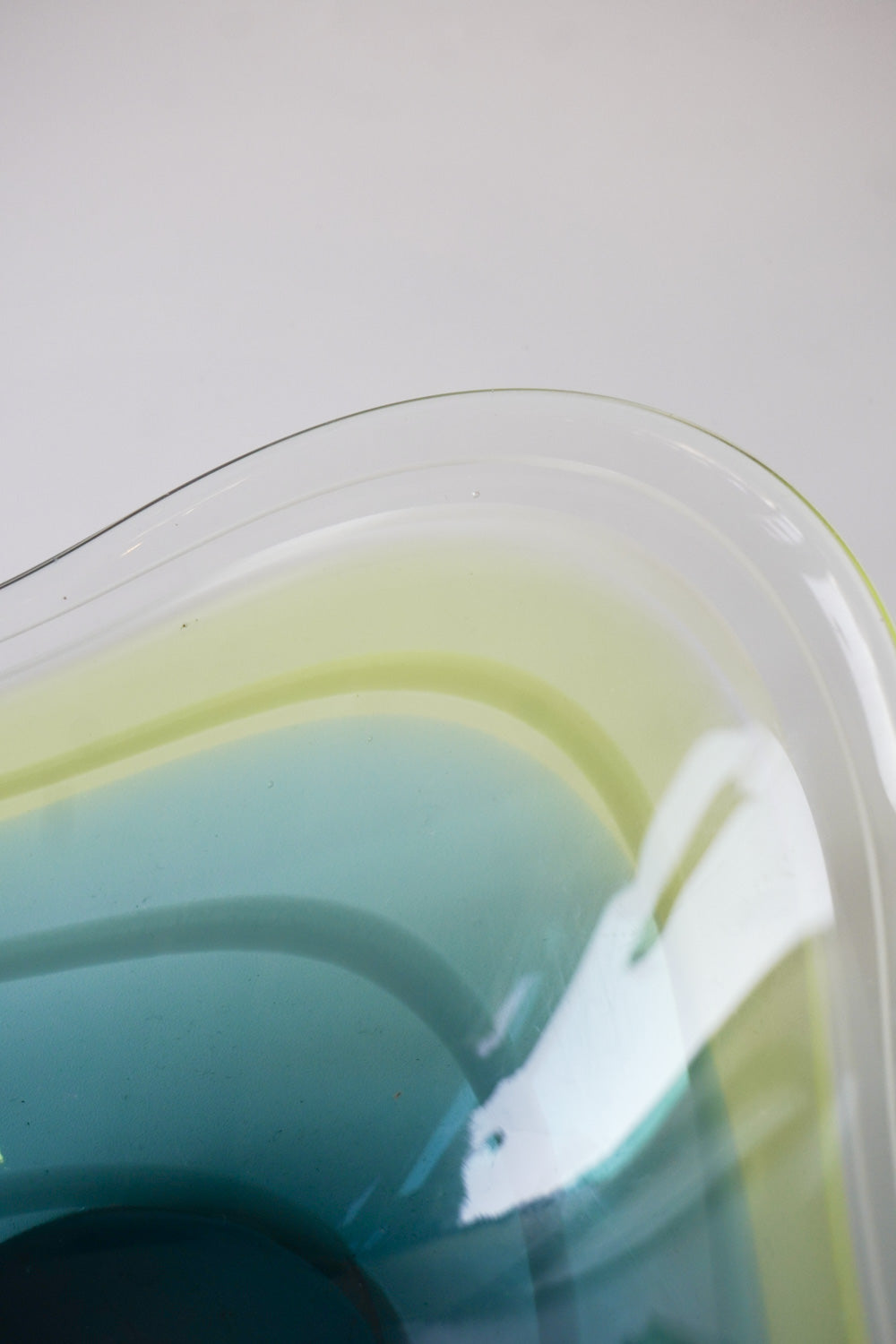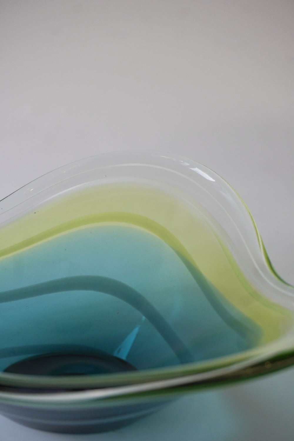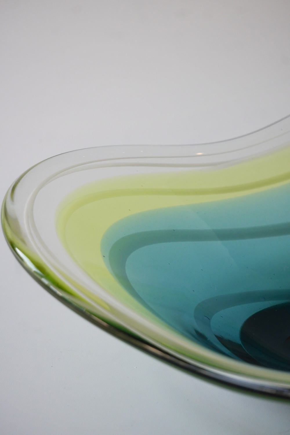 優美なカーブを描く、ユニークなフォルムが目を引くアートガラスプレートです。鮮やかなライムグリーンから深いエメラルドグリーンへと移り変わるグラデーションが、水面や自然の奥行きを感じさせます。