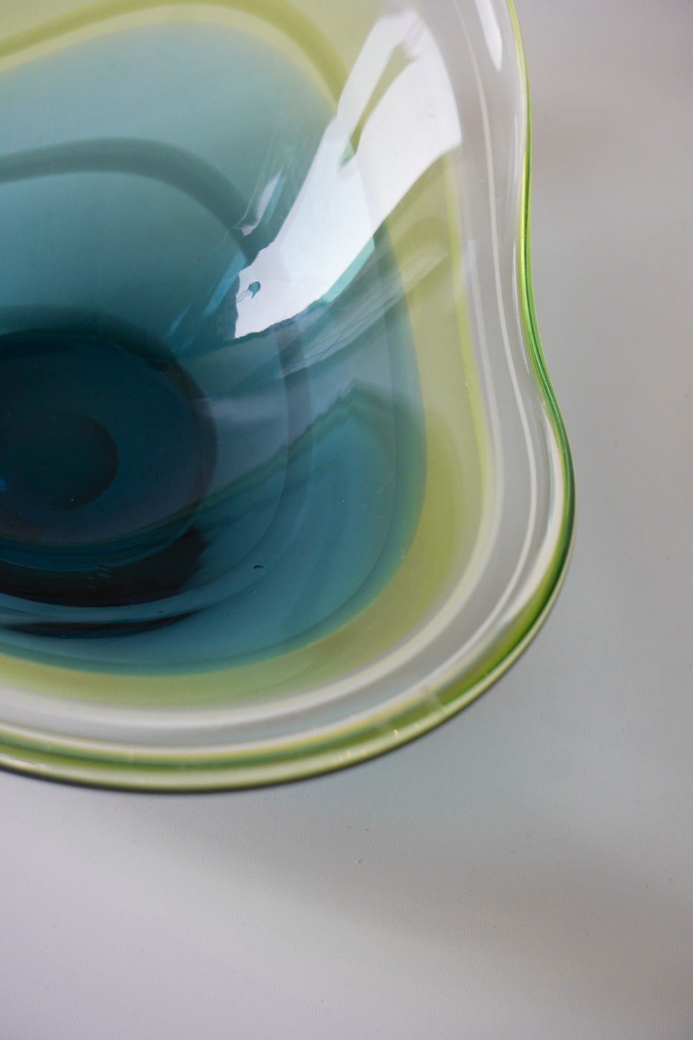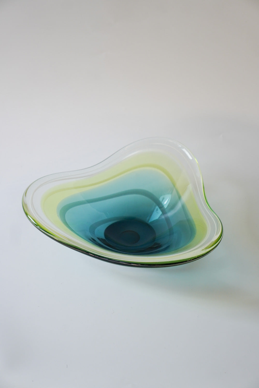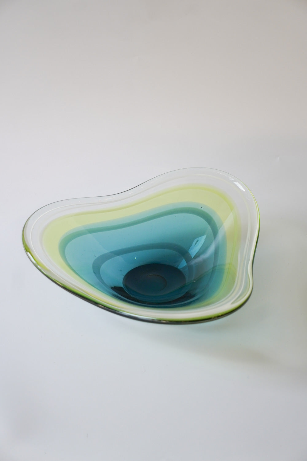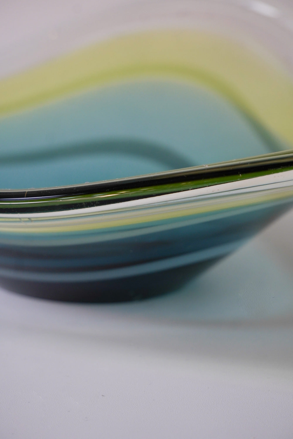 優美なカーブを描く、ユニークなフォルムが目を引くアートガラスプレートです。鮮やかなライムグリーンから深いエメラルドグリーンへと移り変わるグラデーションが、水面や自然の奥行きを感じさせます。