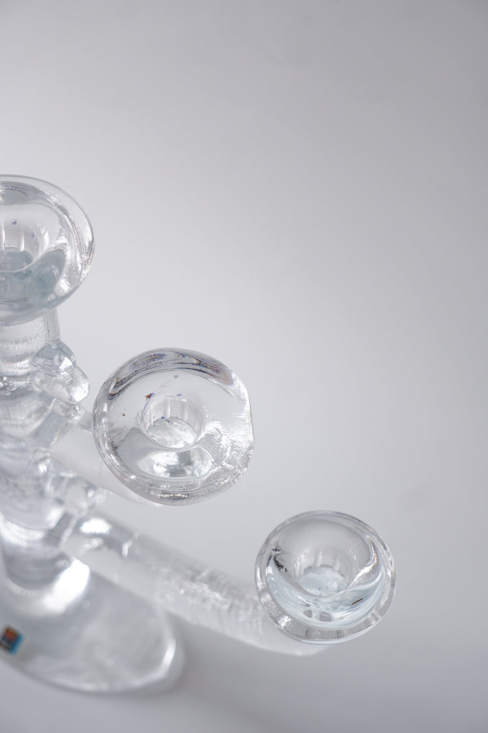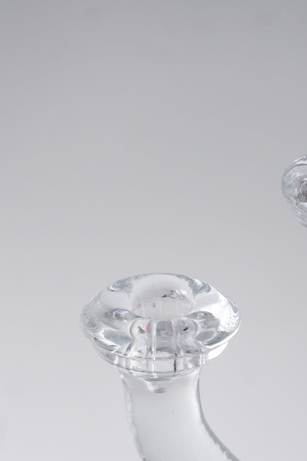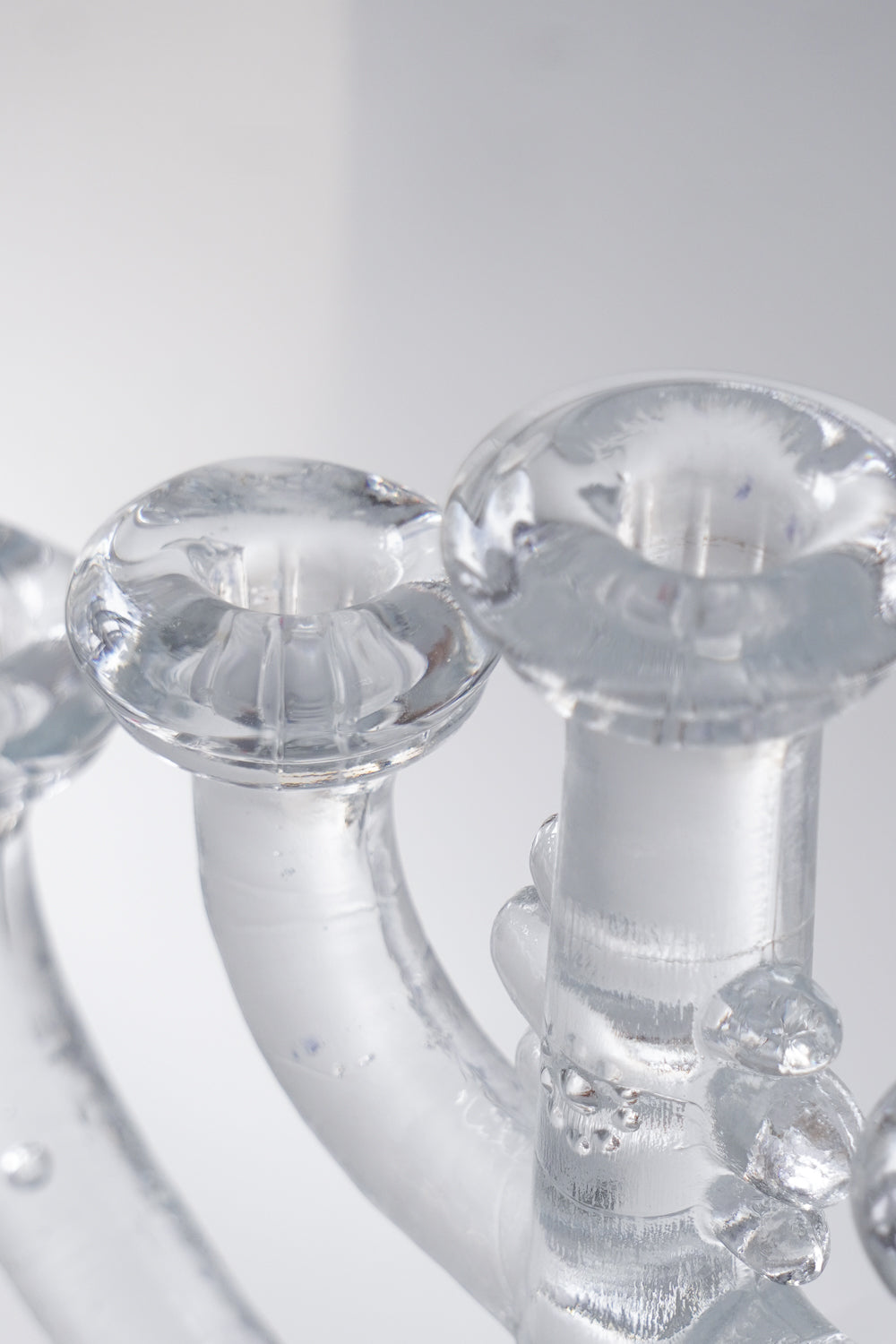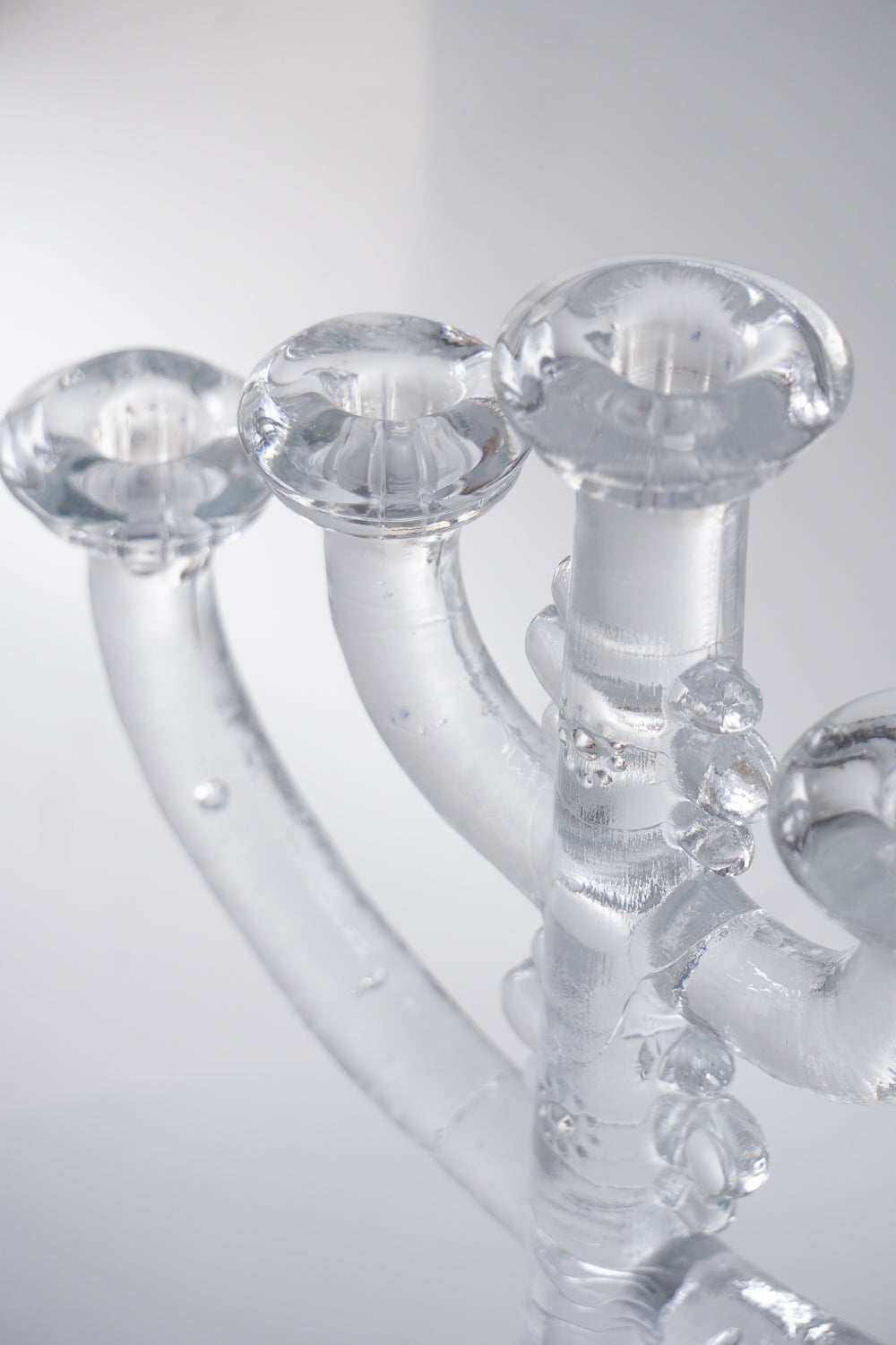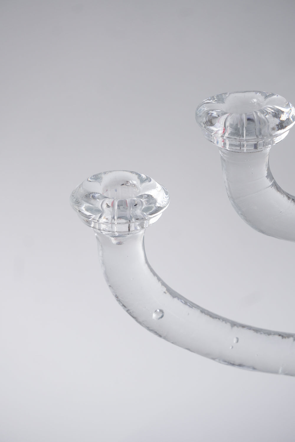 クリアガラスの透明感と、手作りのような温もりを感じさせるテクスチャが融合し、クラシックにもモダンにも調和する洗練された雰囲気を作り出します。ダイニングテーブルのセンターピースとして、またはリビングや玄関のオブジェとして、キャンドルの灯りがない日中も美しい存在感を放ちます。
