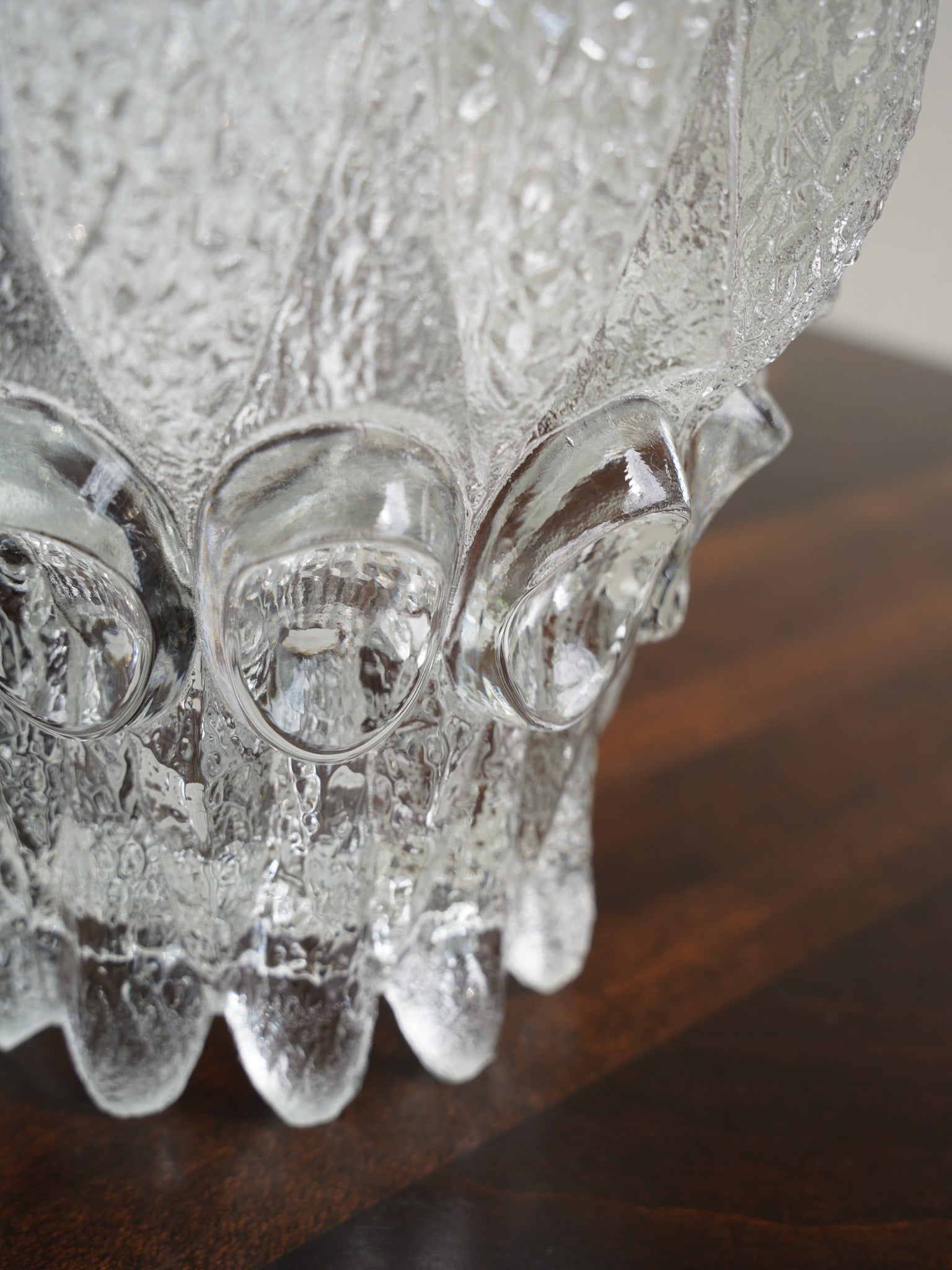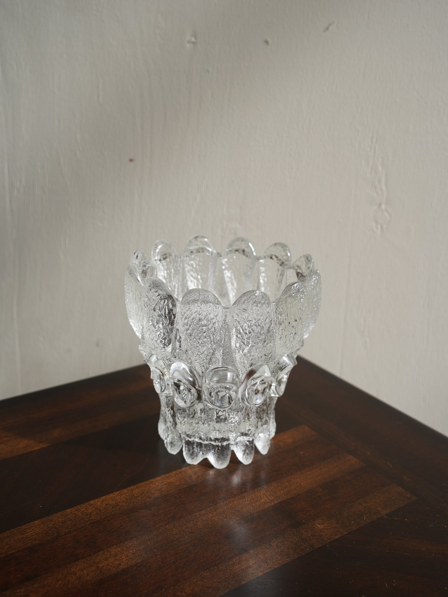 透明なガラスに、まるで氷柱や霜のような立体的なテクスチャが施された、ガラス製のキャンドルホルダーです。