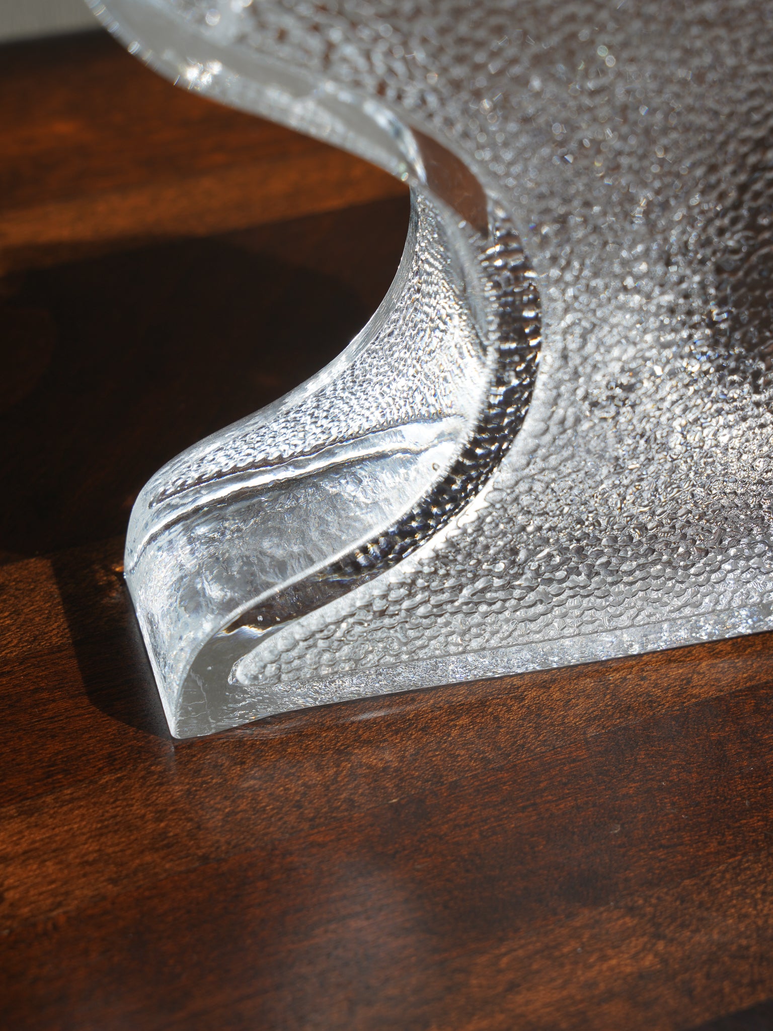 まるで北欧の凍った大地から削り出されたかのような、荒々しくも美しい質感が特徴です。表面全体に施された不規則な凹凸と気泡は、光を複雑に反射させ、幻想的なきらめきを生み出します。この「アイスガラス」とも呼ばれるデザインは、1970年代のスカンジナビア・ガラスアートを象徴するものです。
