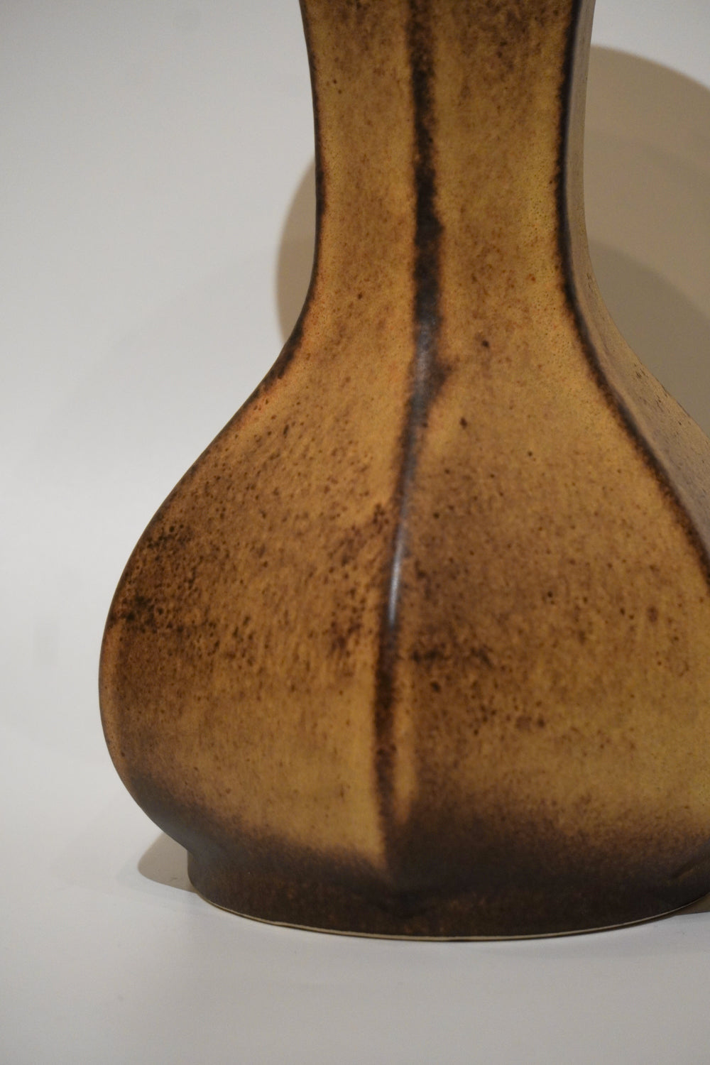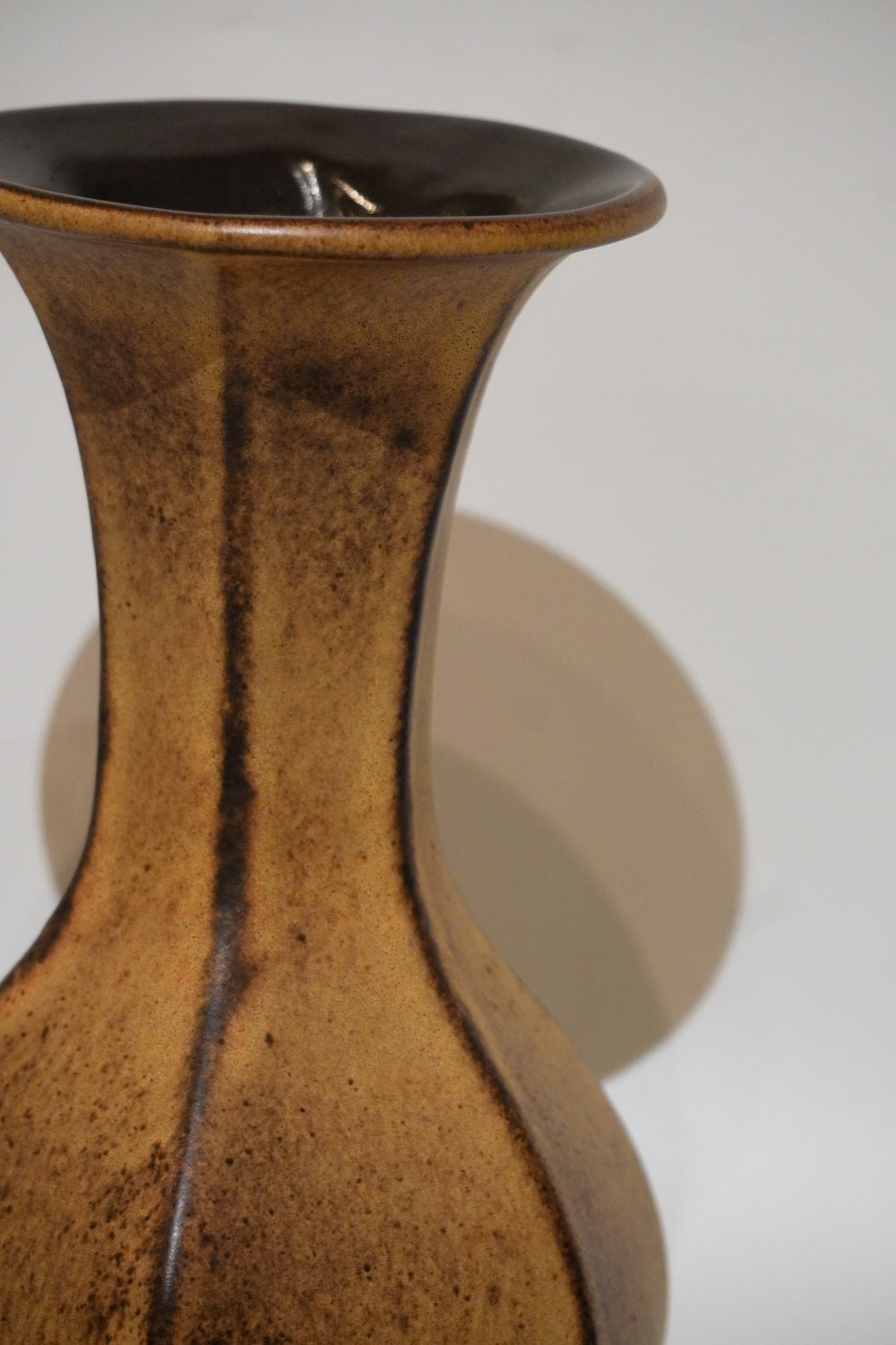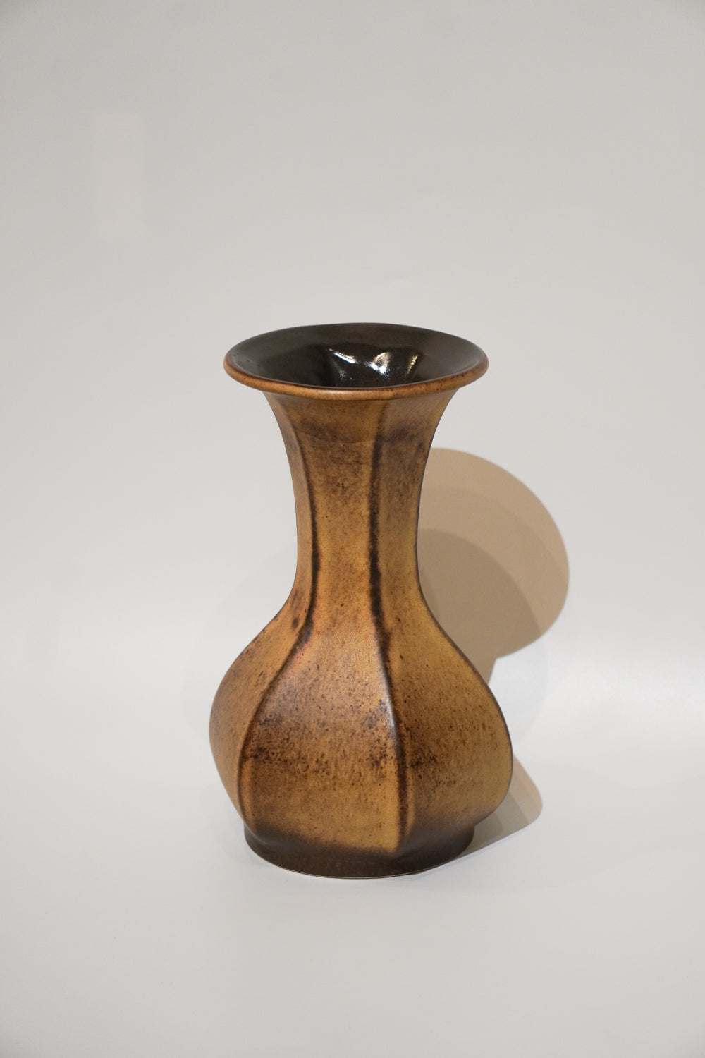 どっしりとした下部から、上部に向かって細く伸びる特徴的なシルエットをしています。表面には、微細な斑点が全体に散りばめられた釉薬が使われています。