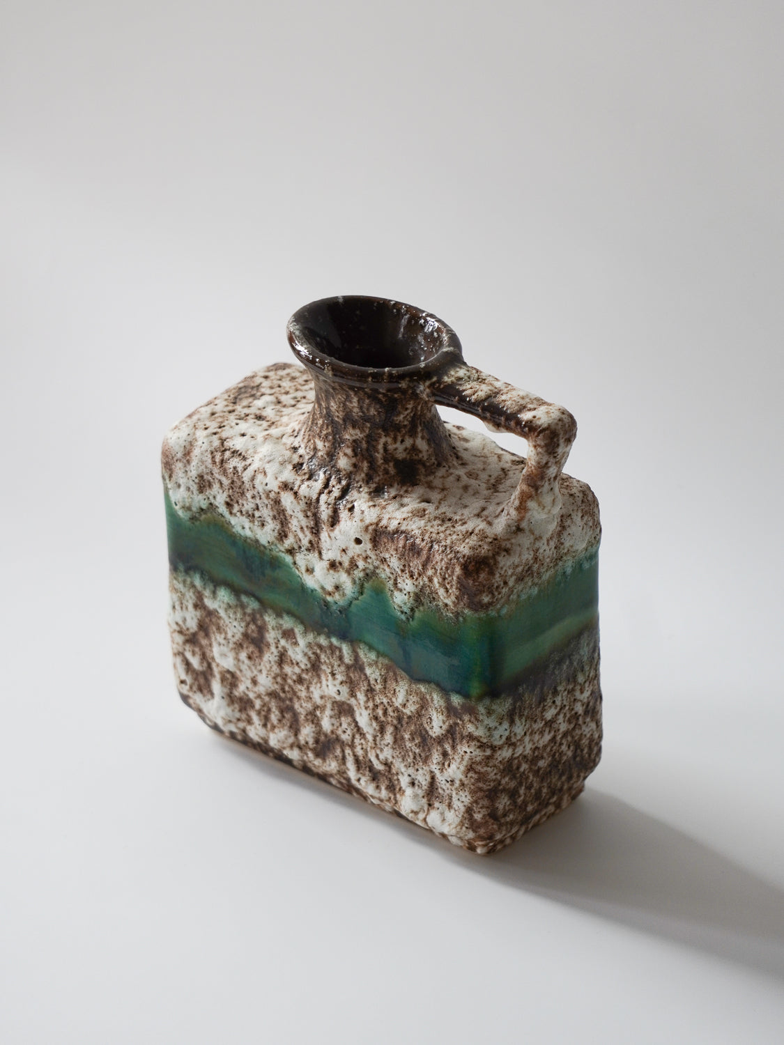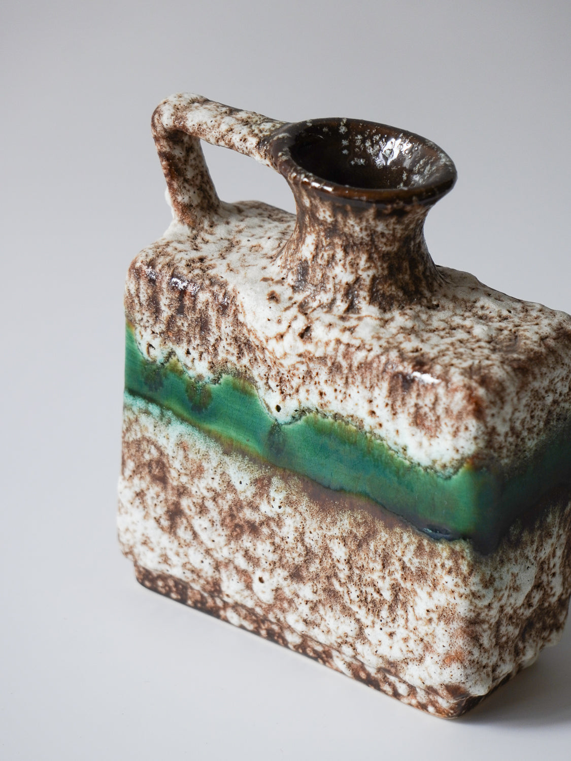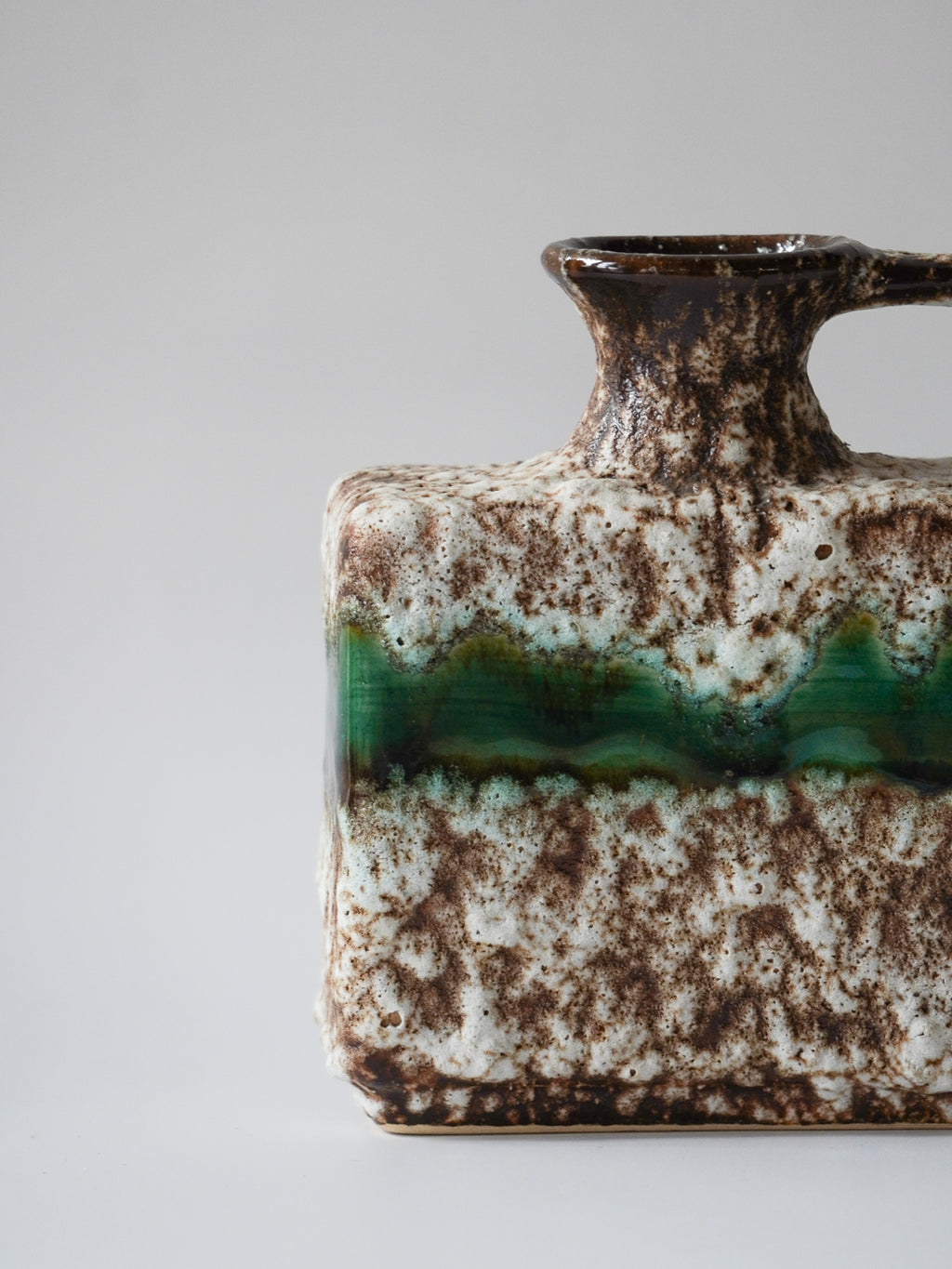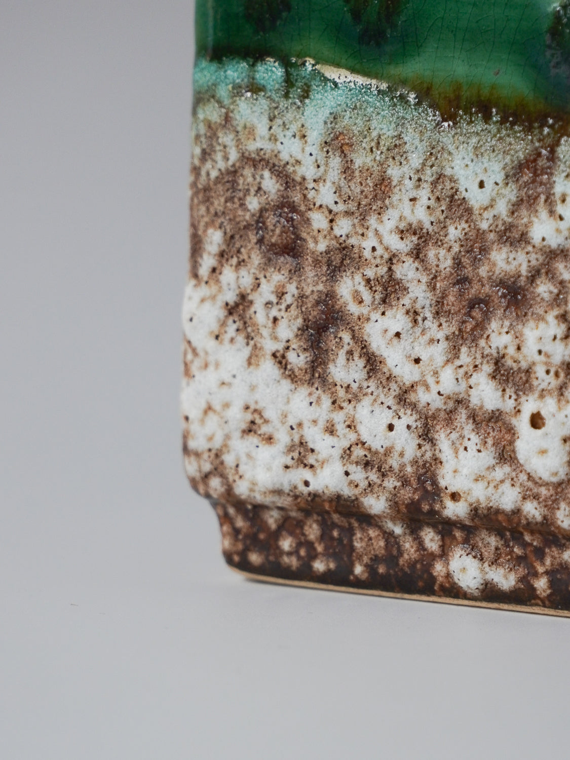 角型のモダンなフォルムに、荒々しいテクスチャと鮮やかなグリーンのラインが融合した、非常に個性的な陶器製花器です。