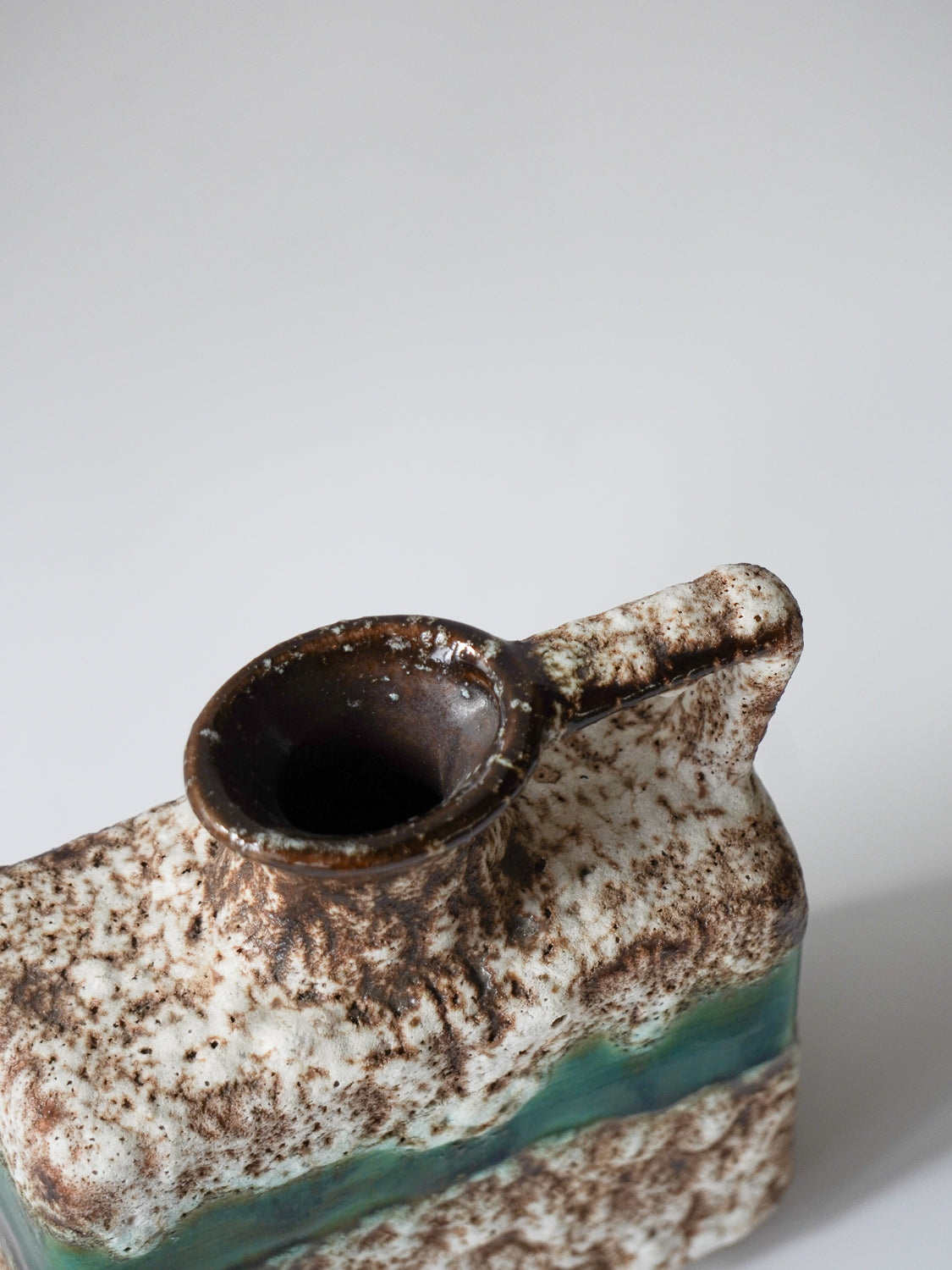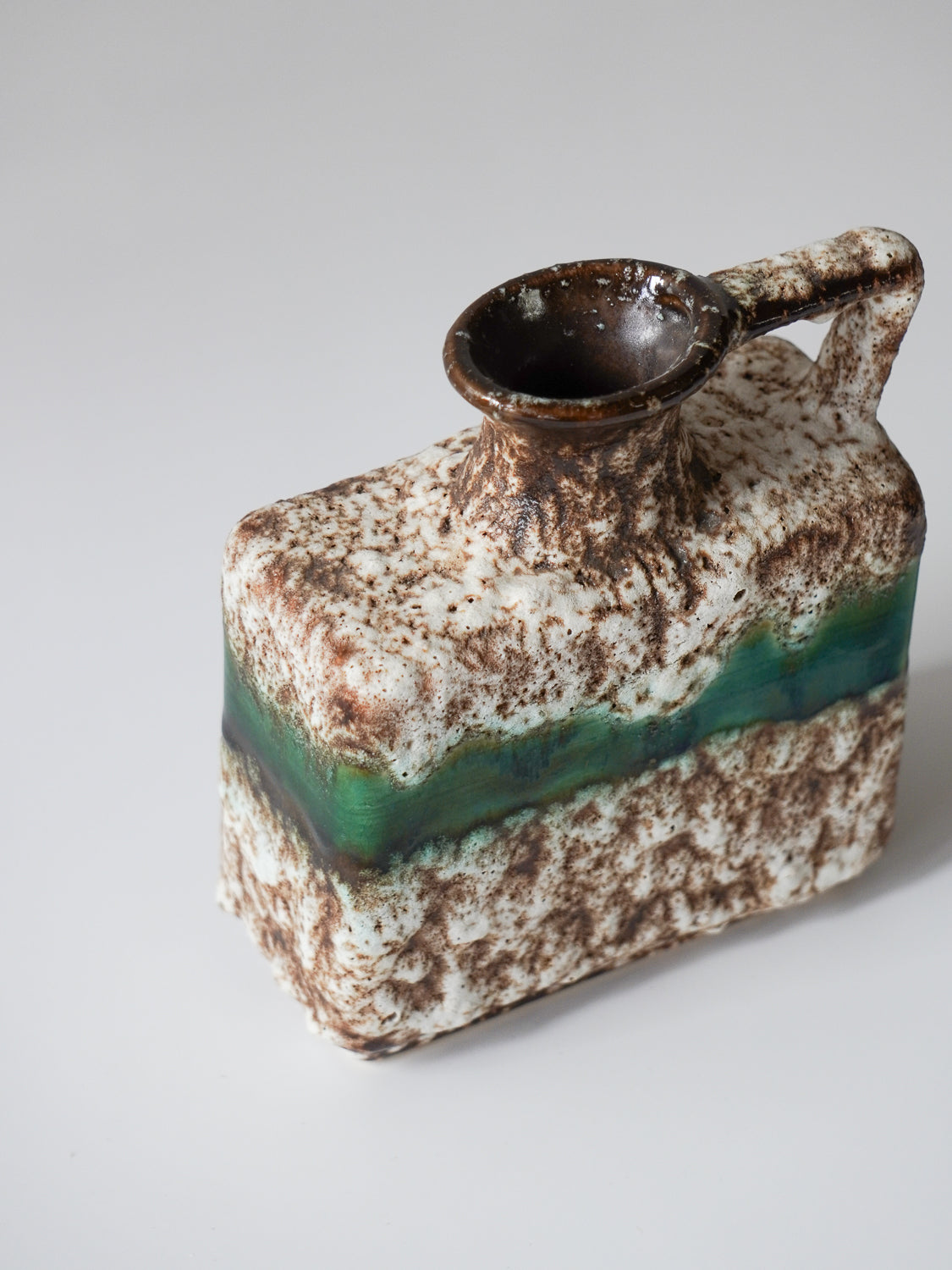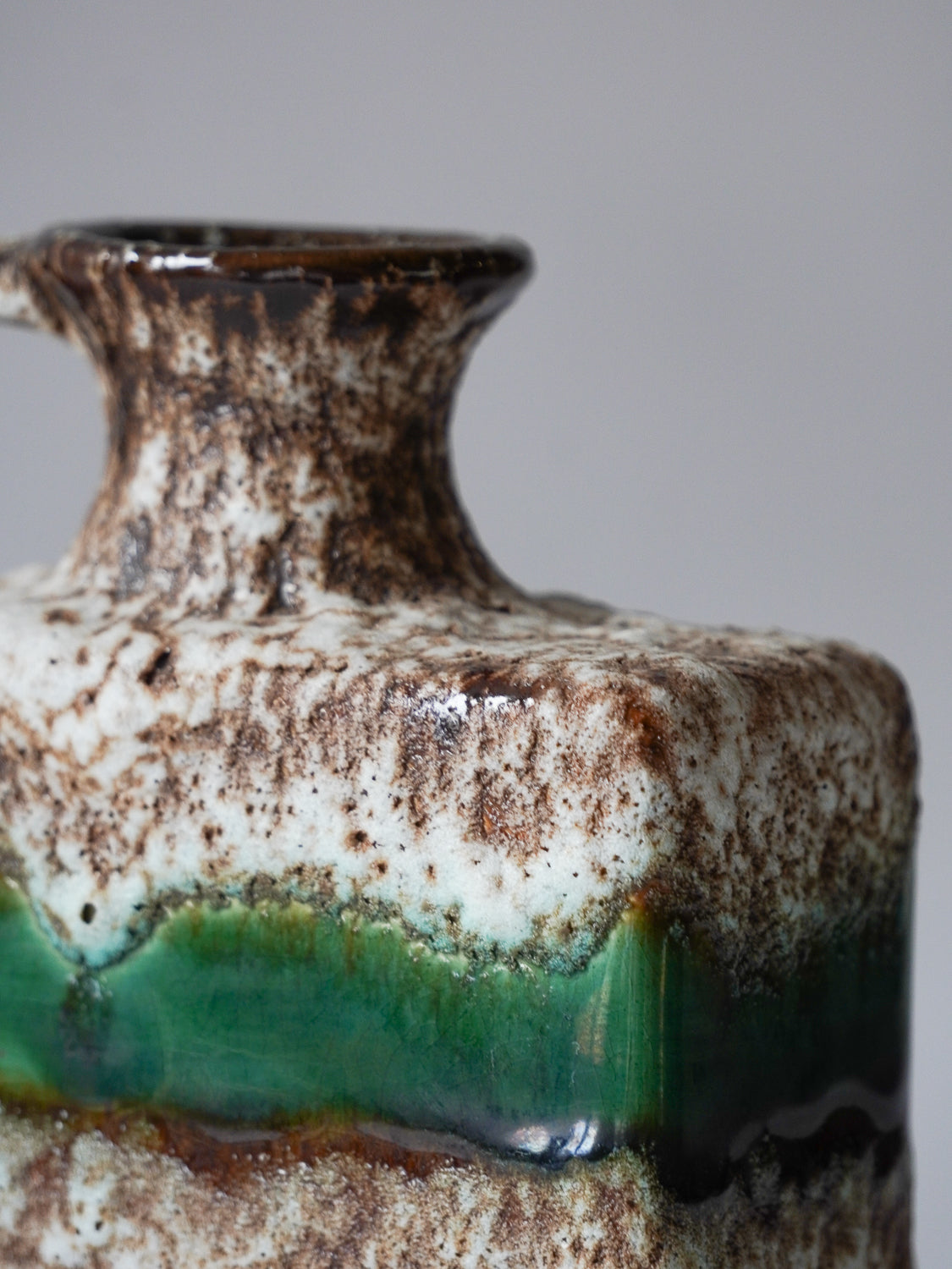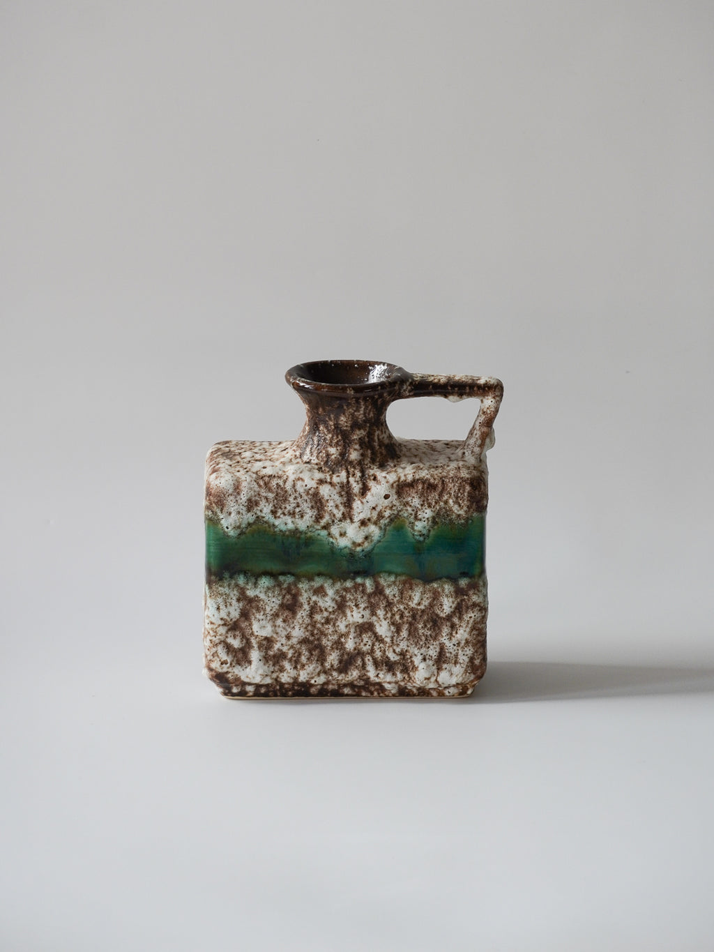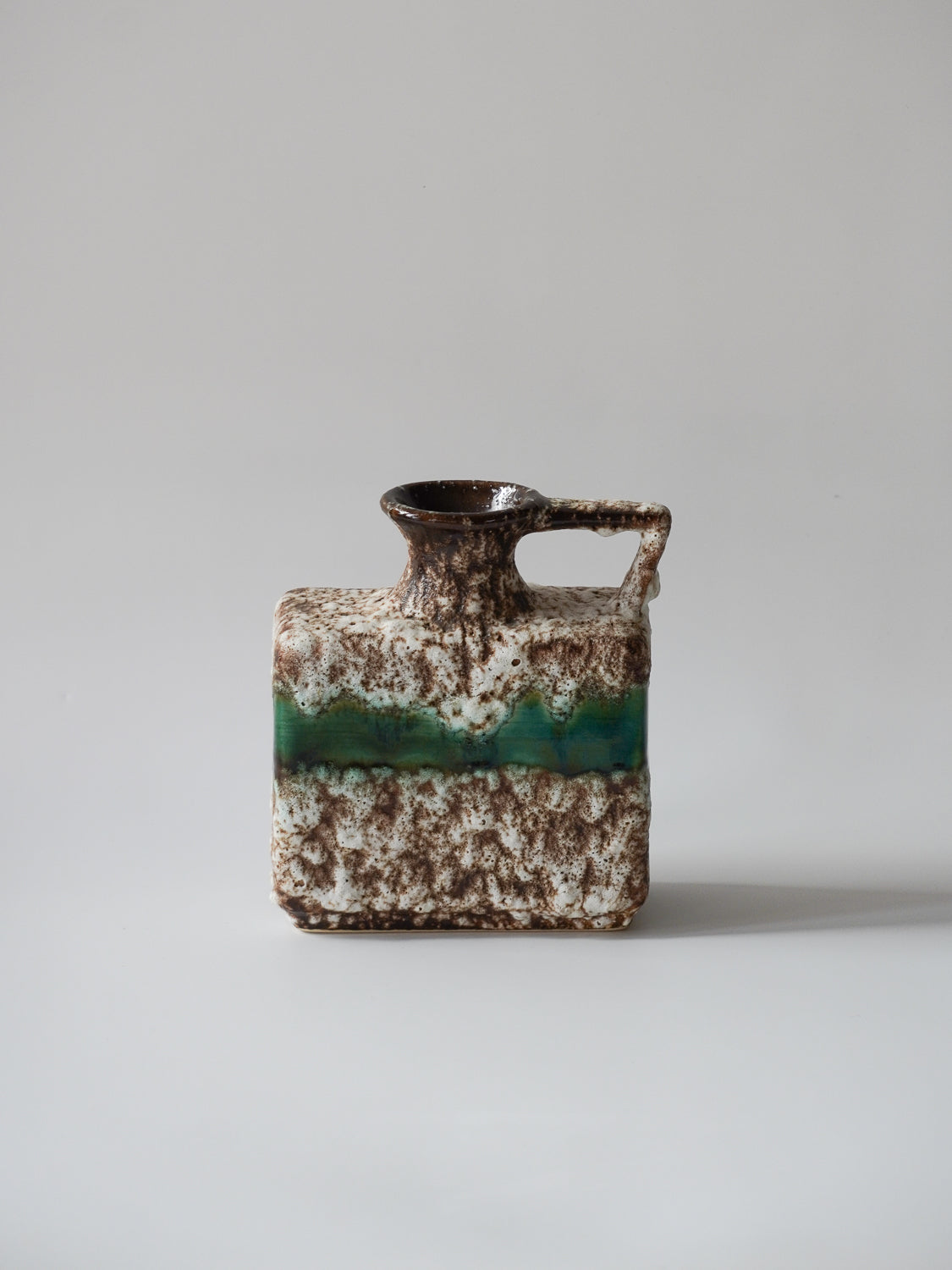 角型のモダンなフォルムに、荒々しいテクスチャと鮮やかなグリーンのラインが融合した、非常に個性的な陶器製花器です。