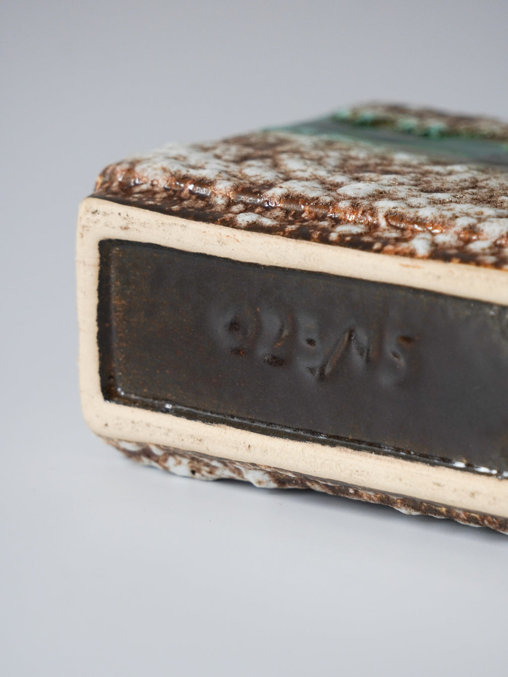 中央には、光沢のある深いエメラルドグリーンの釉薬が横一文字に流れ、荒野を流れる清流のようなアクセントになっています。