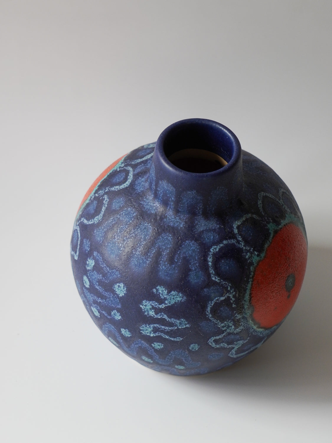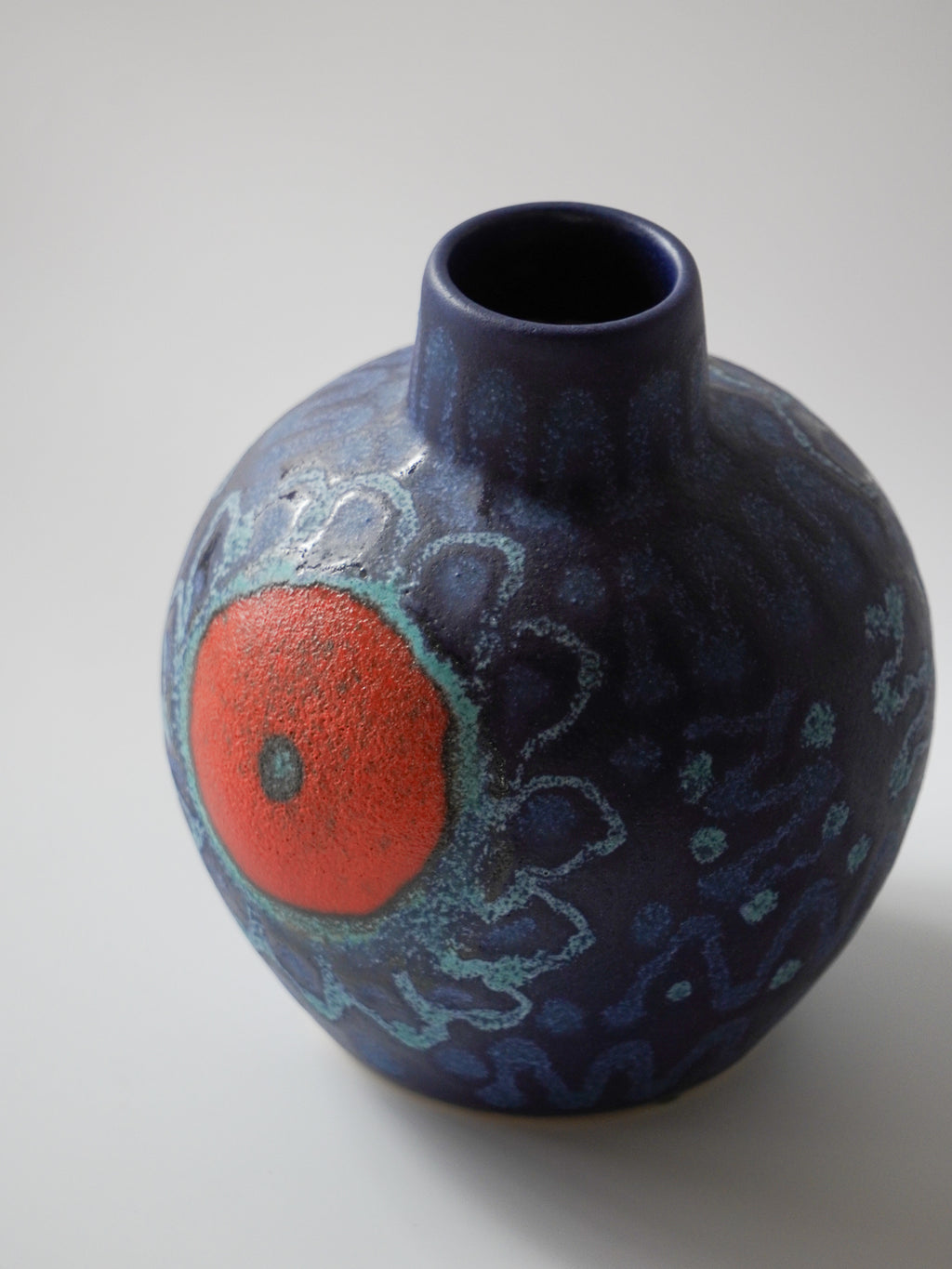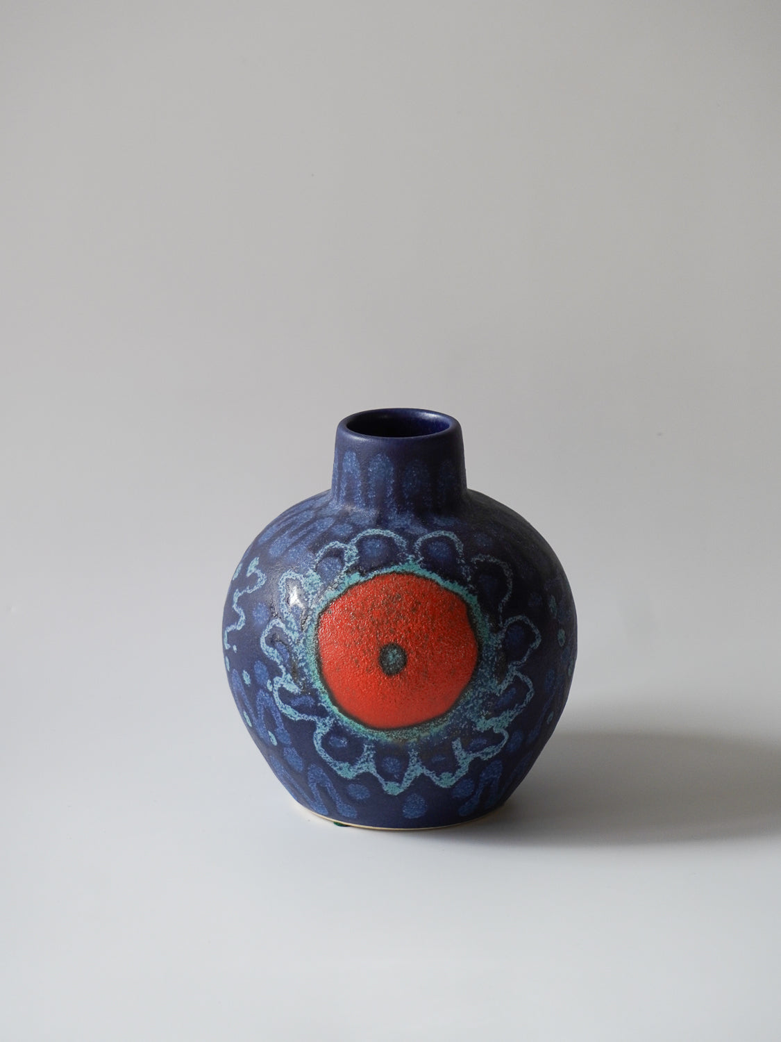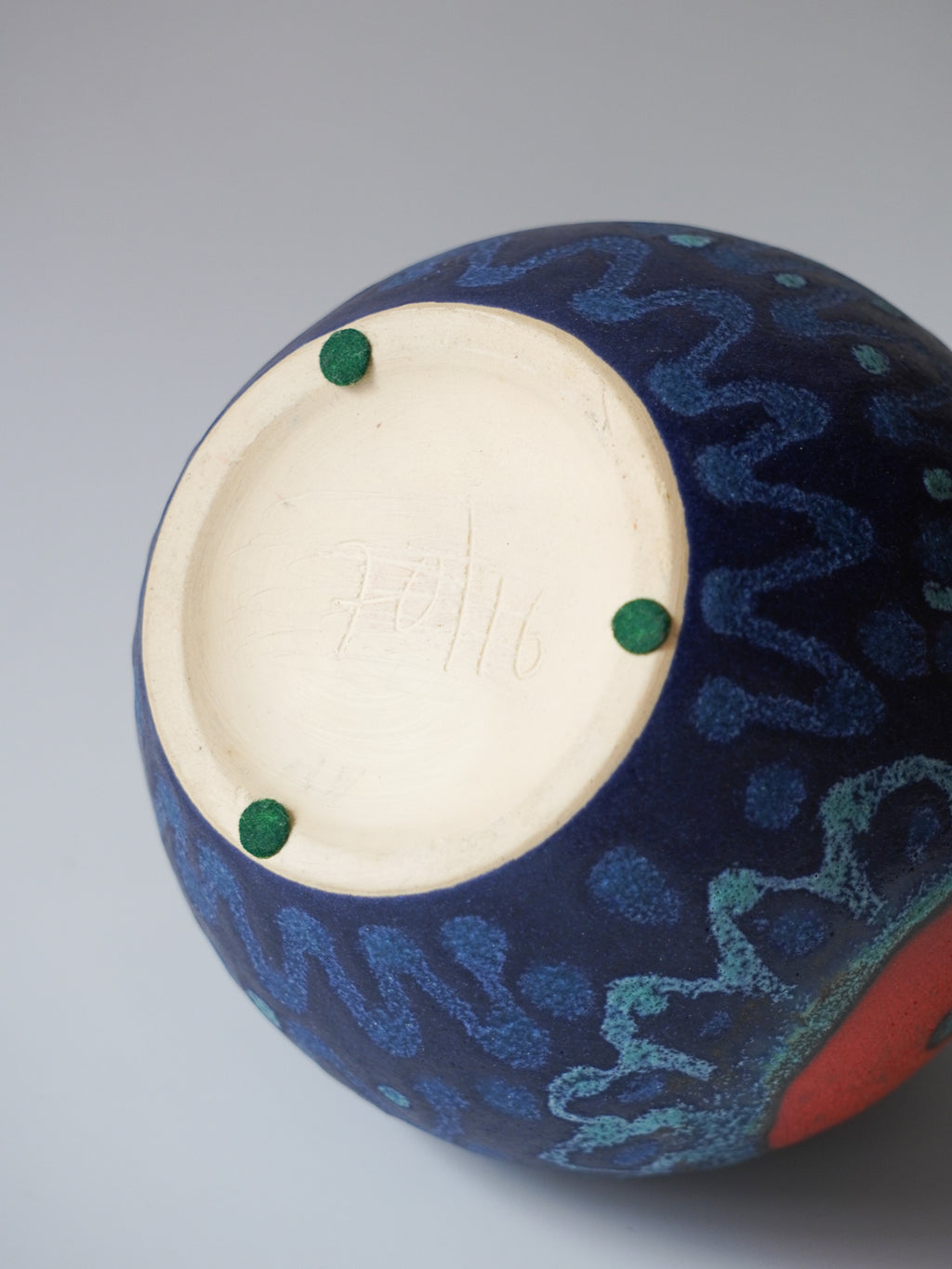 ディープブルーの円形花器と燃える太陽のようなモチーフ