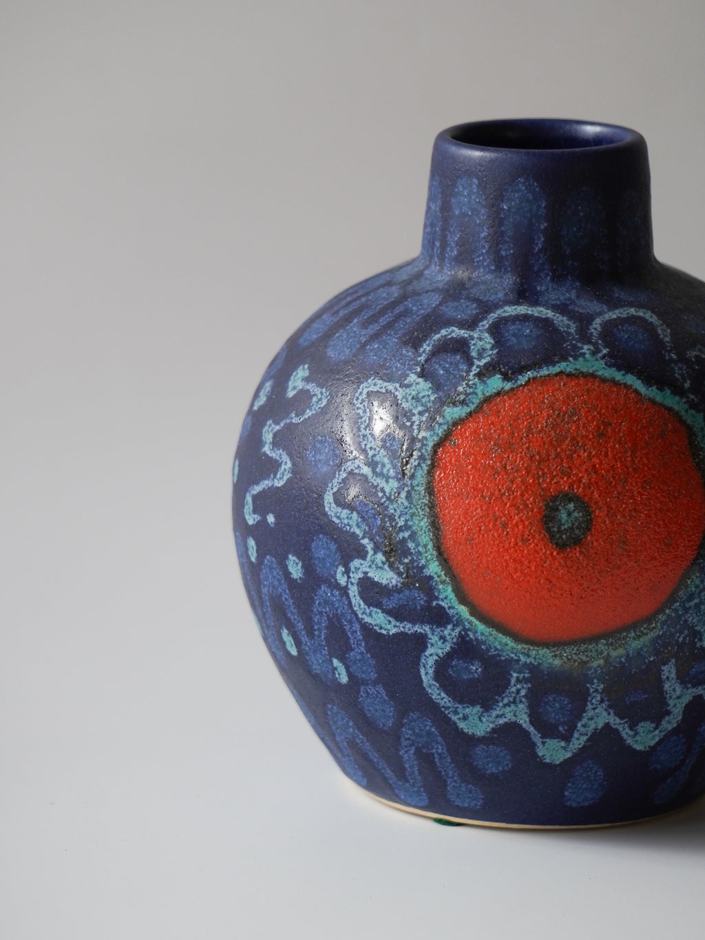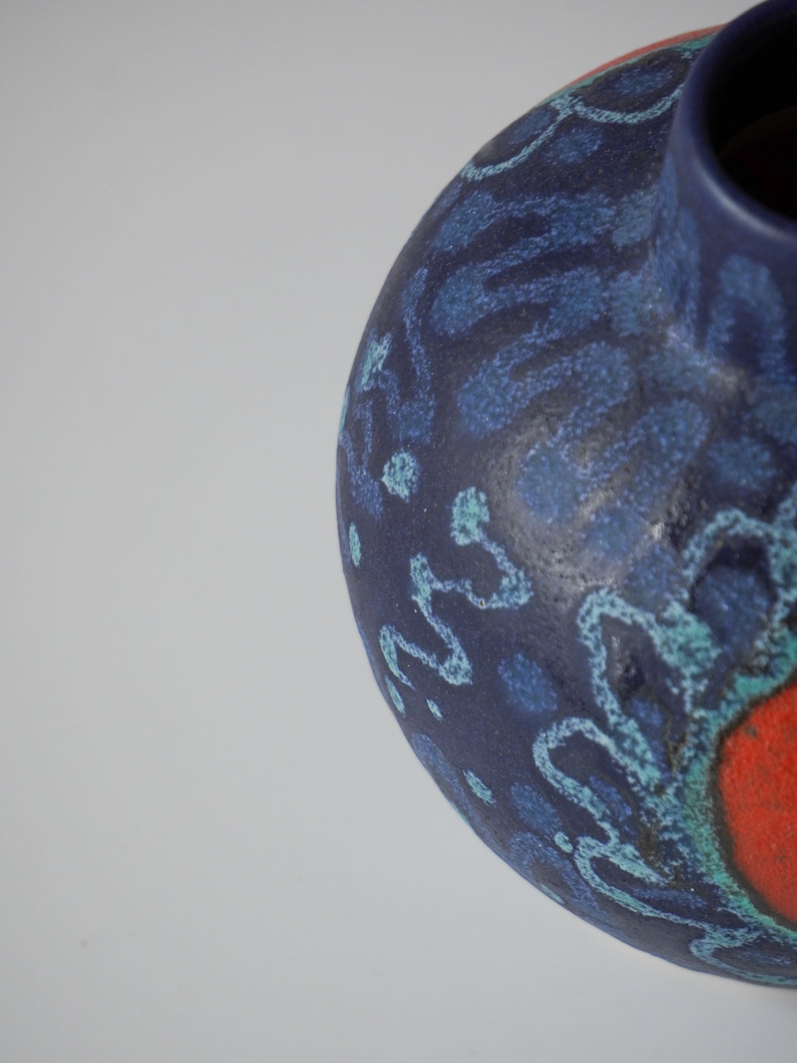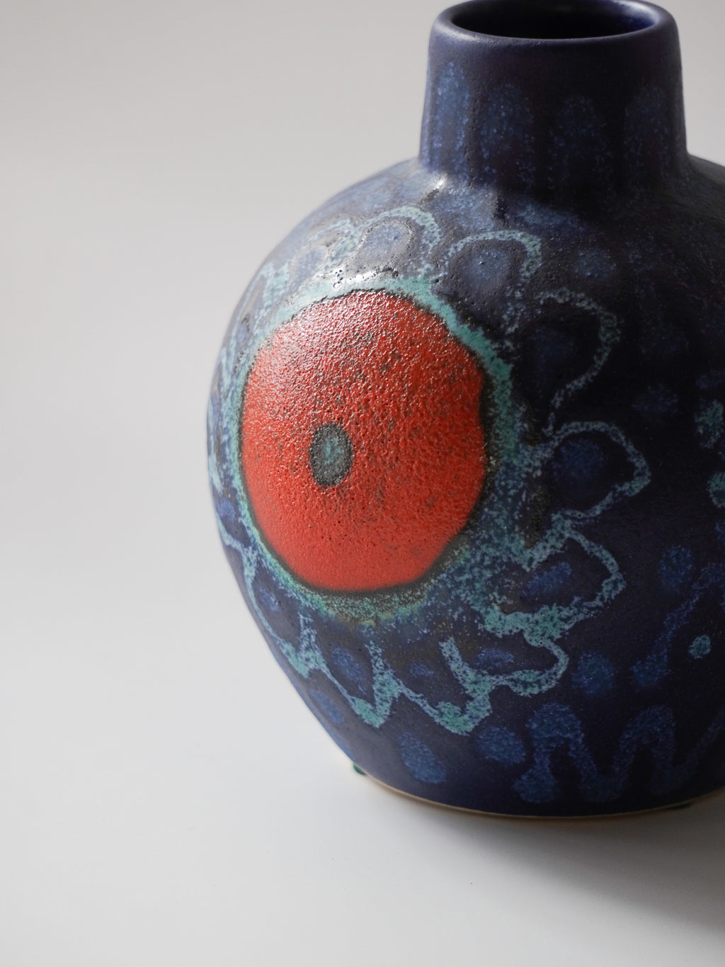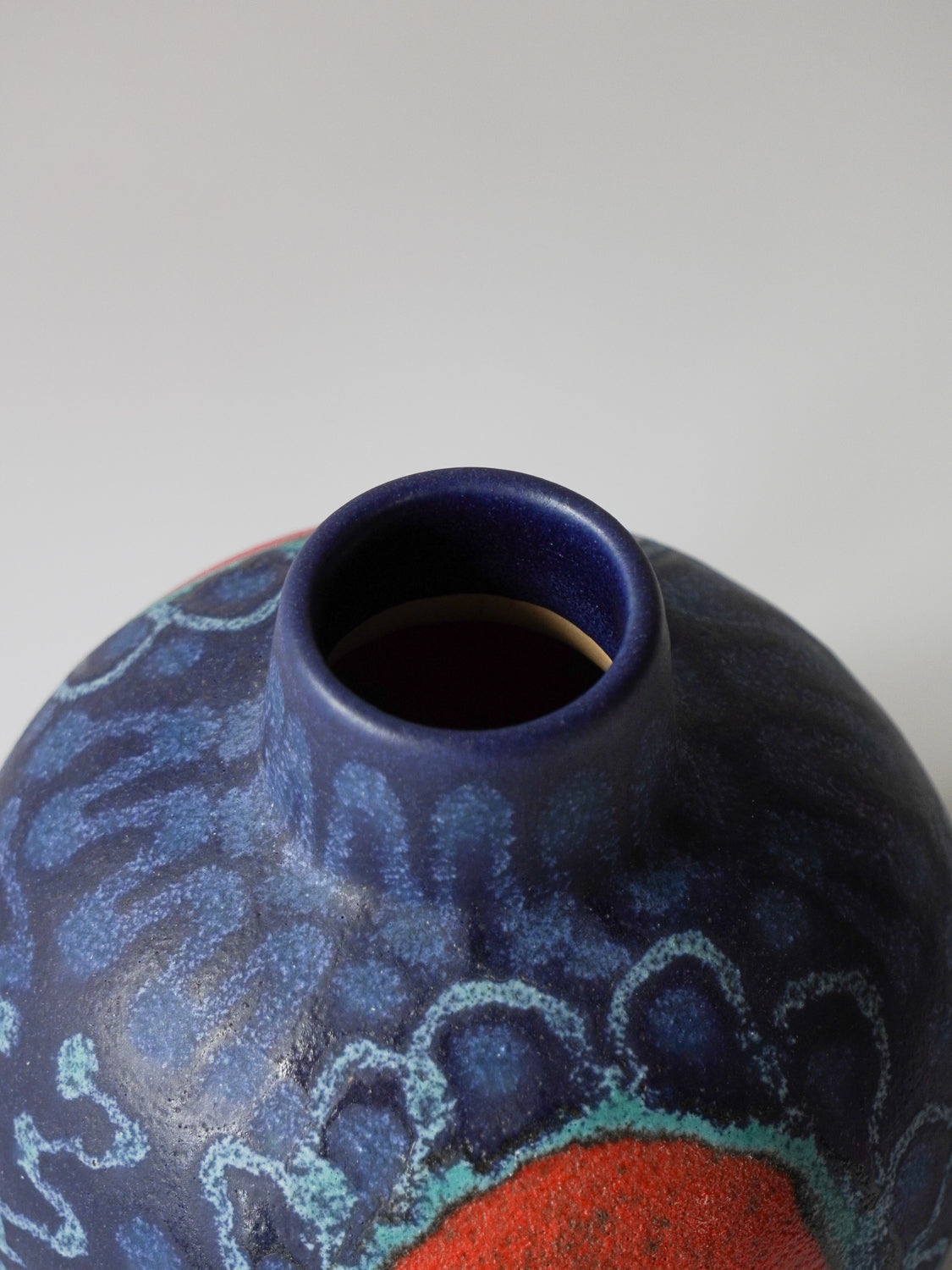 深みのあるコバルトブルーの素地に、力強い赤とオレンジのテクスチャが中心に描かれた、まるで宇宙の星雲や神秘的な紋章のようなデザインのボトル型花器です。