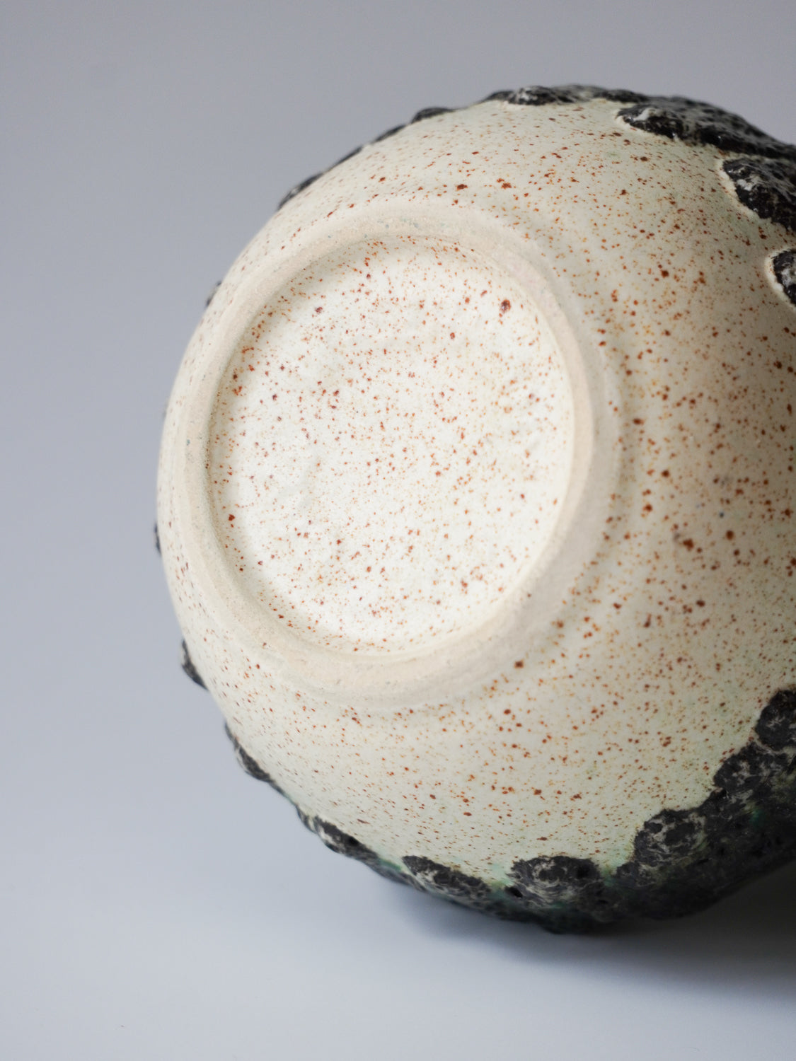 コロンとした愛らしいフォルムと、深緑、黒、クリーム色の三色が織りなす独特の配色が魅力の陶器製花器です。