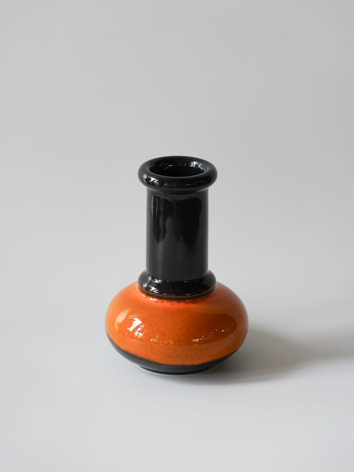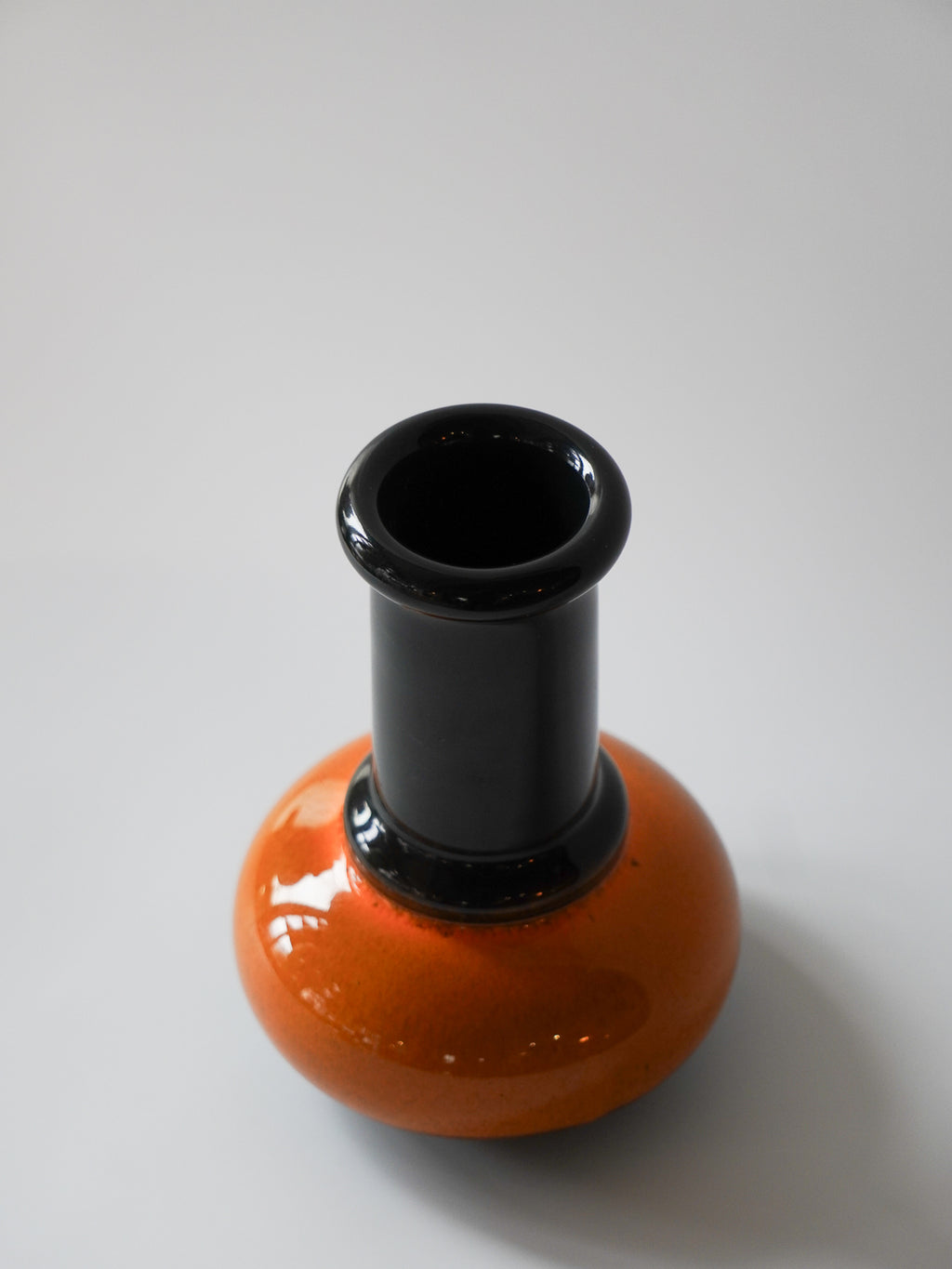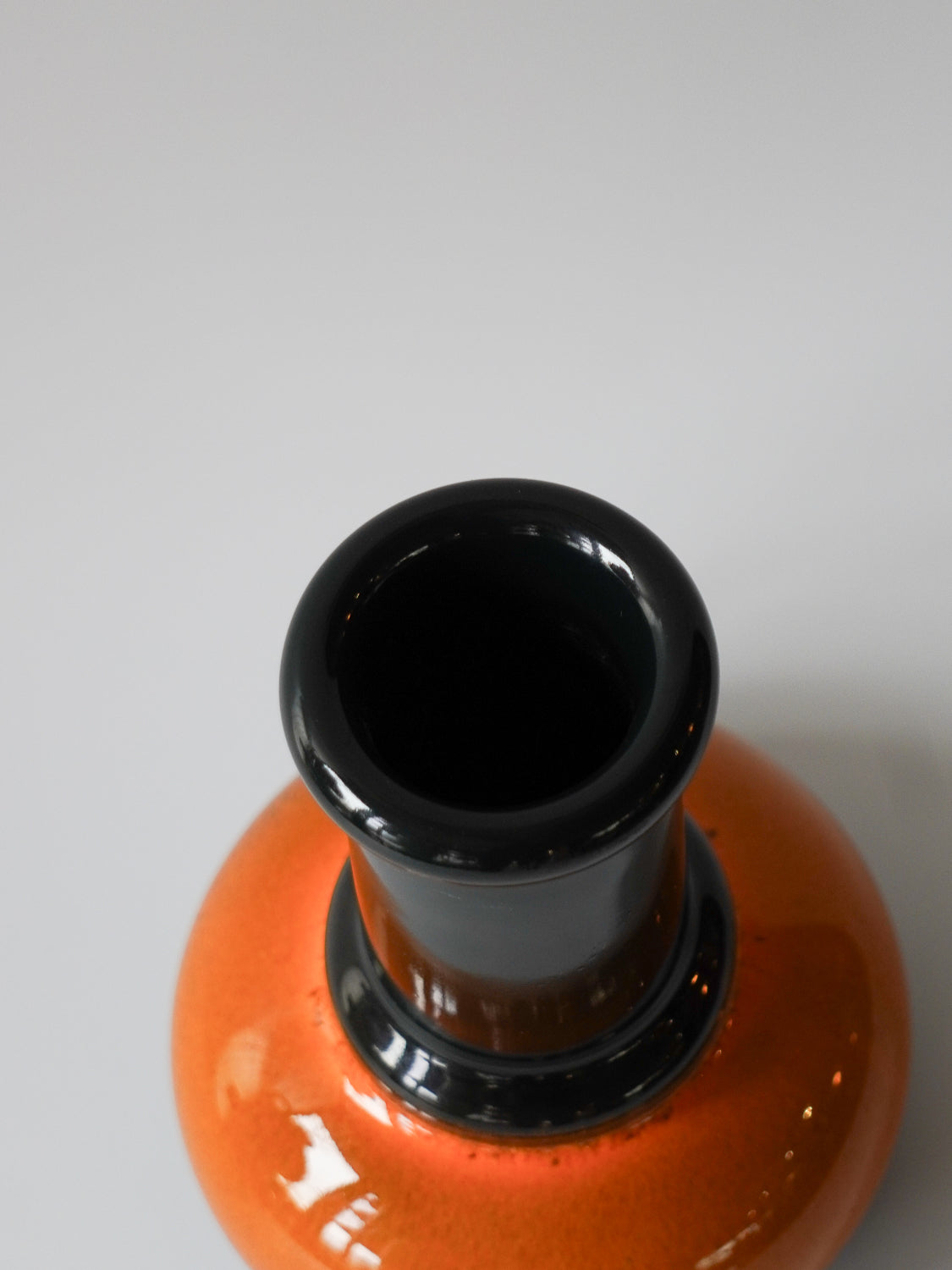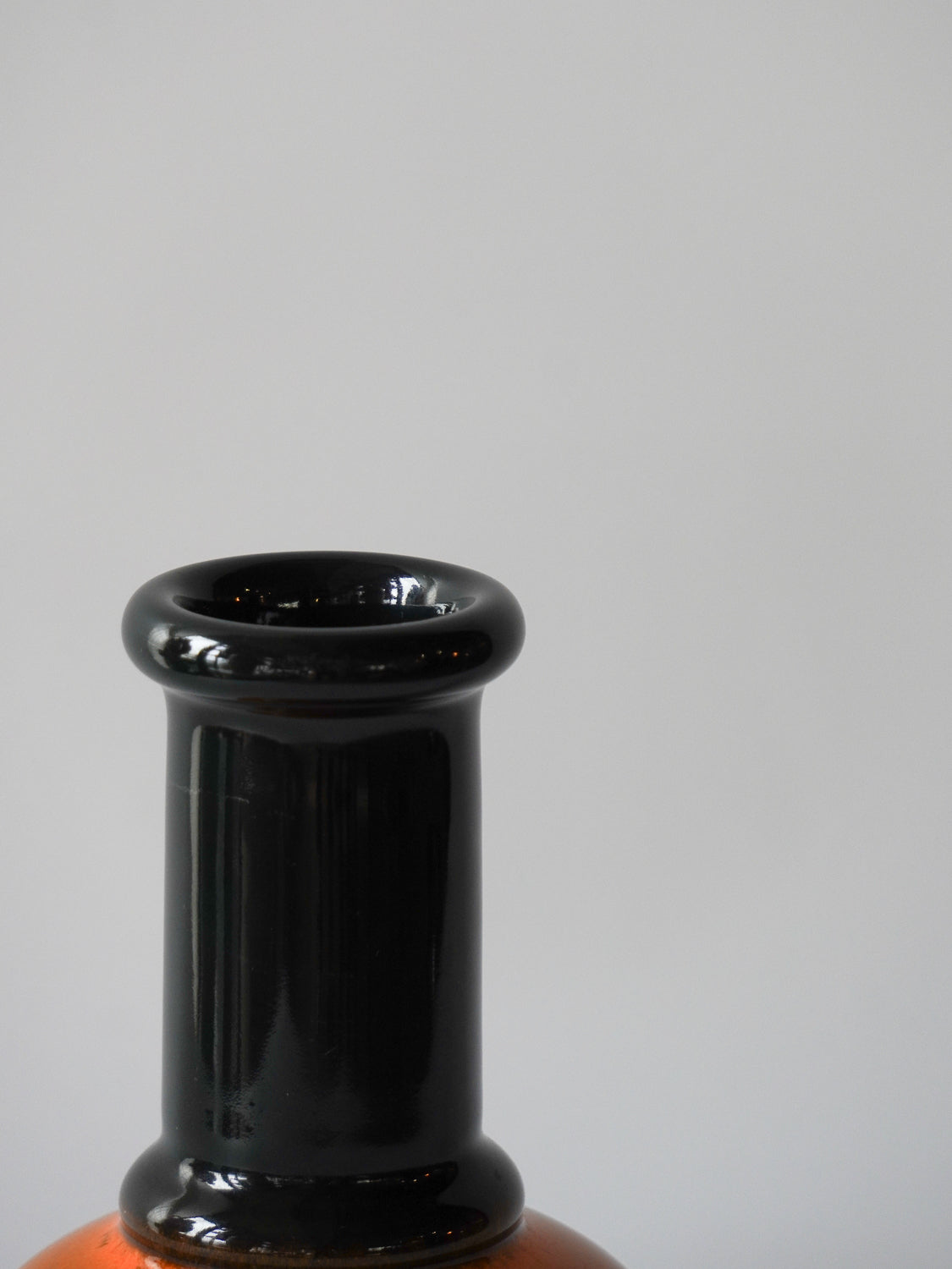 つややかなジェットブラックと、光沢のあるビタミンカラーのオレンジが見事に調和した、モダンで個性的なボトル型花器です。
