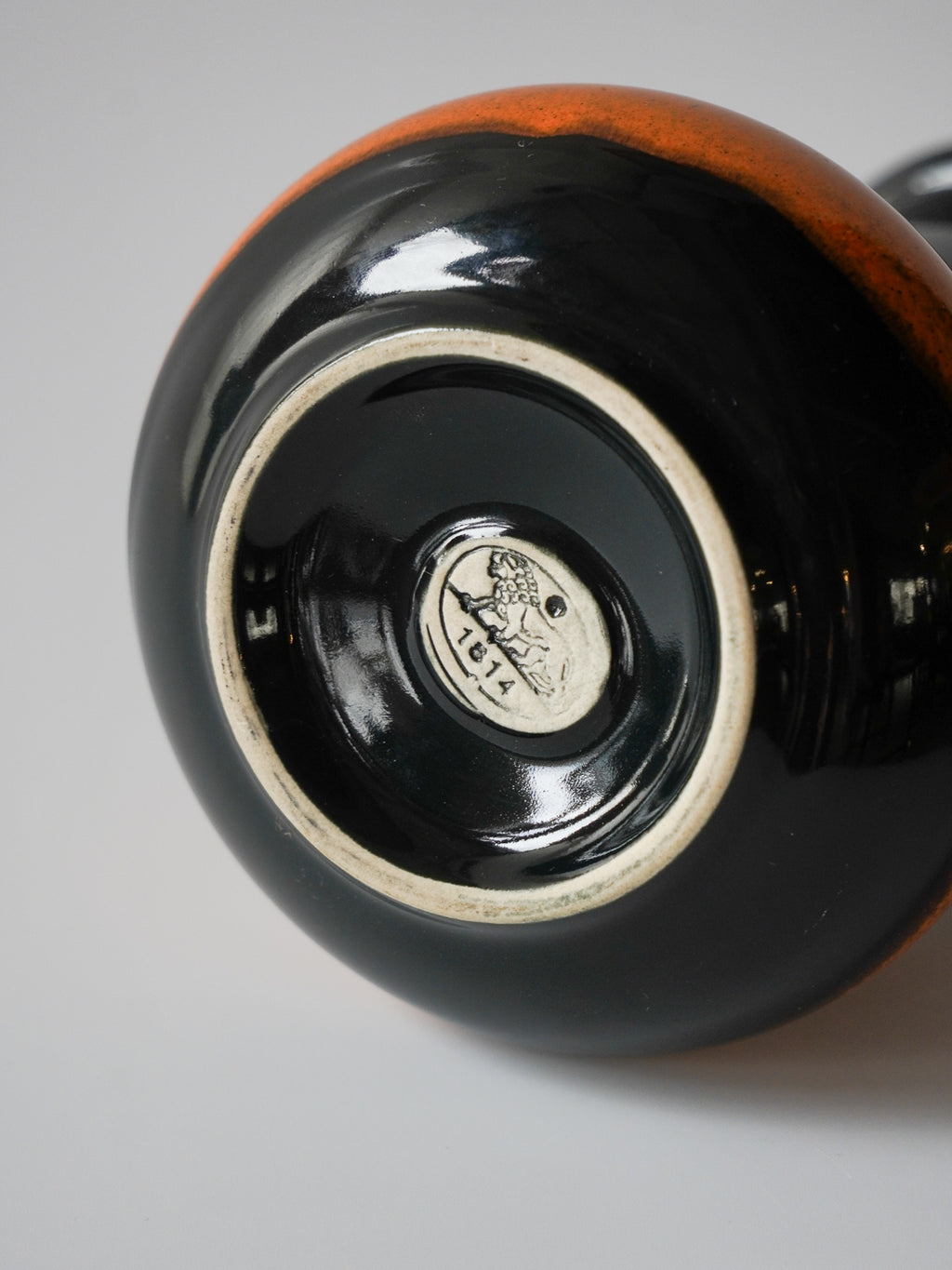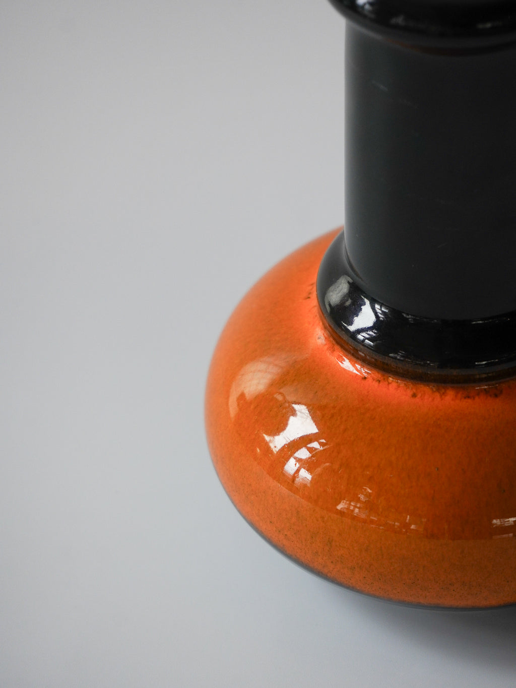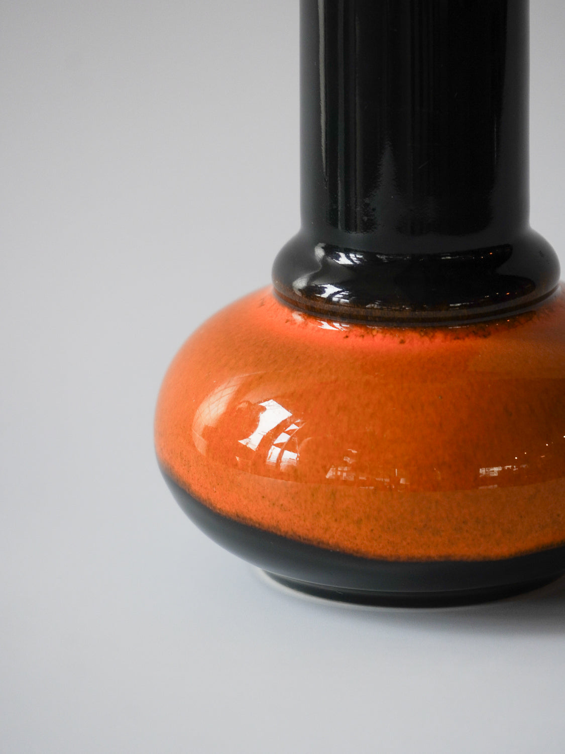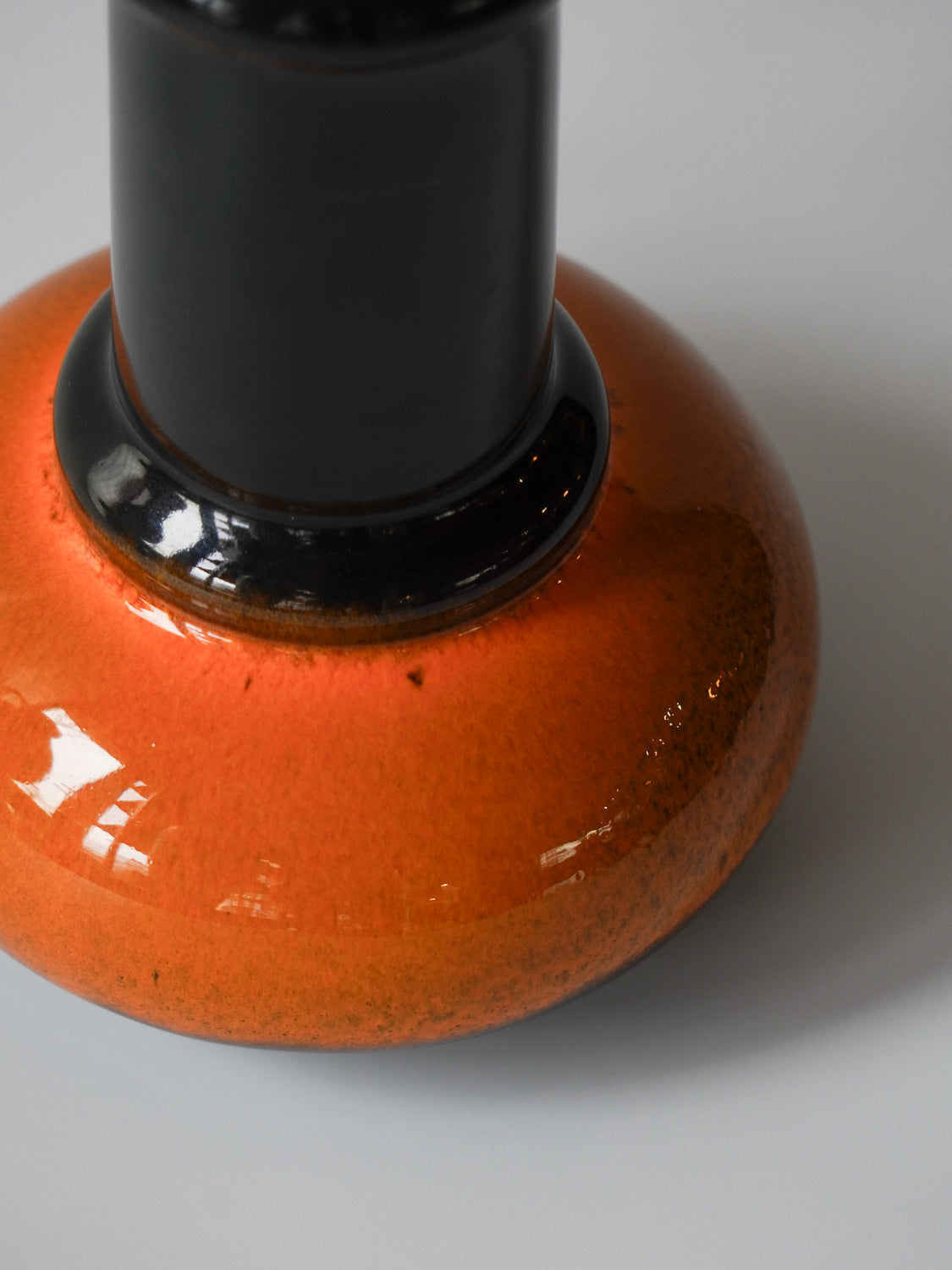 つややかなジェットブラックと、光沢のあるビタミンカラーのオレンジが見事に調和した、モダンで個性的なボトル型花器です。
