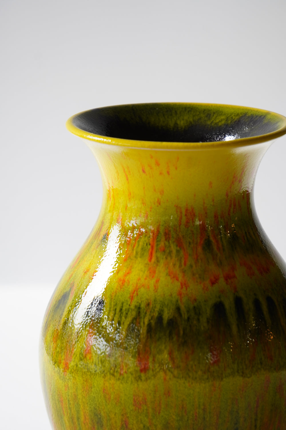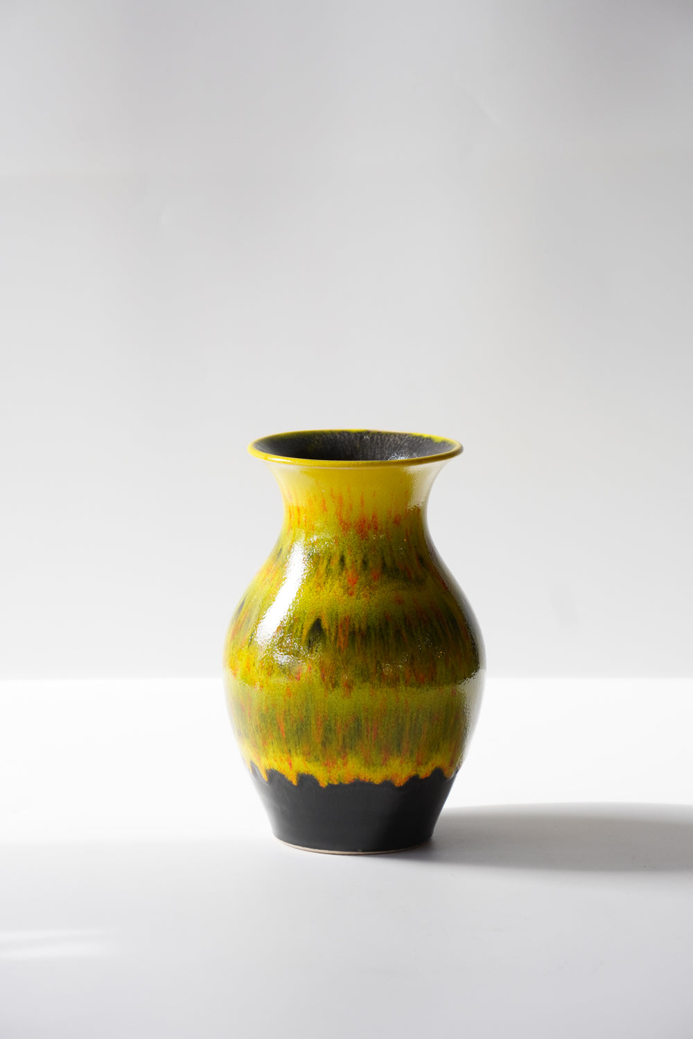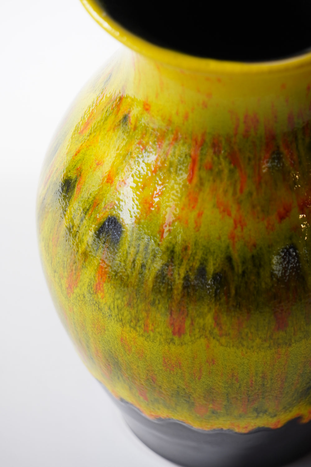 艶やかなライムイエローとオリーブグリーンの釉薬が、黒い地肌に向かって縦に流れ落ちるように施され、その中に赤やオレンジの閃光が垣間見える、ドラマチックな色彩が特徴です。