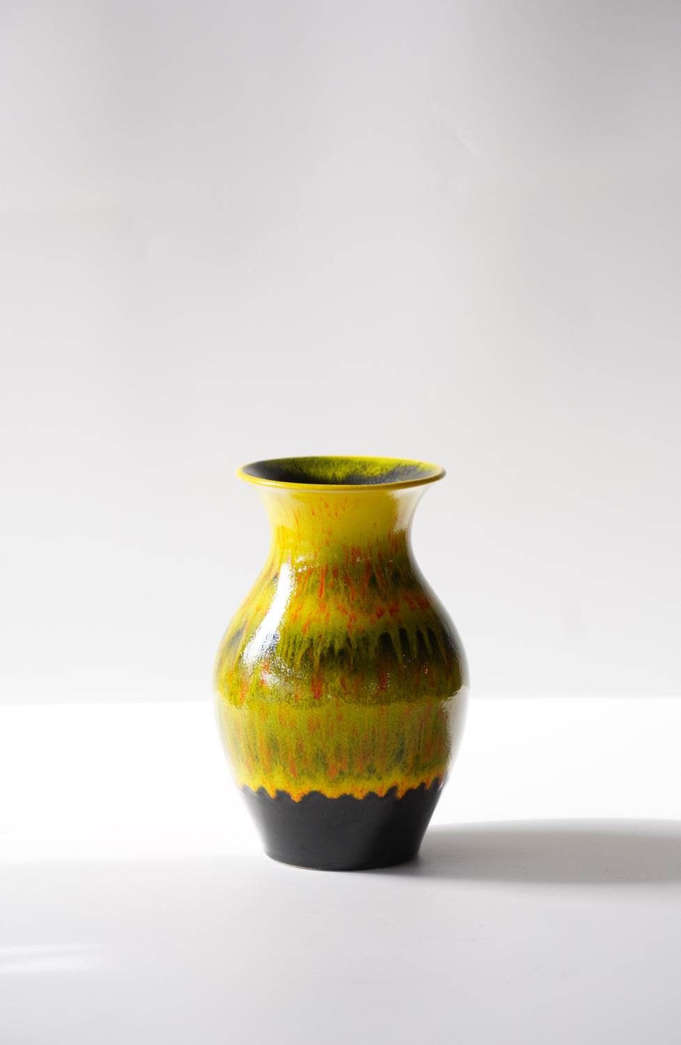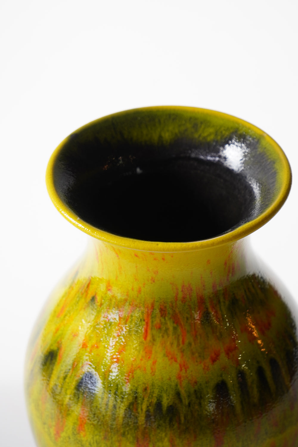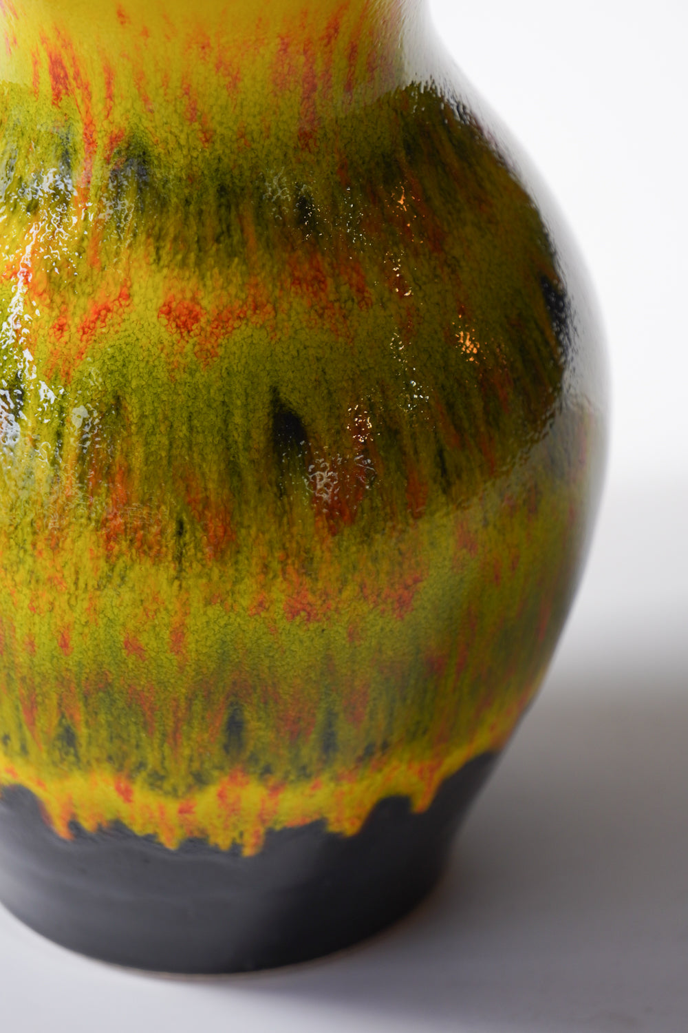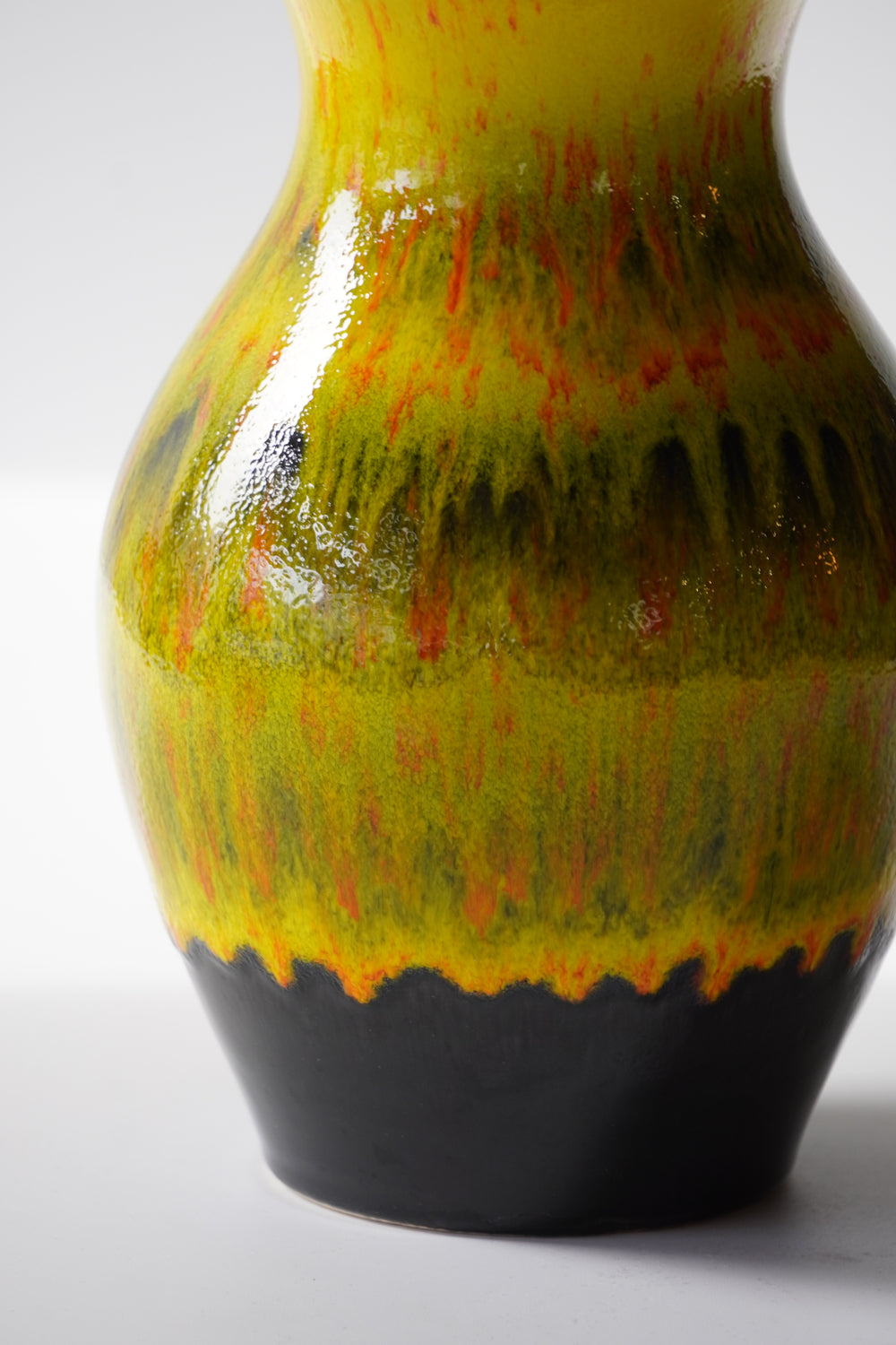 艶やかなライムイエローとオリーブグリーンの釉薬が、黒い地肌に向かって縦に流れ落ちるように施され、その中に赤やオレンジの閃光が垣間見える、ドラマチックな色彩が特徴です。