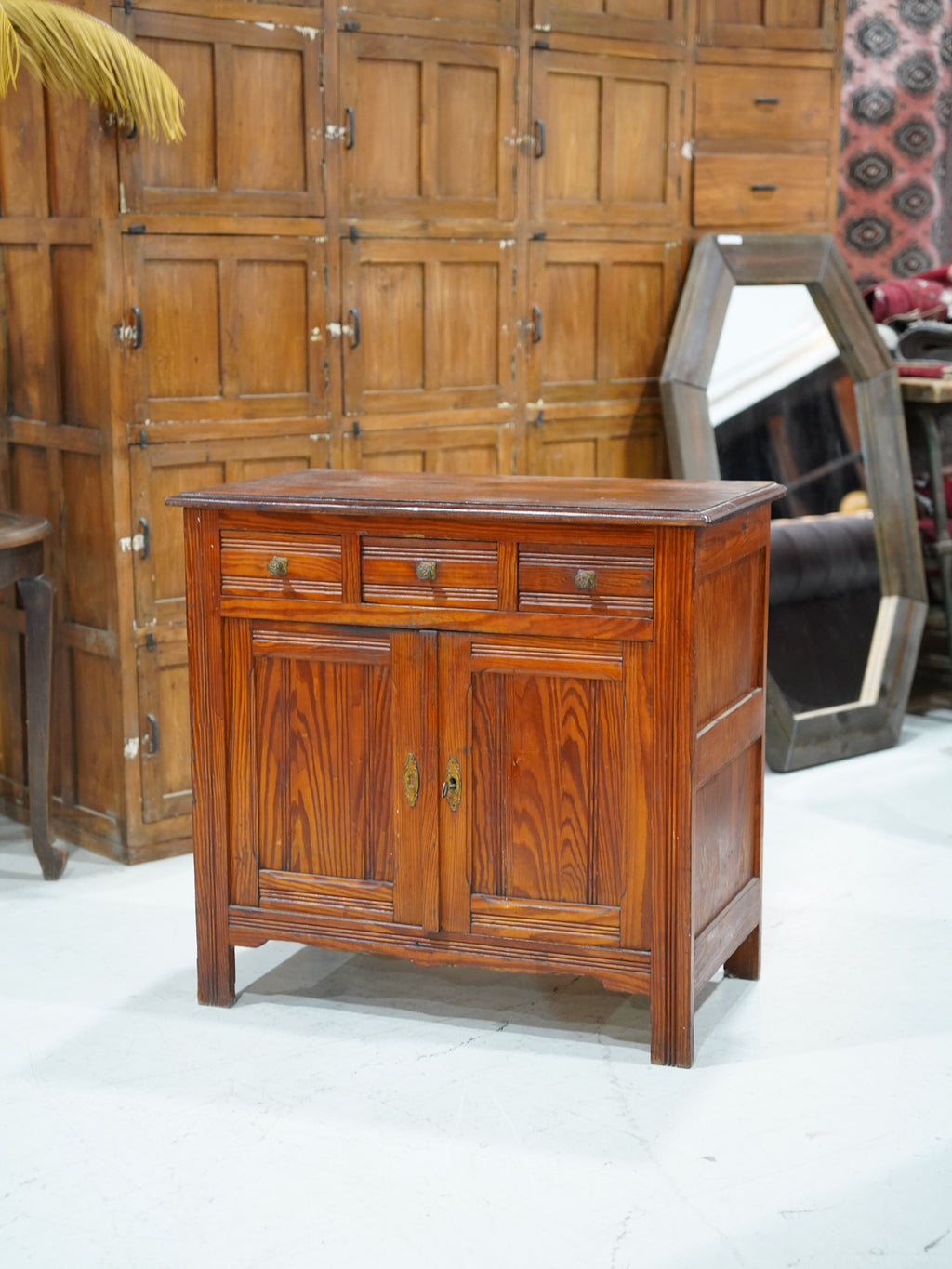 時を重ねた木目の温もりと手仕事を感じる繊細な装飾が施されたウッドキャビネット