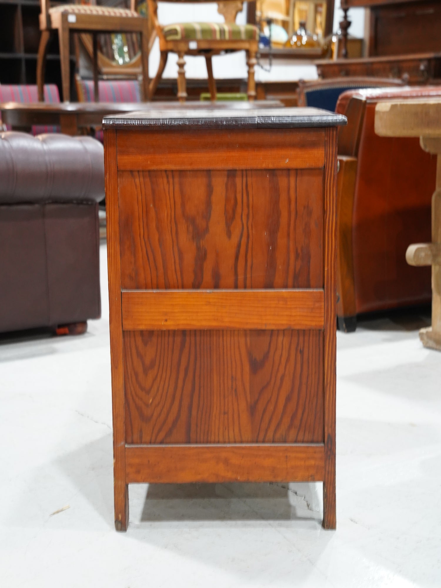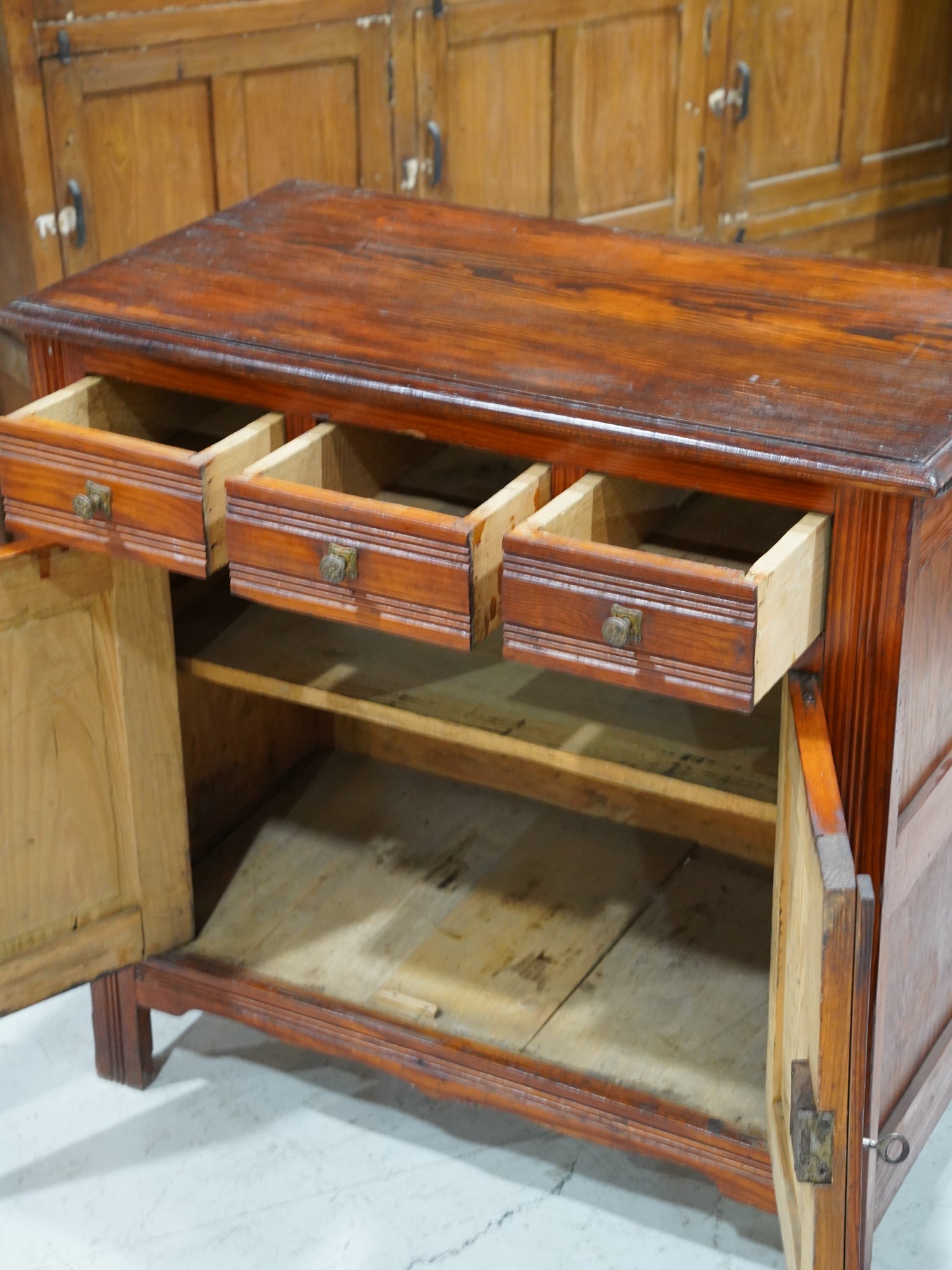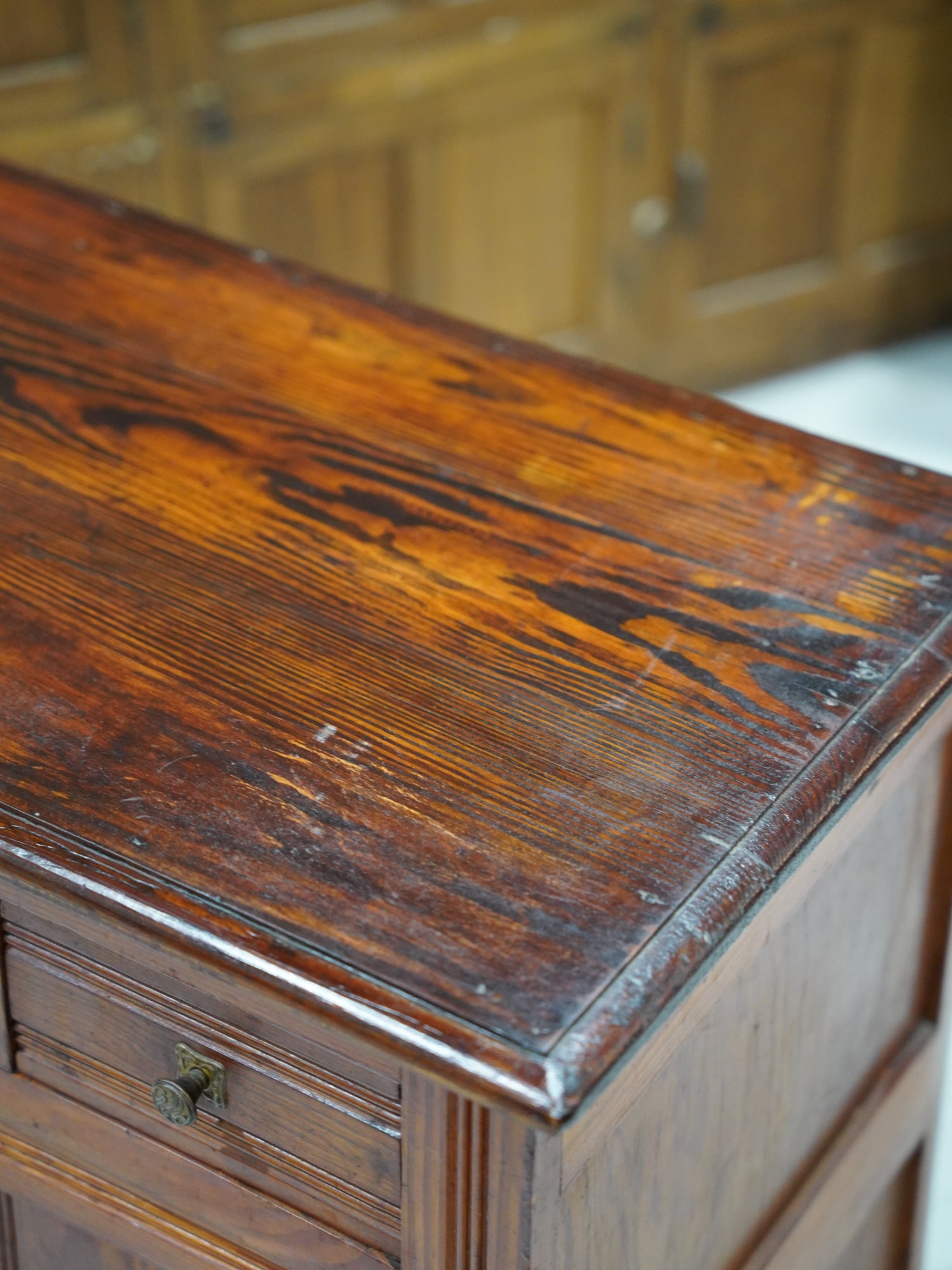 シンプルなフォルムながら、天板や扉、引き出しのフレーム部分に施されたモールディング(装飾的な縁取り)が、職人の丁寧な手仕事を物語っています。引き出しと扉の金具も、全体の雰囲気に馴染み、落ち着いたアクセントになっています。