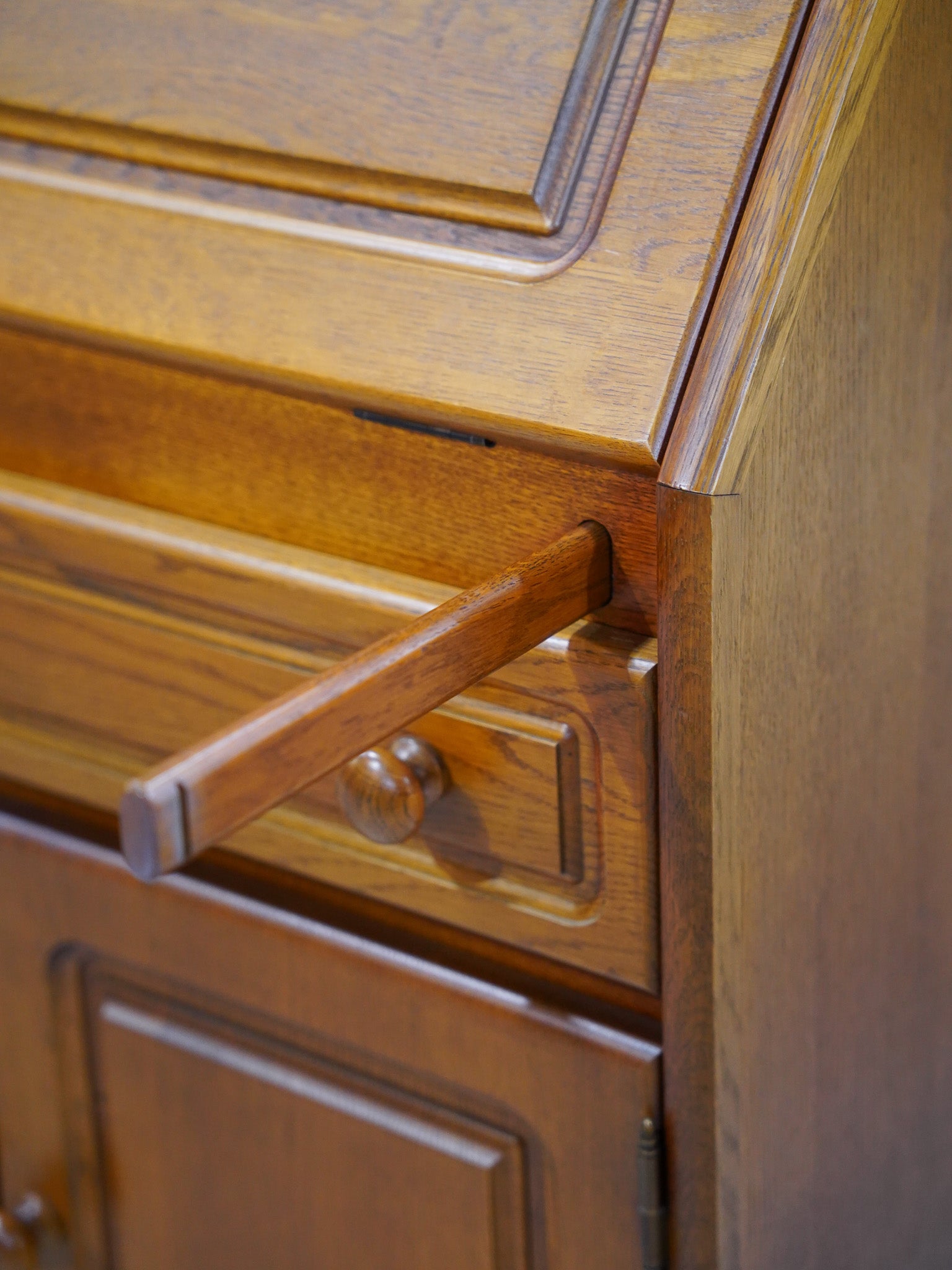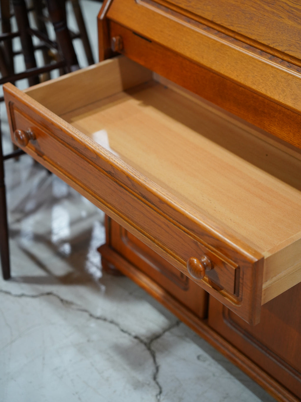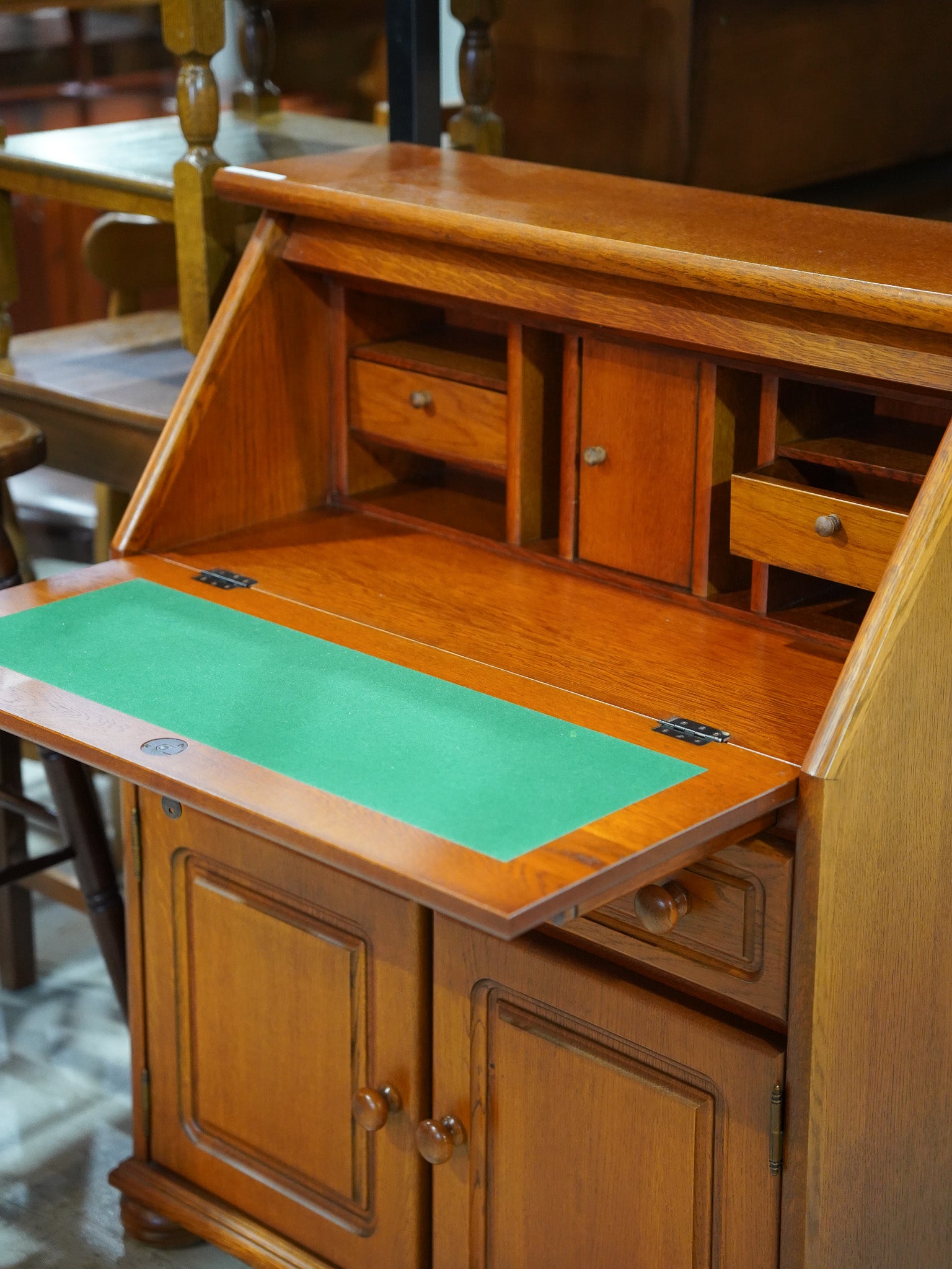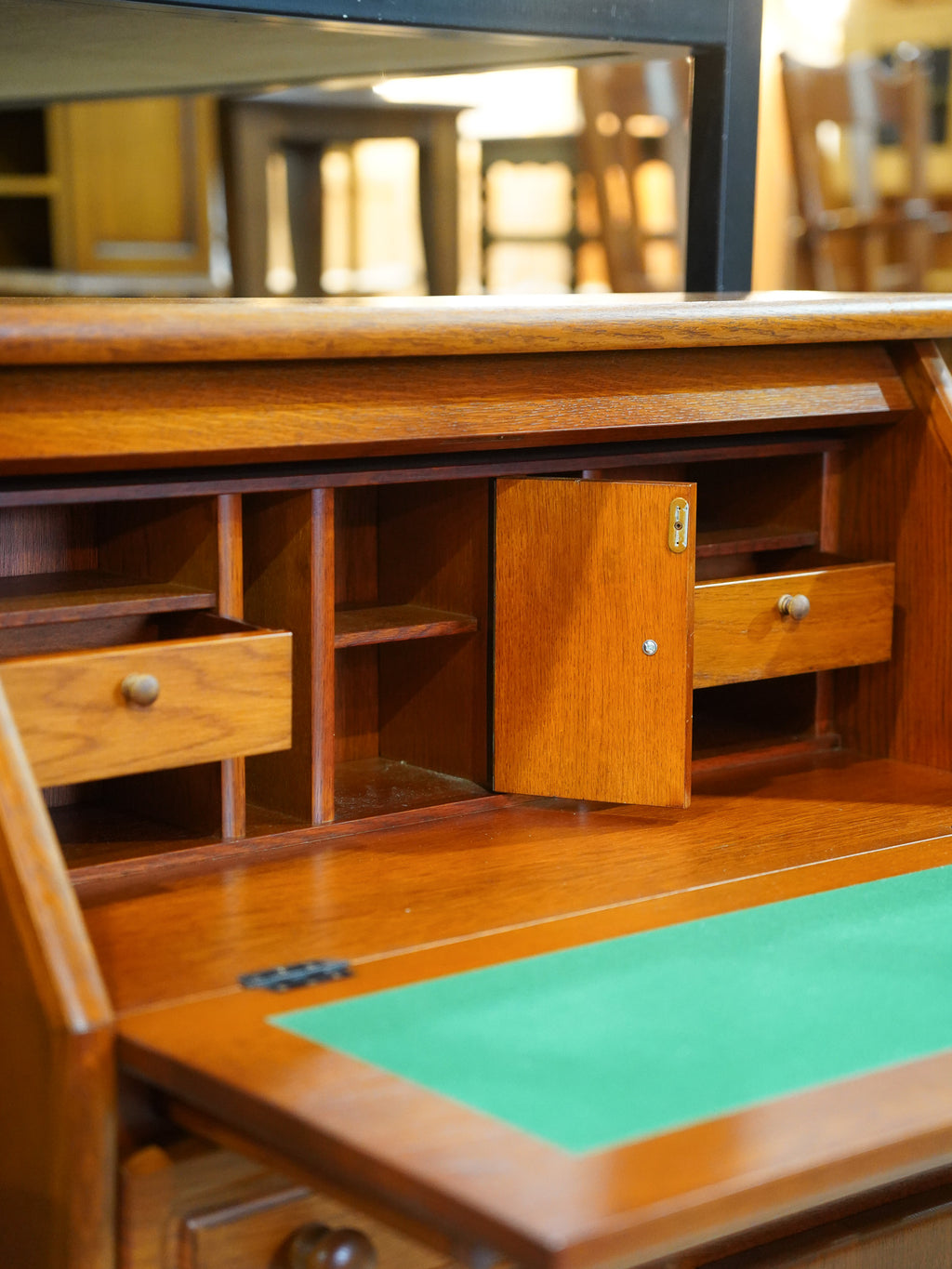 上部の扉を開くと、手前に倒れてフラットなライティングスペースが現れます。内側には小物入れや引き出しが付いており、文房具や書類の整理に便利です。このデスクスペースには、落ち着いたグリーンのフェルトが張られており、書き物をする際に心地よい感触を提供します。