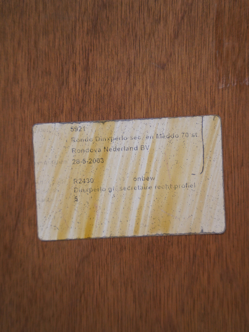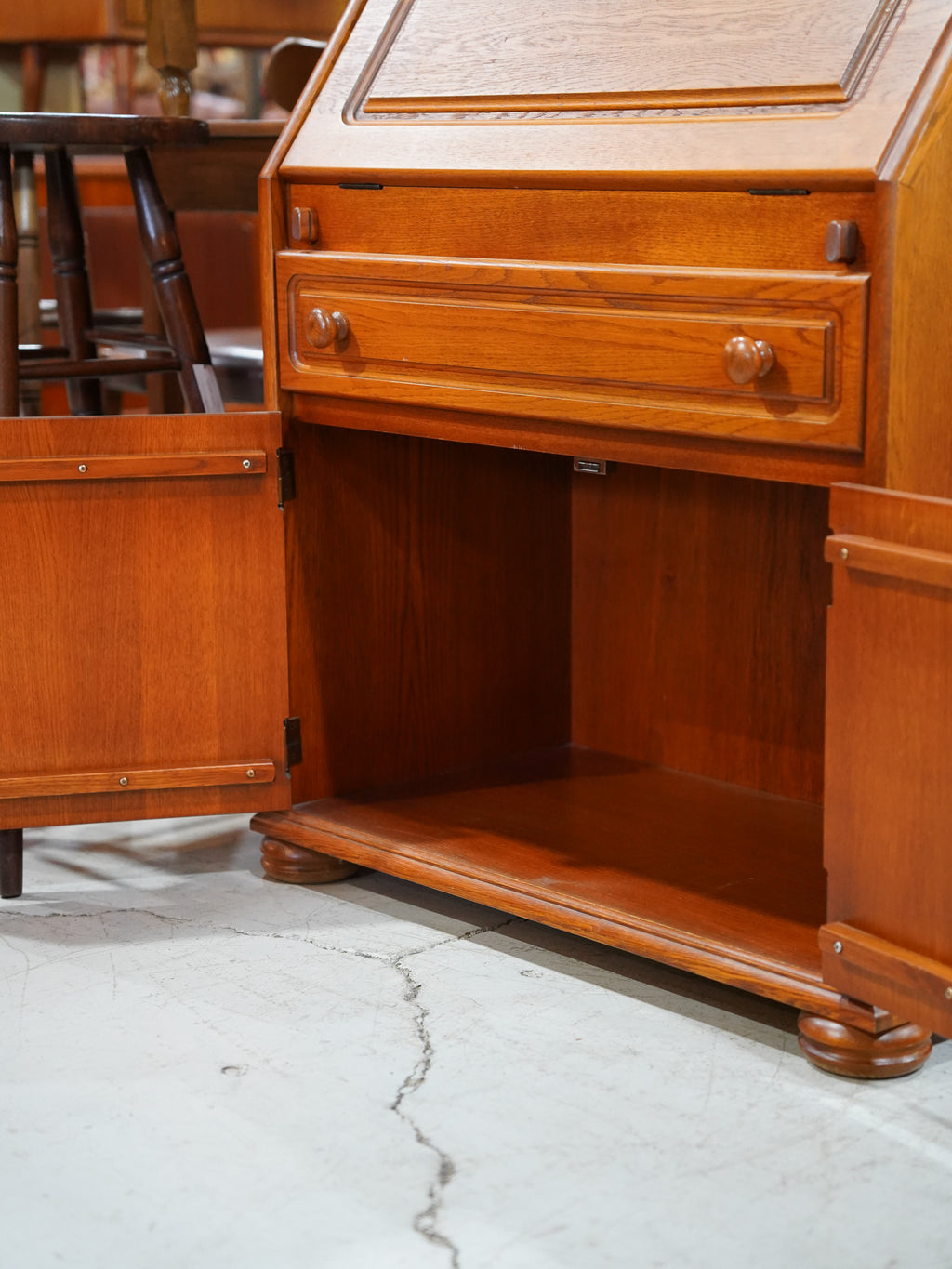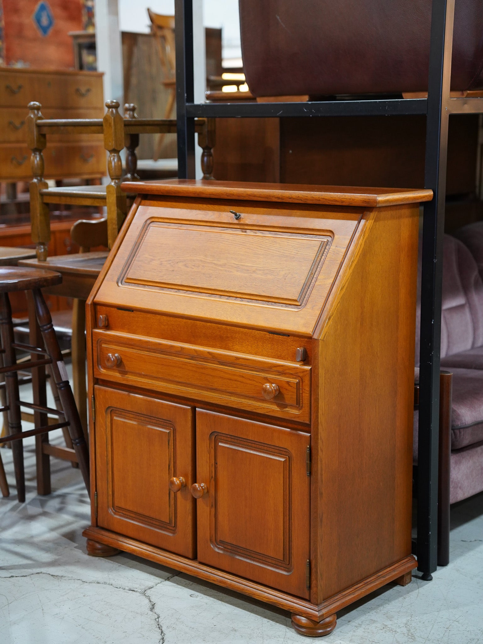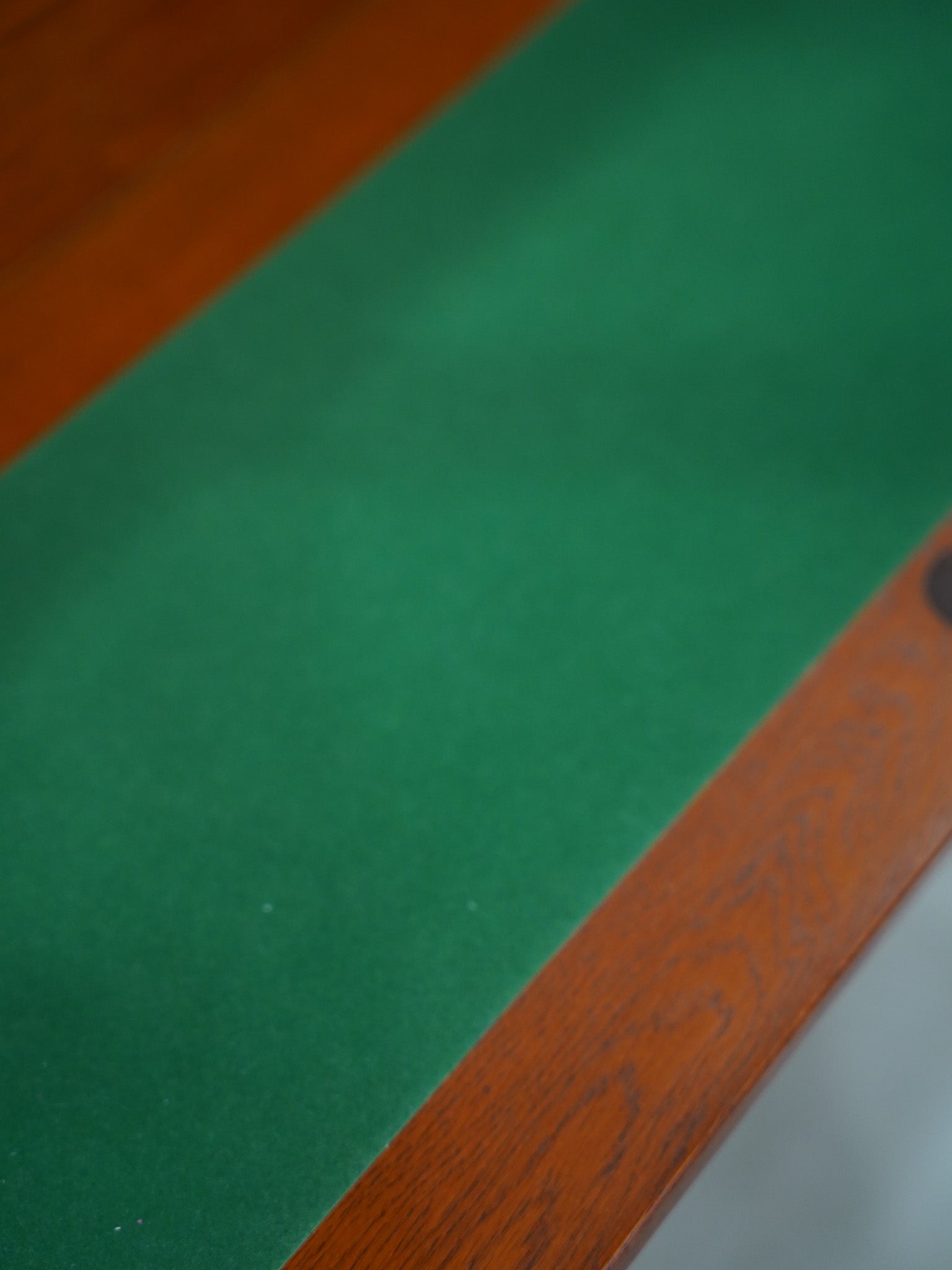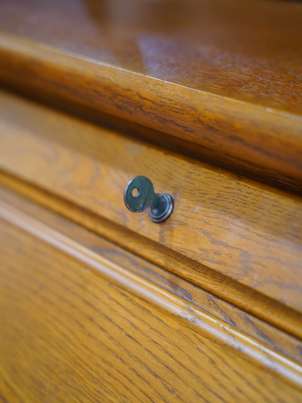 上部の扉を開くと、手前に倒れてフラットなライティングスペースが現れます。内側には小物入れや引き出しが付いており、文房具や書類の整理に便利です。このデスクスペースには、落ち着いたグリーンのフェルトが張られており、書き物をする際に心地よい感触を提供します。