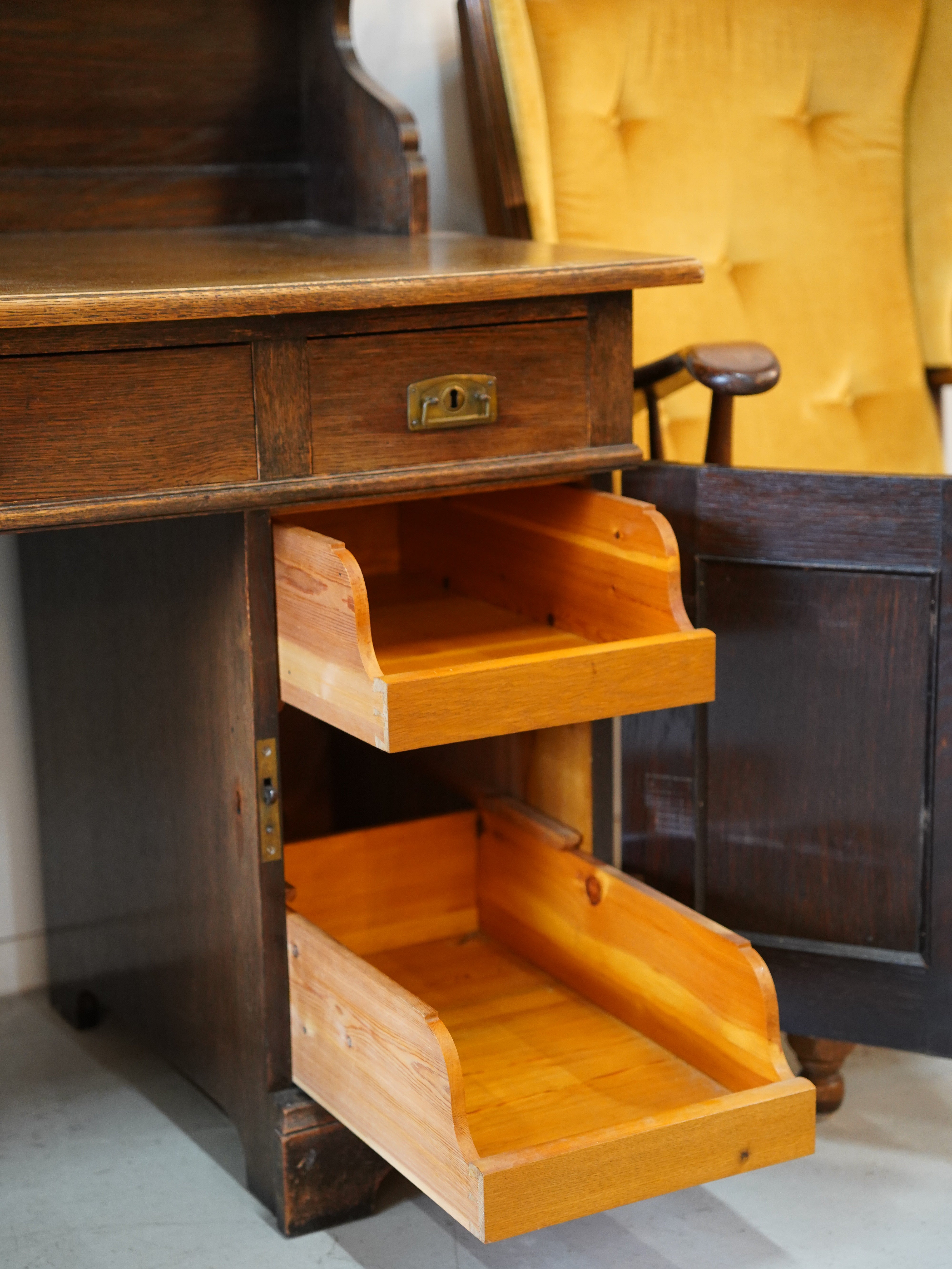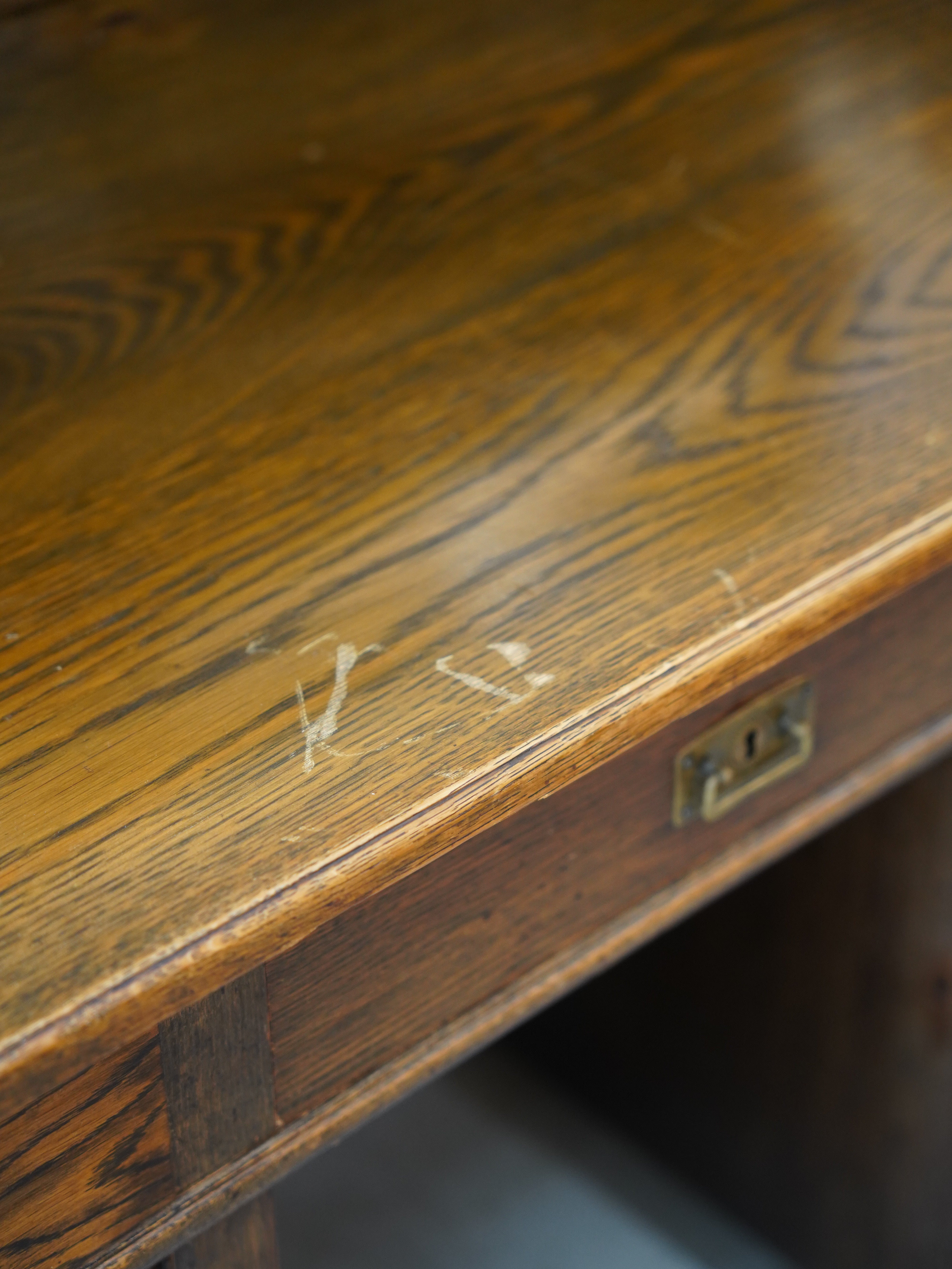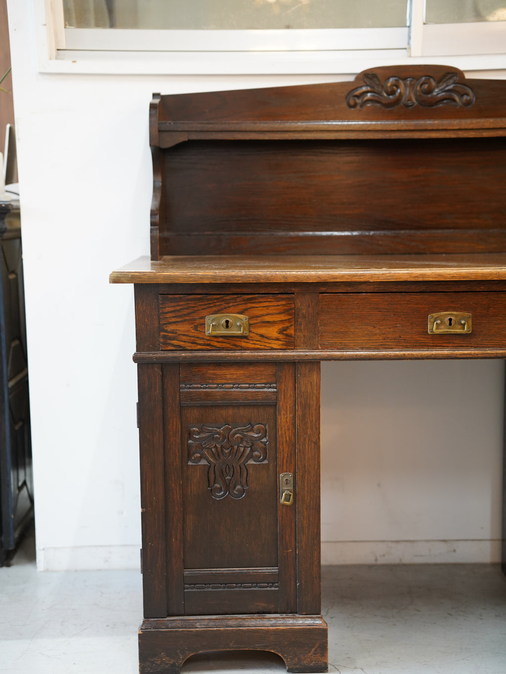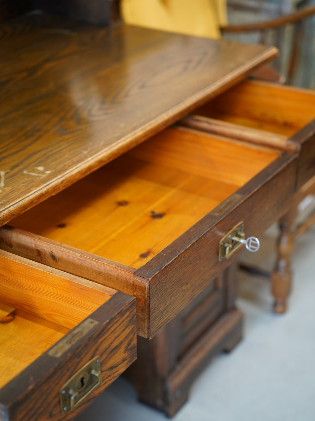 重厚なオーク材の質感が際立つ、クラシックな雰囲気のアンティークデスクです。