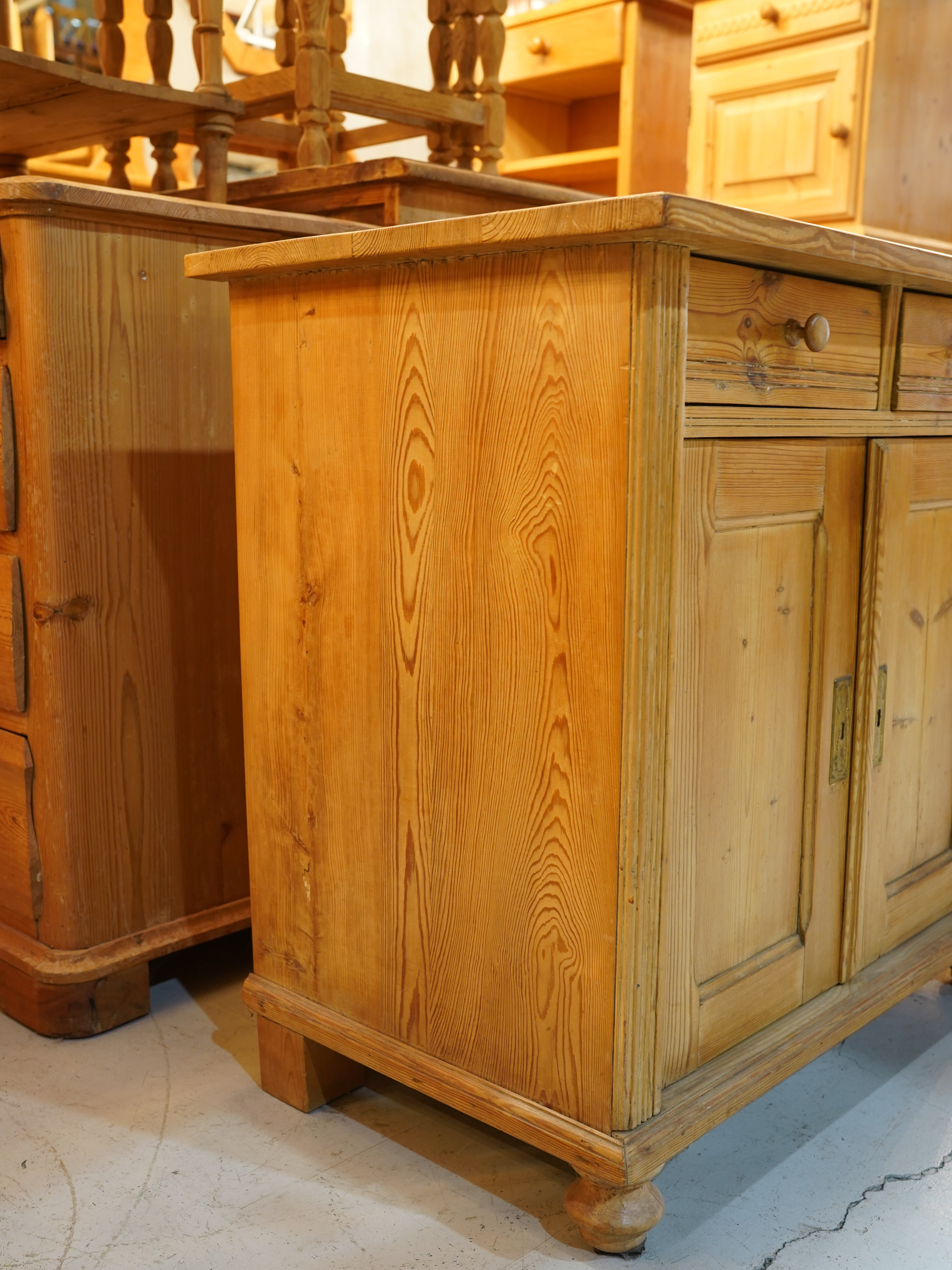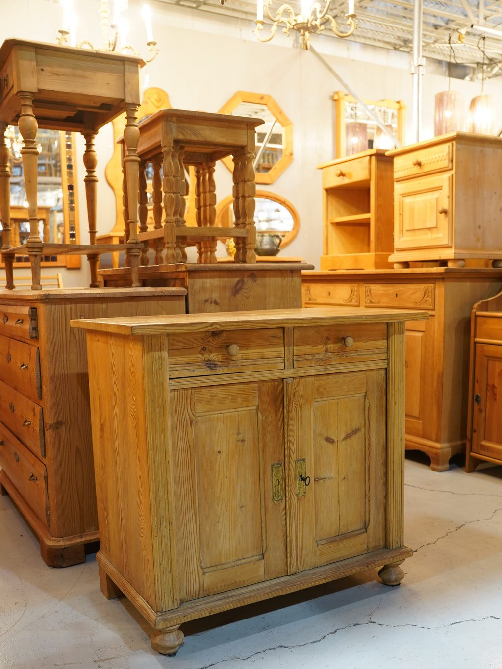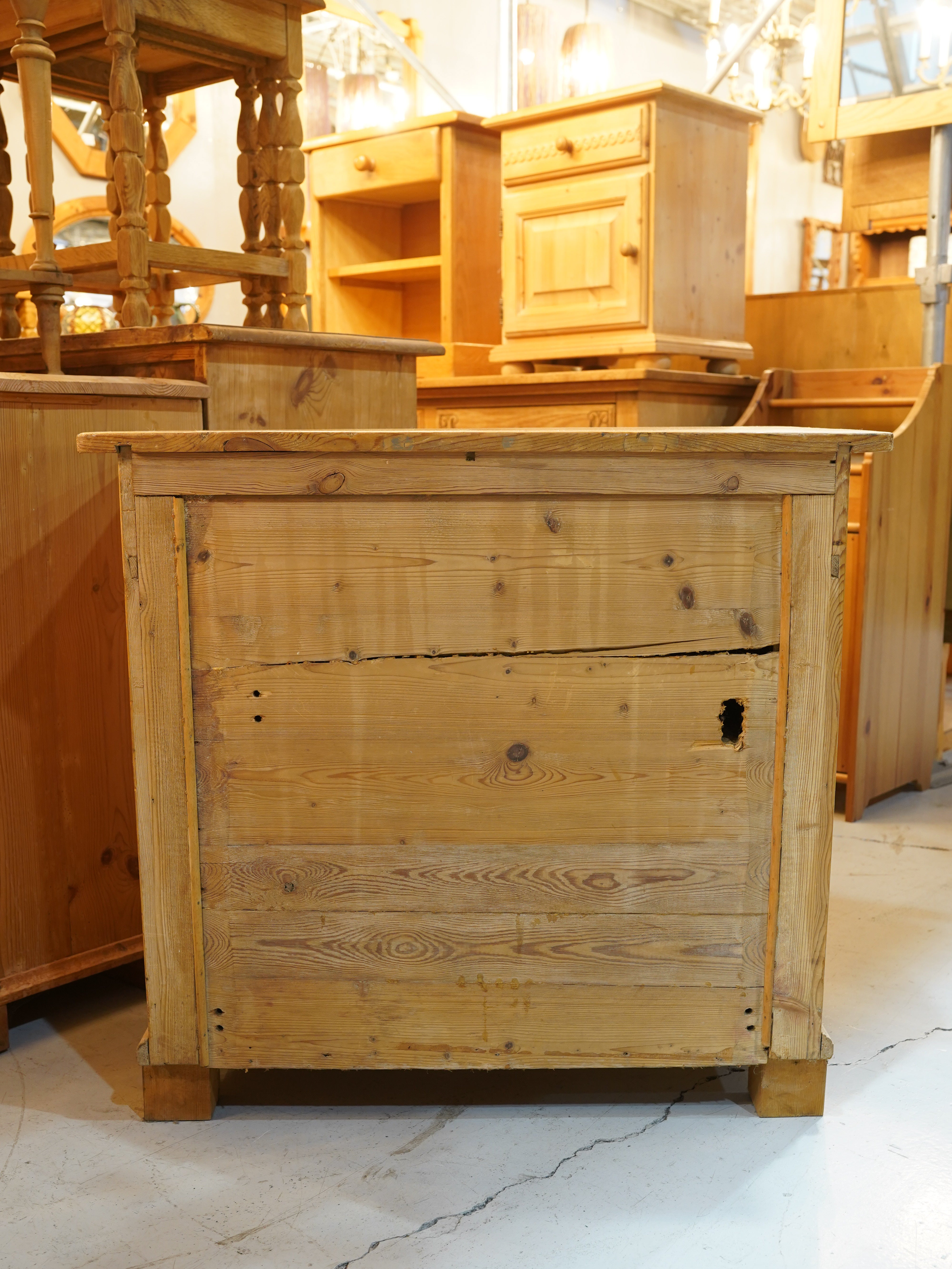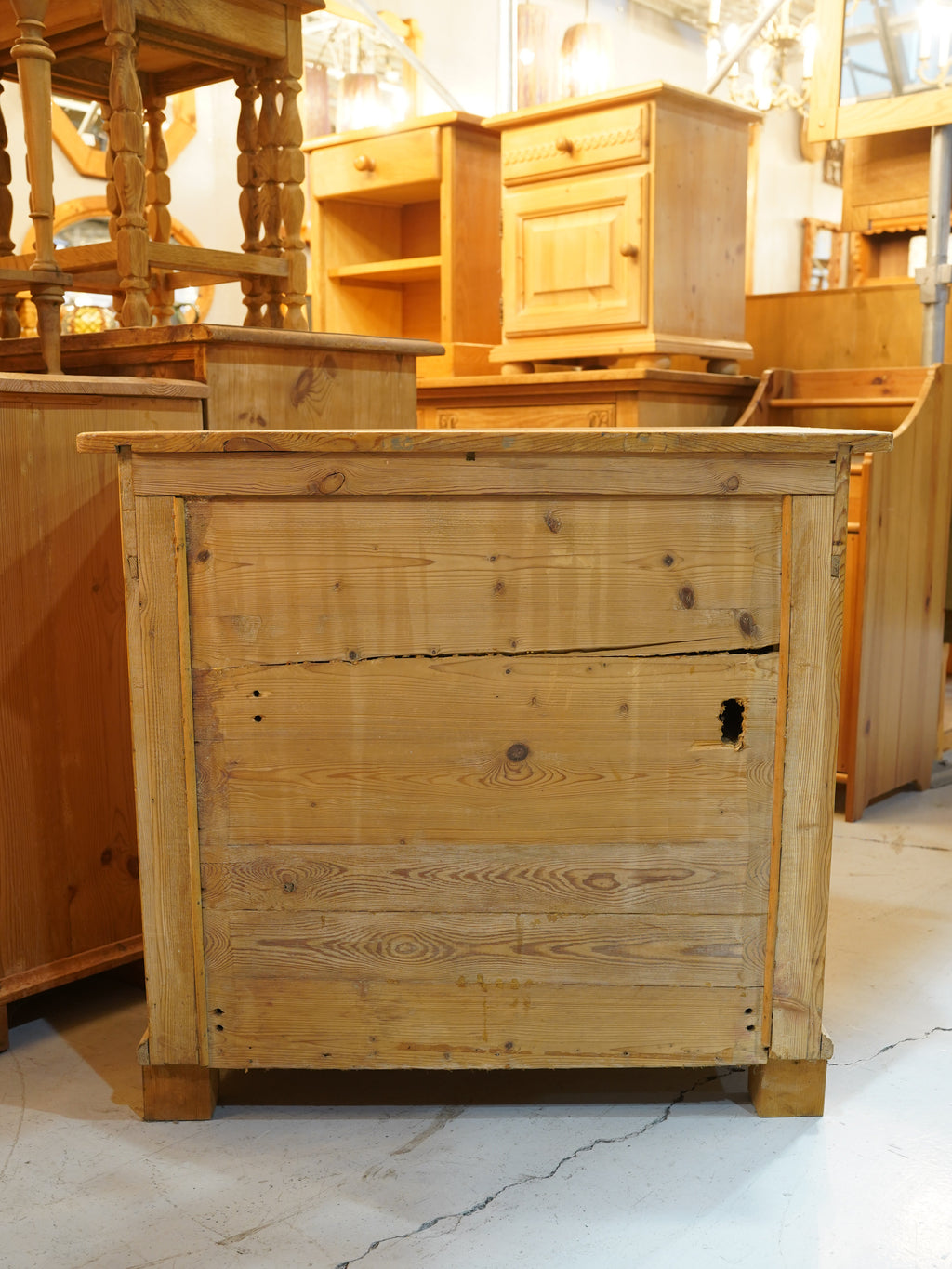 パイン材特有の温かみのある木目と、経年によって深みを増した飴色が美しい風合いを生み出しています。シンプルなデザインながらも、上下に施されたモールディングや、真鍮製の引手金具、そして丸く可愛らしい脚部が、素朴な魅力と手仕事の温かさを感じさせます。