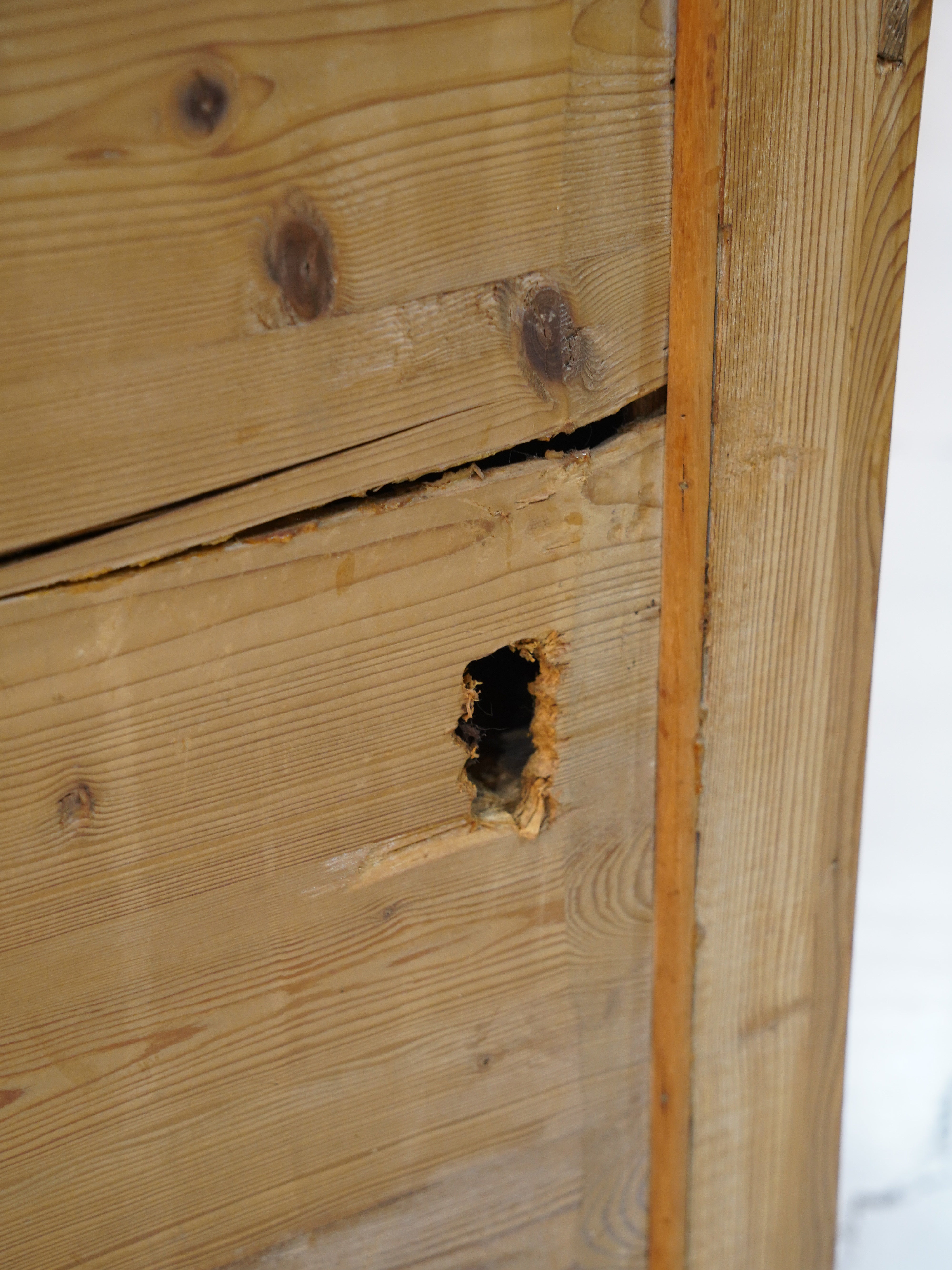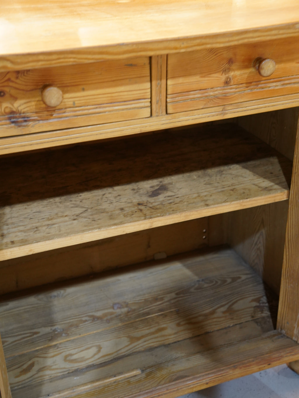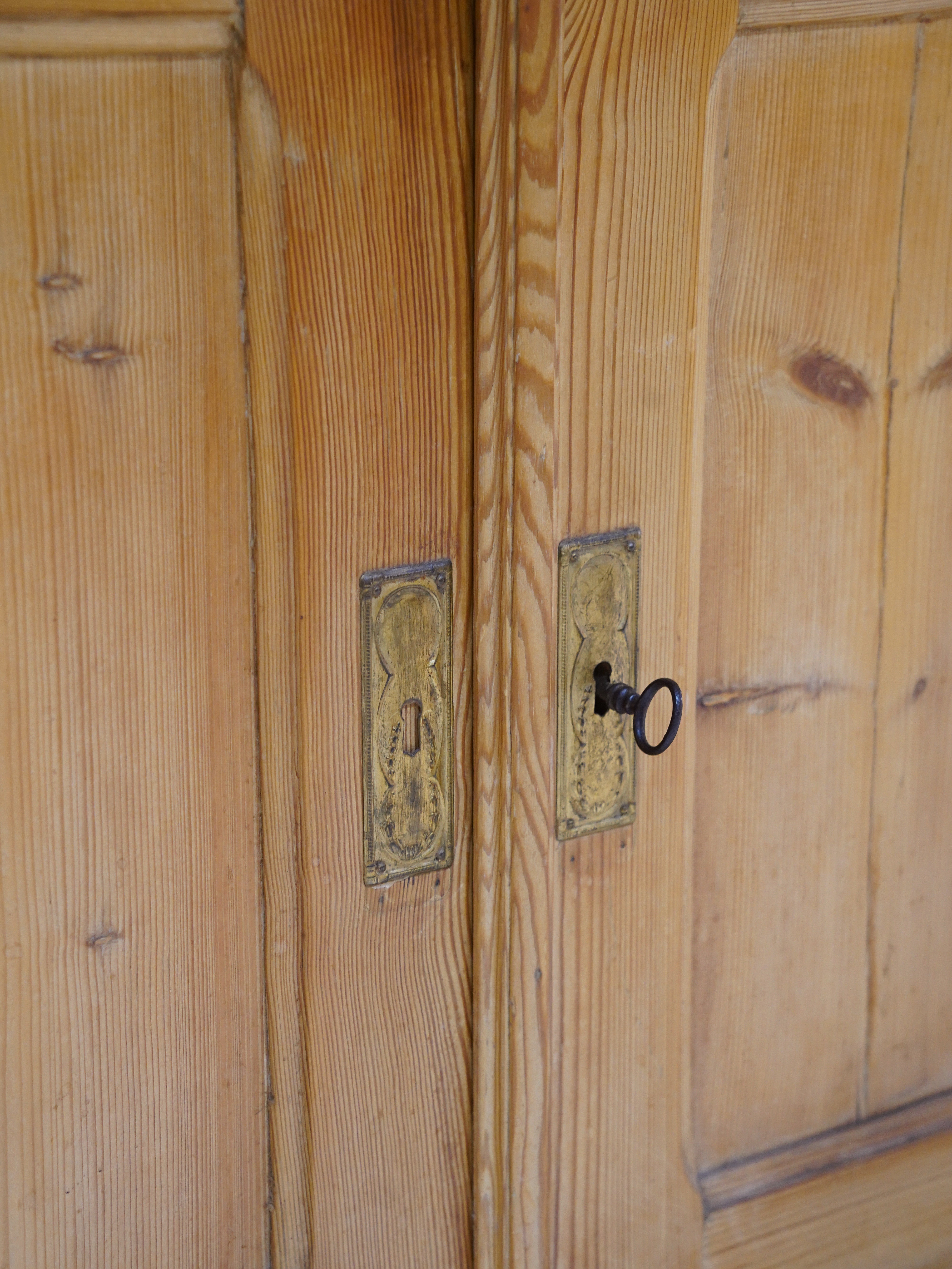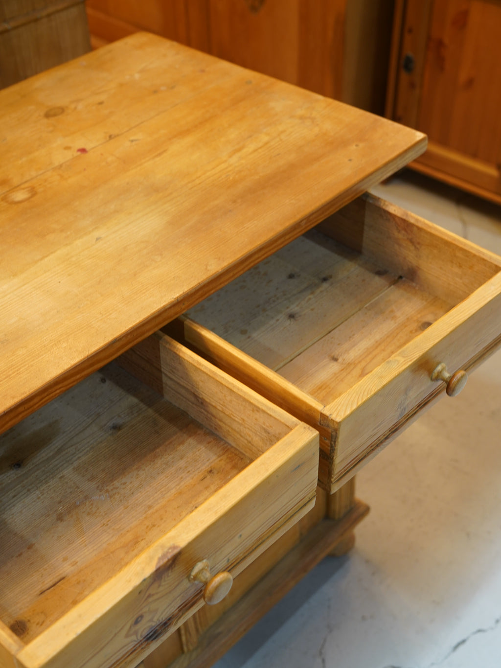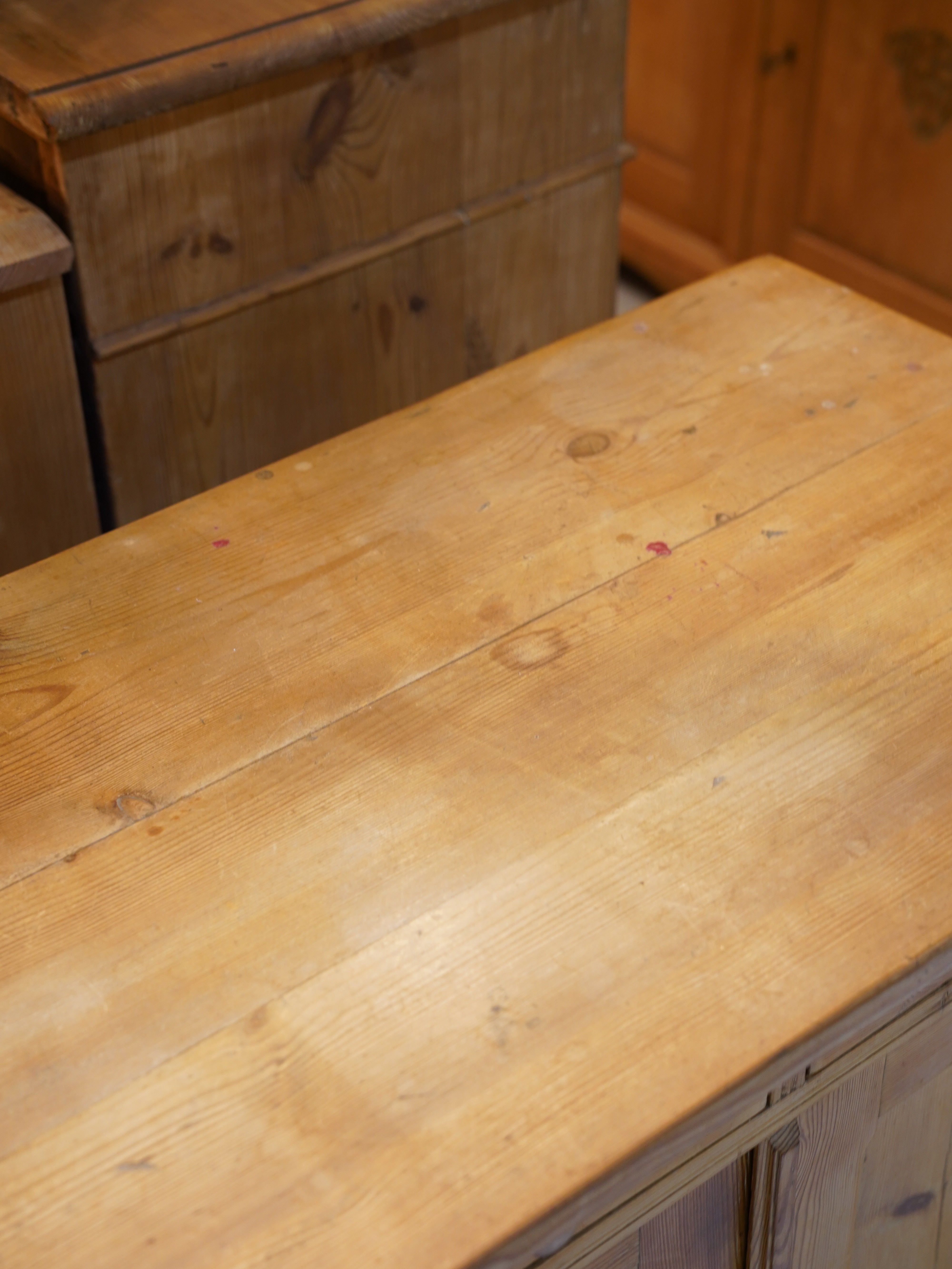 パイン材特有の温かみのある木目と、経年によって深みを増した飴色が美しい風合いを生み出しています。シンプルなデザインながらも、上下に施されたモールディングや、真鍮製の引手金具、そして丸く可愛らしい脚部が、素朴な魅力と手仕事の温かさを感じさせます。