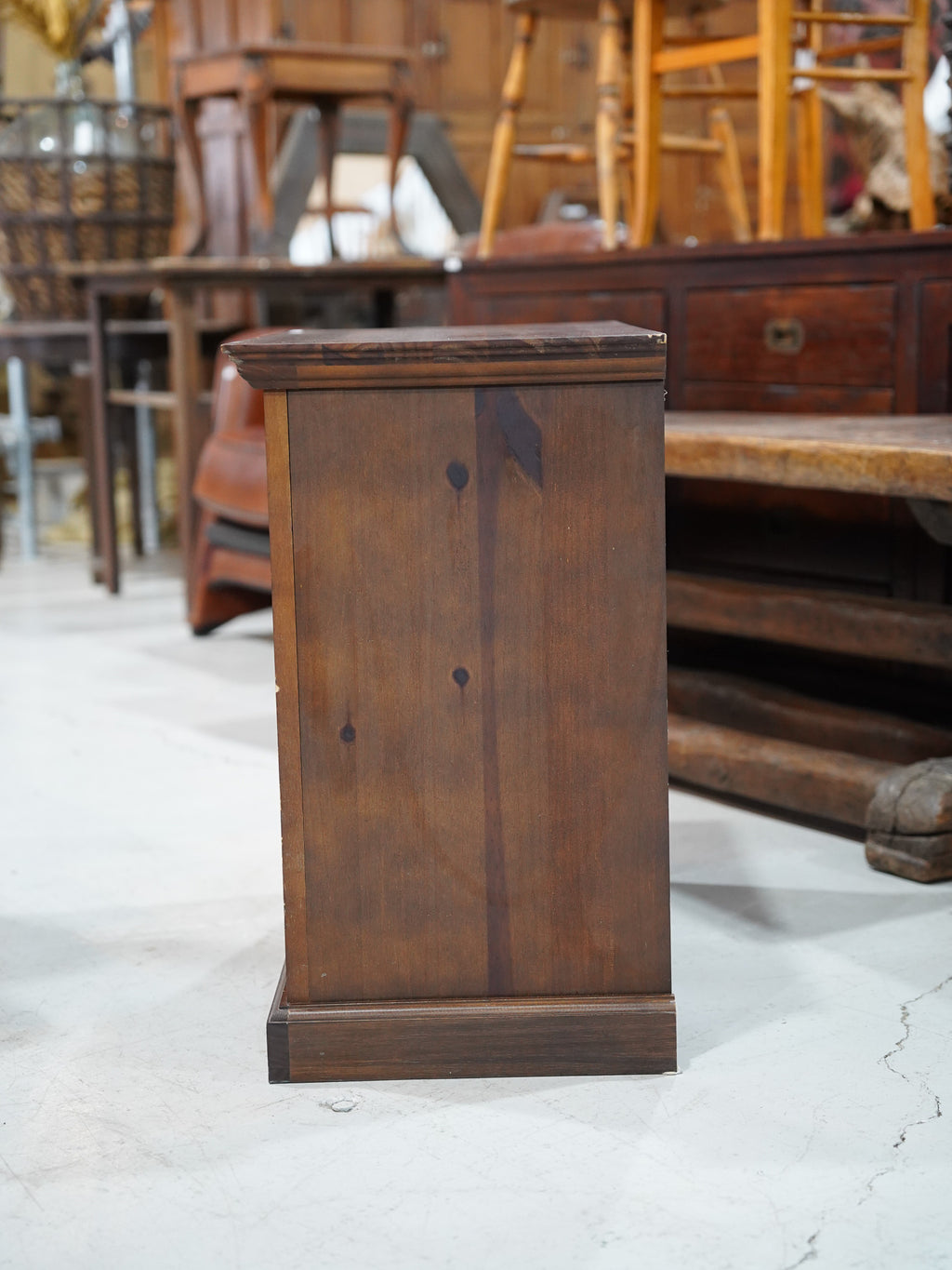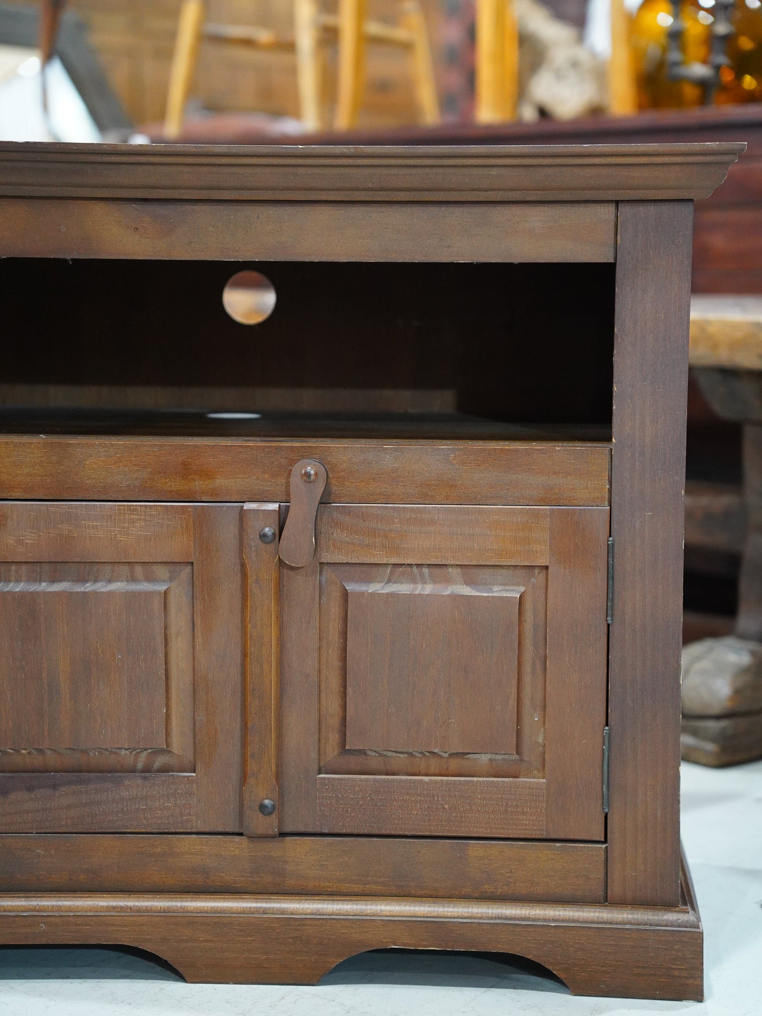 重厚感のある木材の風合いが魅力的な、コンパクトサイズのキャビネットです。深みのあるブラウンの色合いと、直線的で堅牢なデザインが、空間に落ち着きと安定感をもたらします。