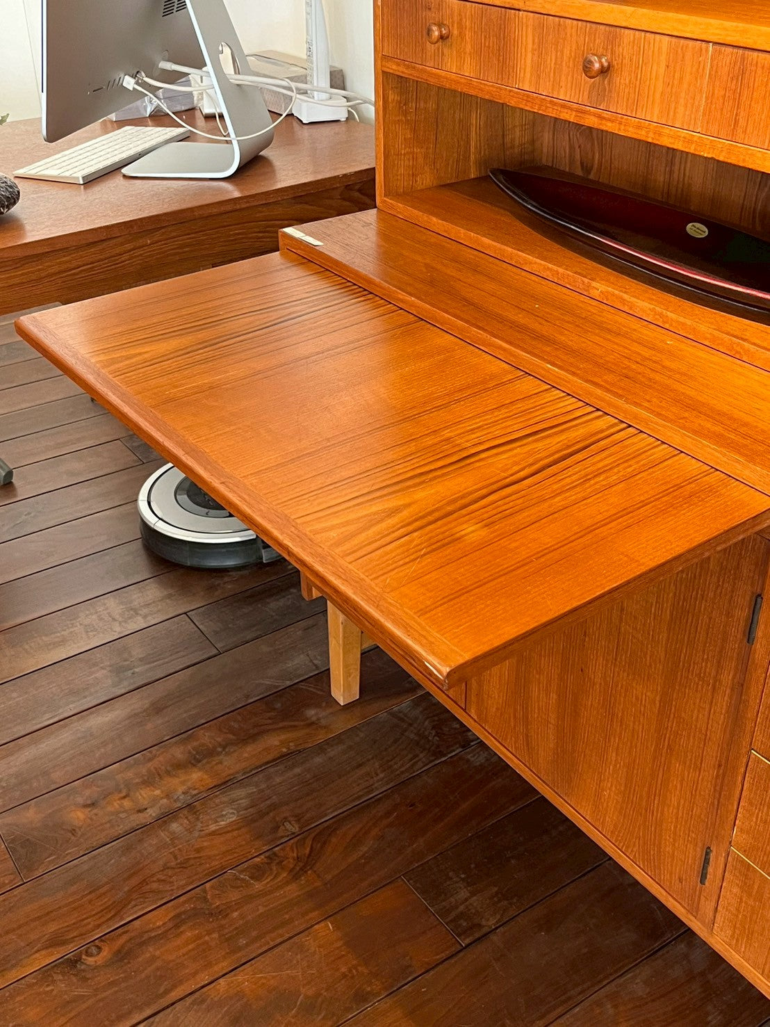 チーク材ならではの深みある色味と美しい木目、そして経年による味わいの変化も楽しめる北欧ヴィンテージらしい佇まい。収納・ディスプレイ・デスク機能を兼ね備えた、空間の主役となるキャビネットです。