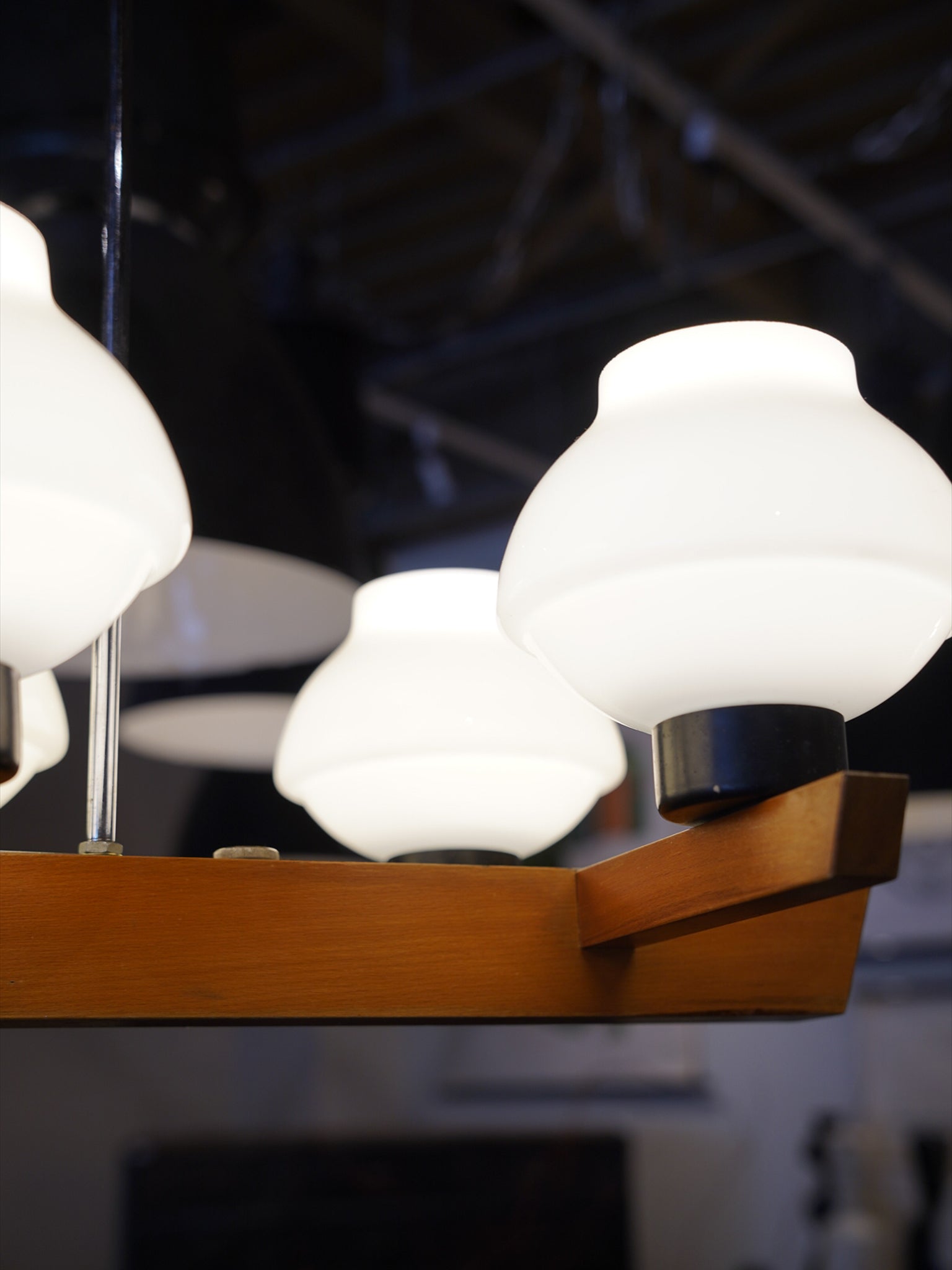 等間隔に配置された6つのガラスシェードは、柔らかな光を広範囲に拡散し、ダイニングテーブルやリビングスペースを温かく均一に照らします。特に、ウッドとガラス、そして金属の異なる素材の組み合わせが、空間に深みとリズムをもたらします。