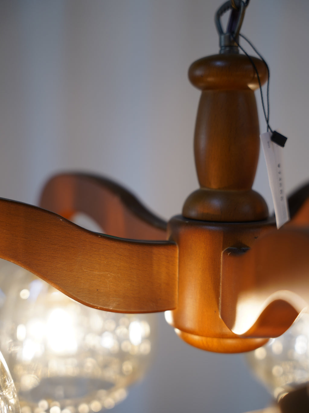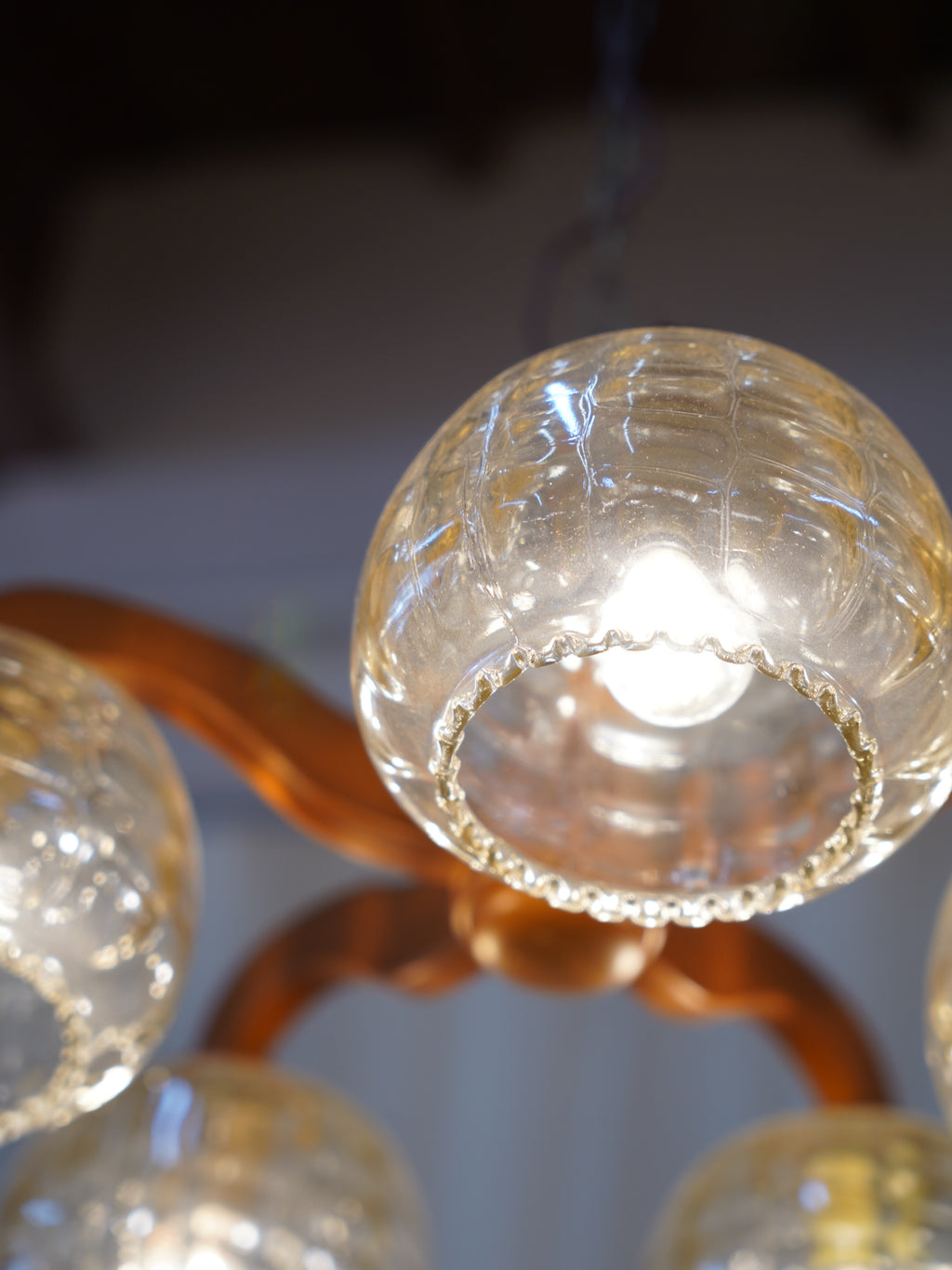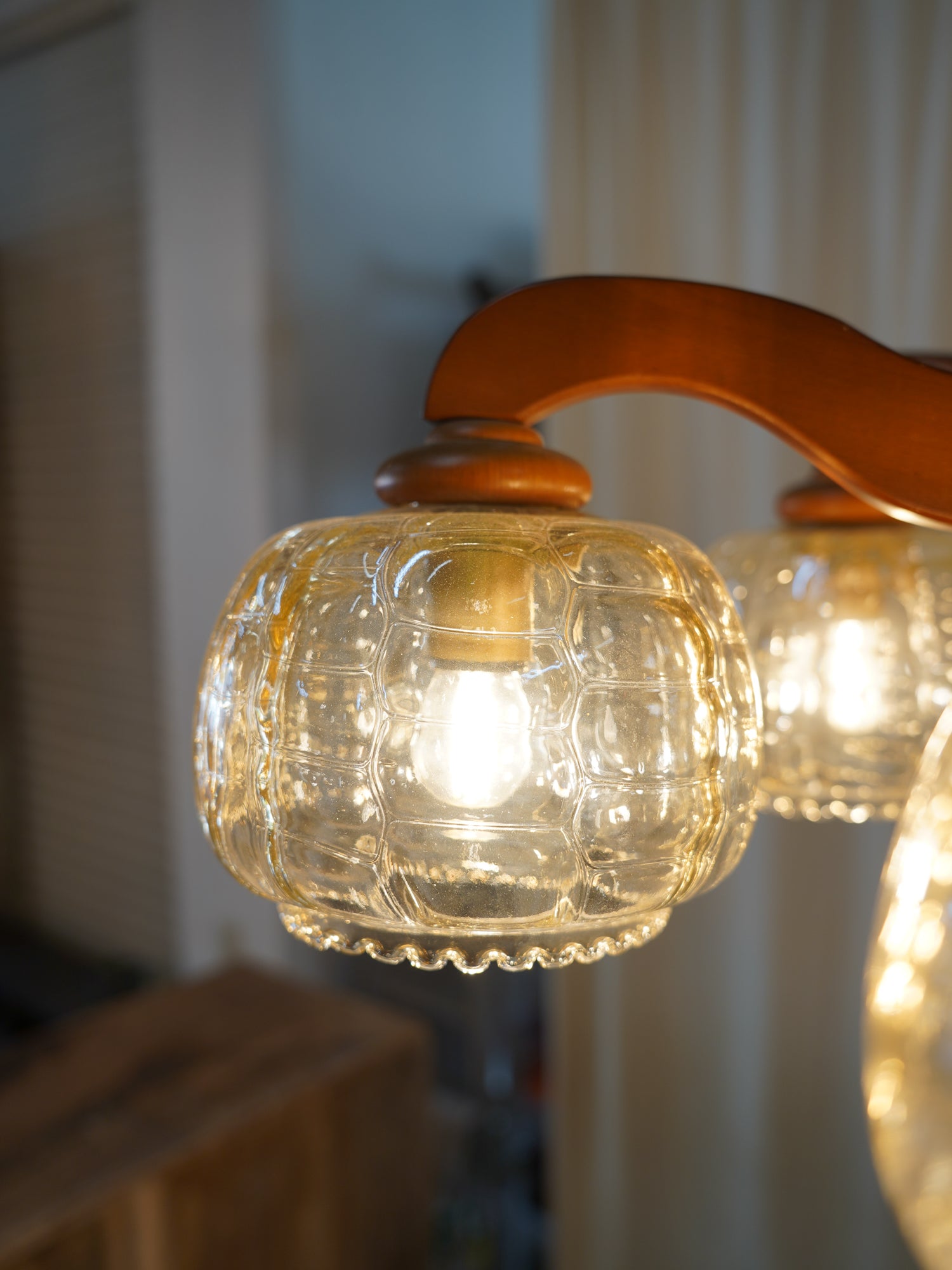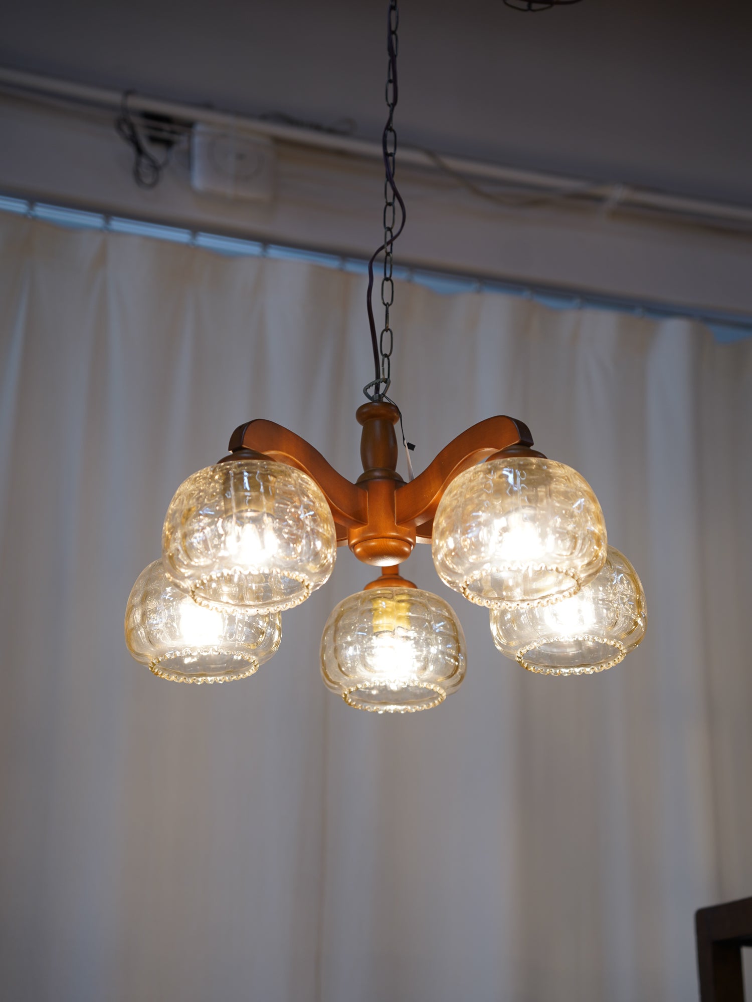 温かみのあるウッドのフレームと、独特の気泡が魅力のアンバーガラスシェードを組み合わせた、5灯式のシャンデリアです。
