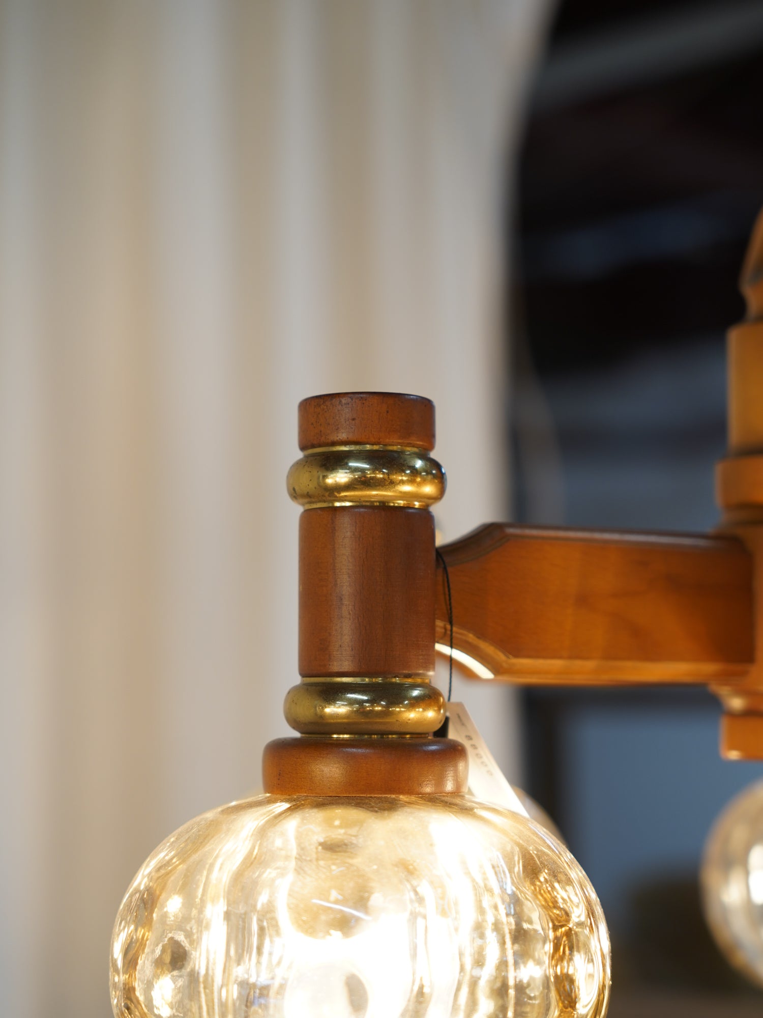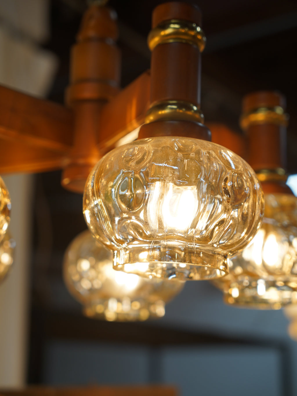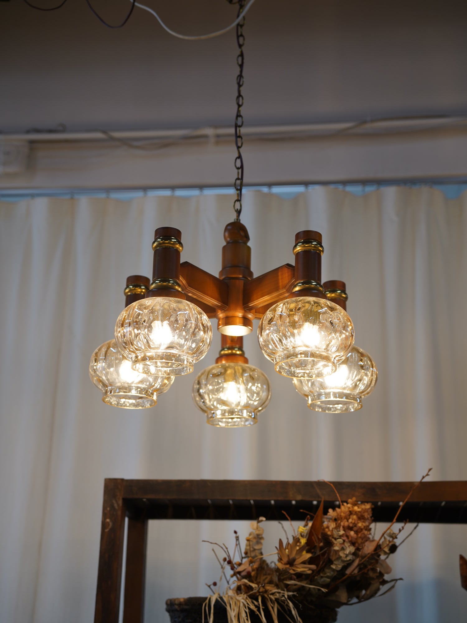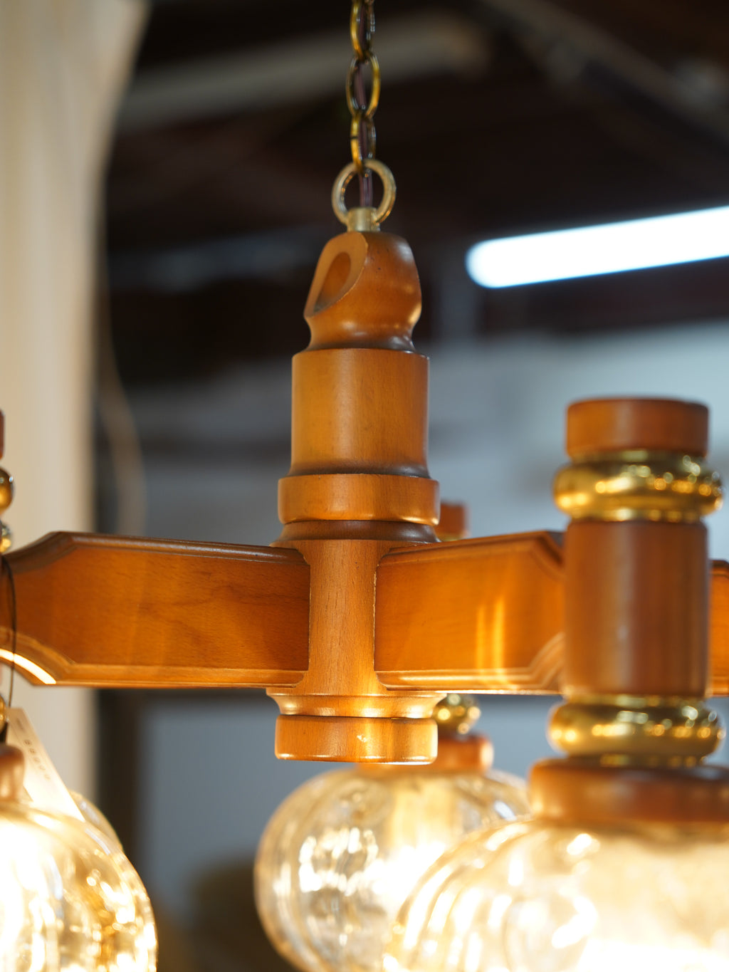 温もりあふれるウッドと、クラシカルなガラスシェードの組み合わせが美しいシャンデリアです。