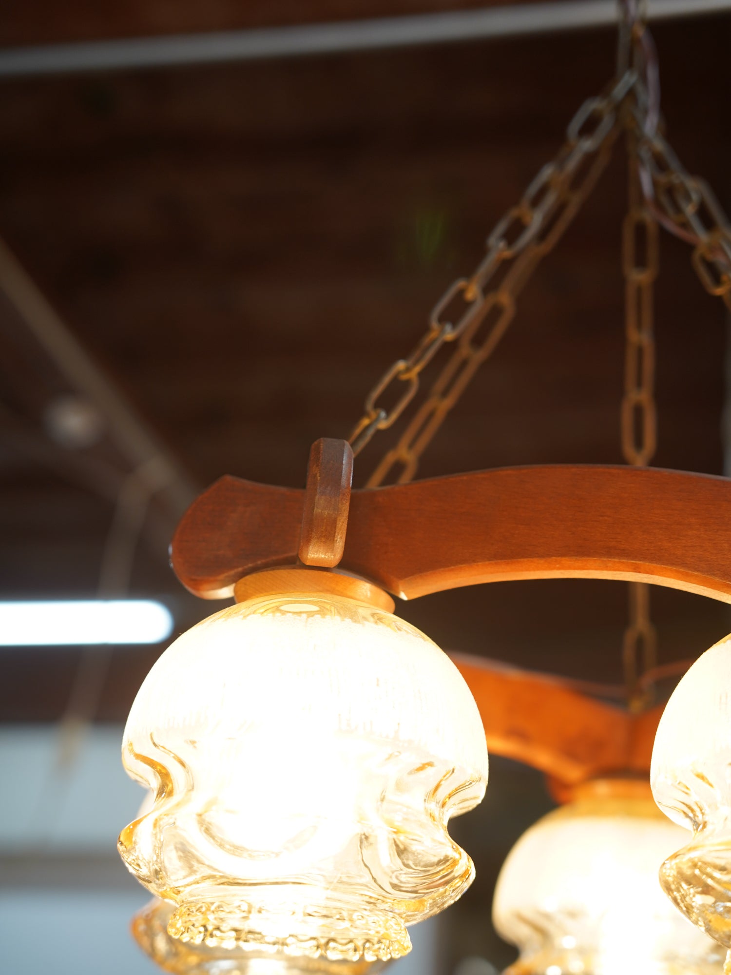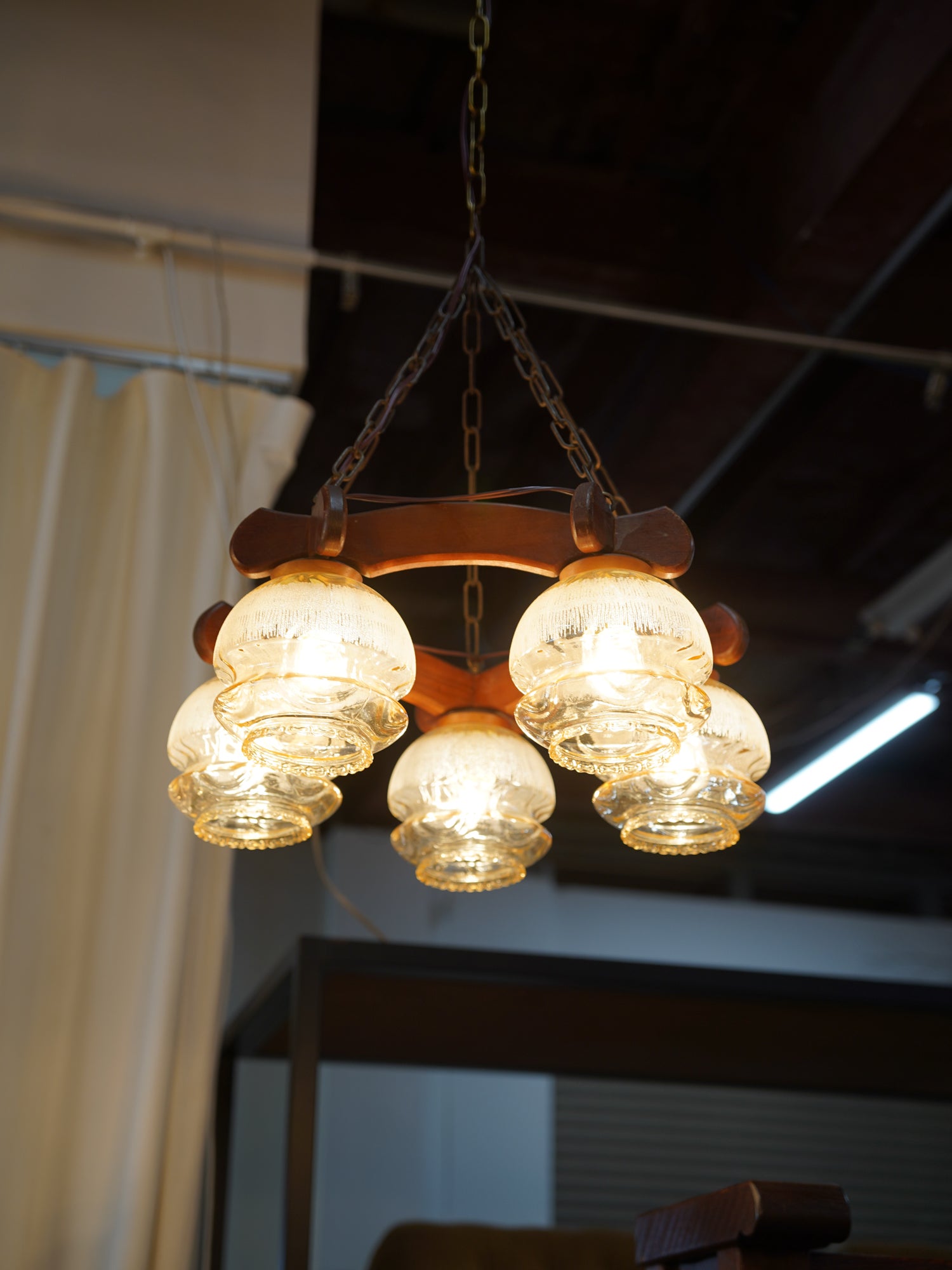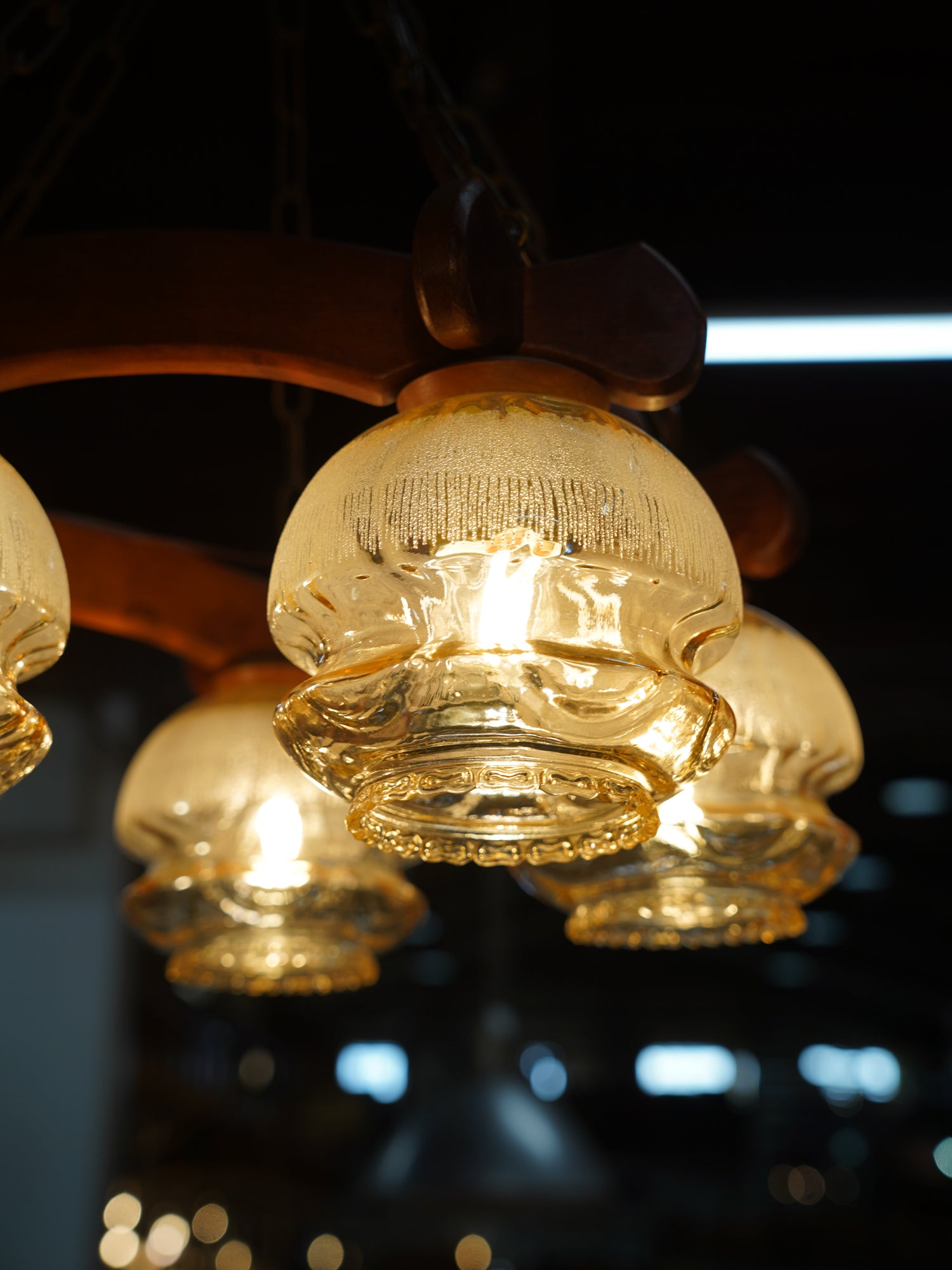 落ち着いた色合いの木製フレームと、ふっくらとした形状の琥珀色ガラスシェードが特徴的なシャンデリアです。