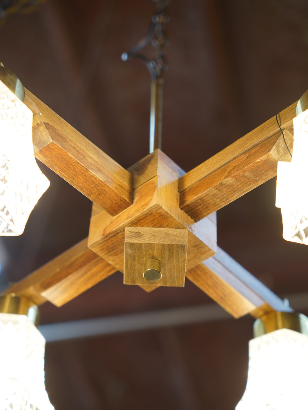繊細な装飾が施されたシェードに対して、天然木の十字に組まれたフレームが力強い印象です。
