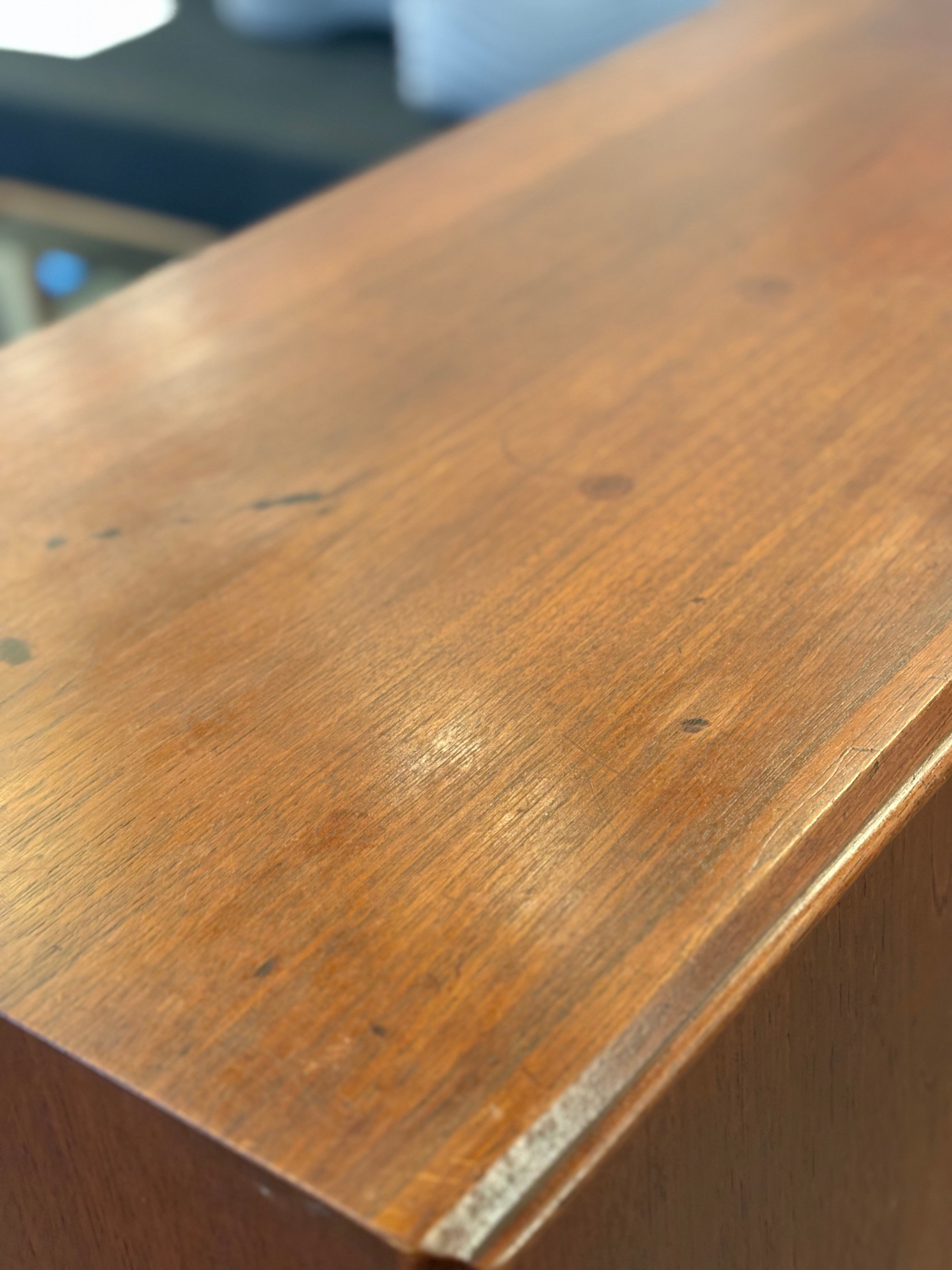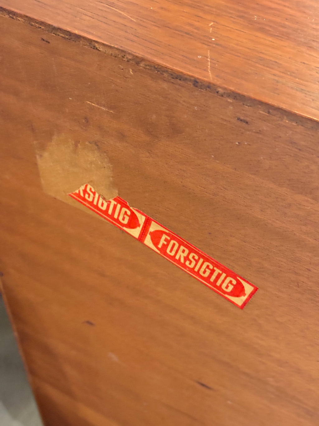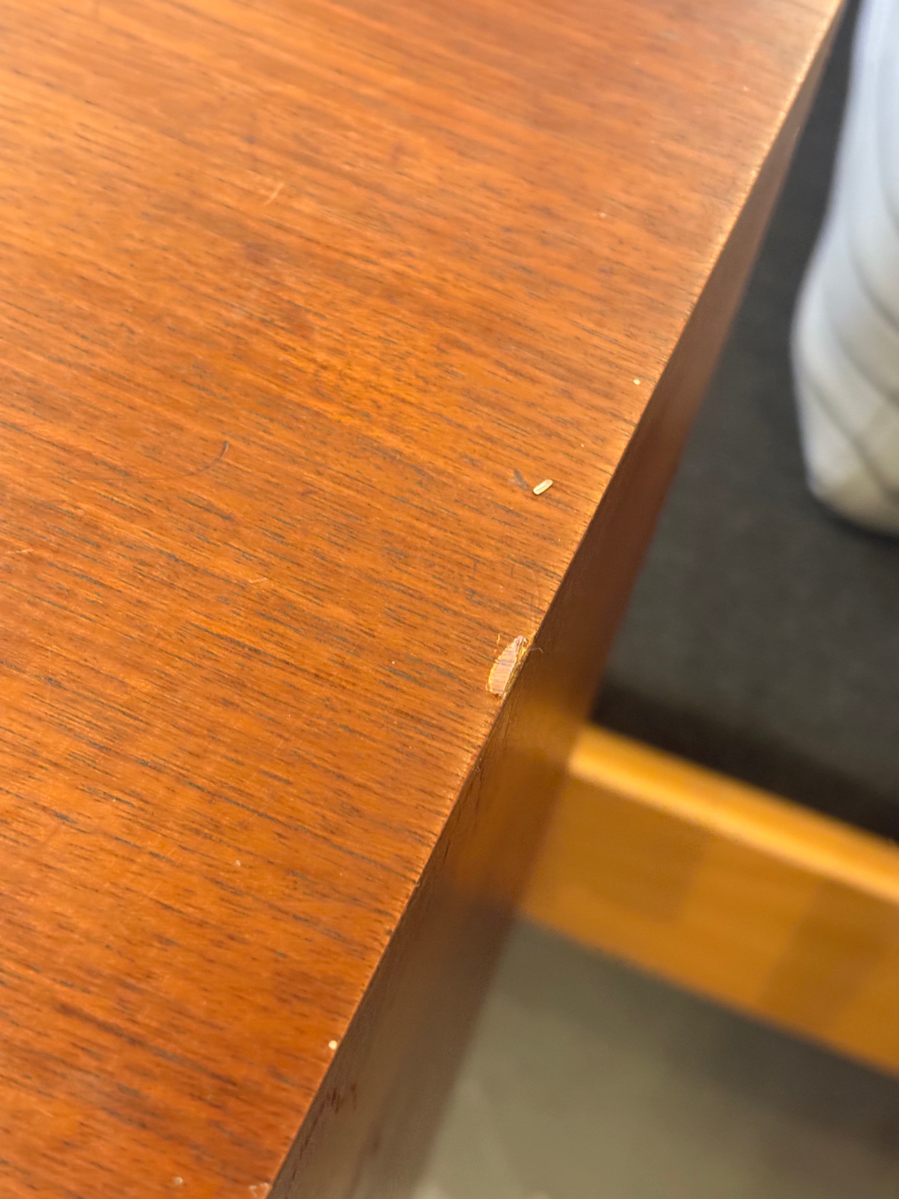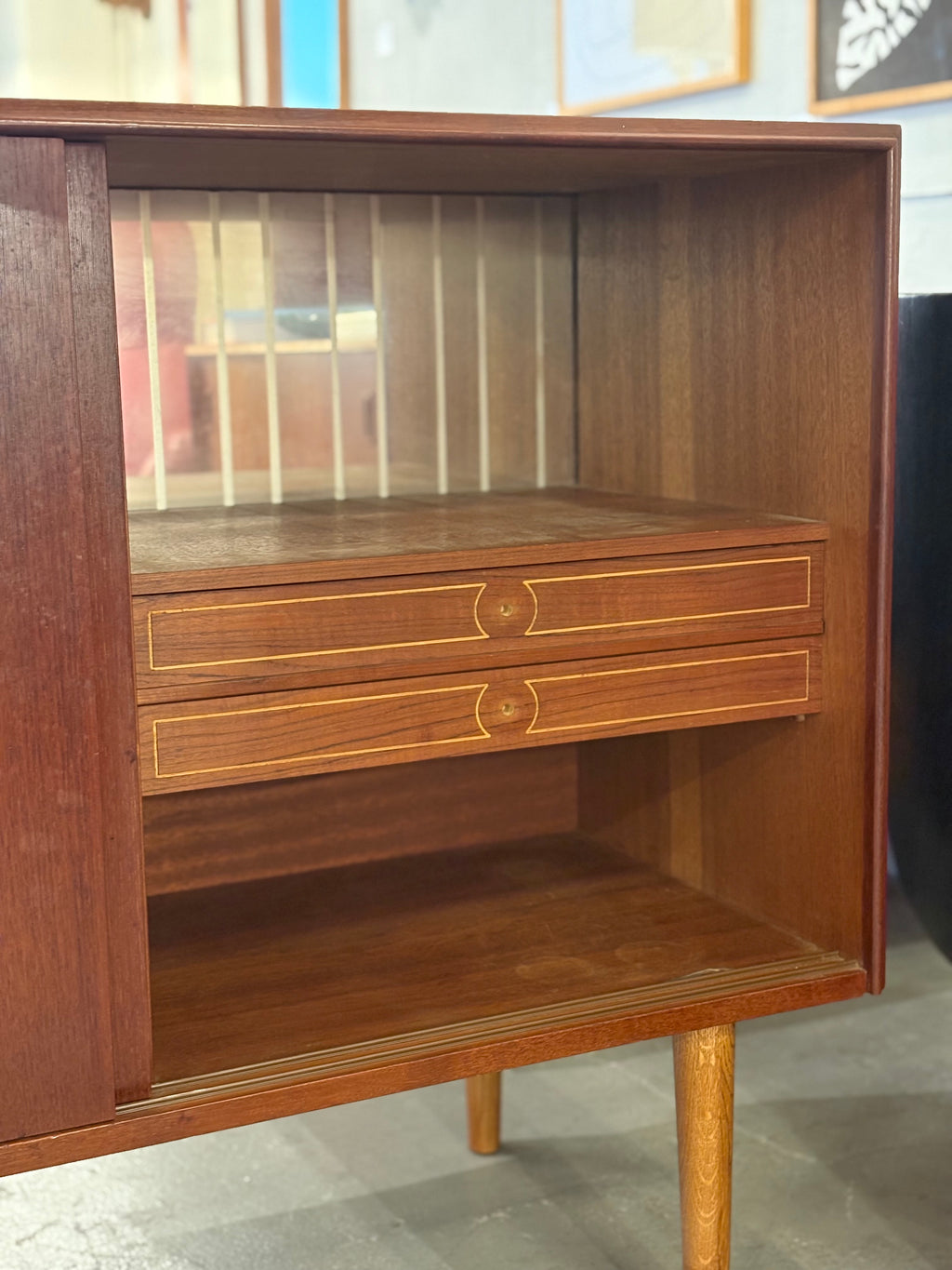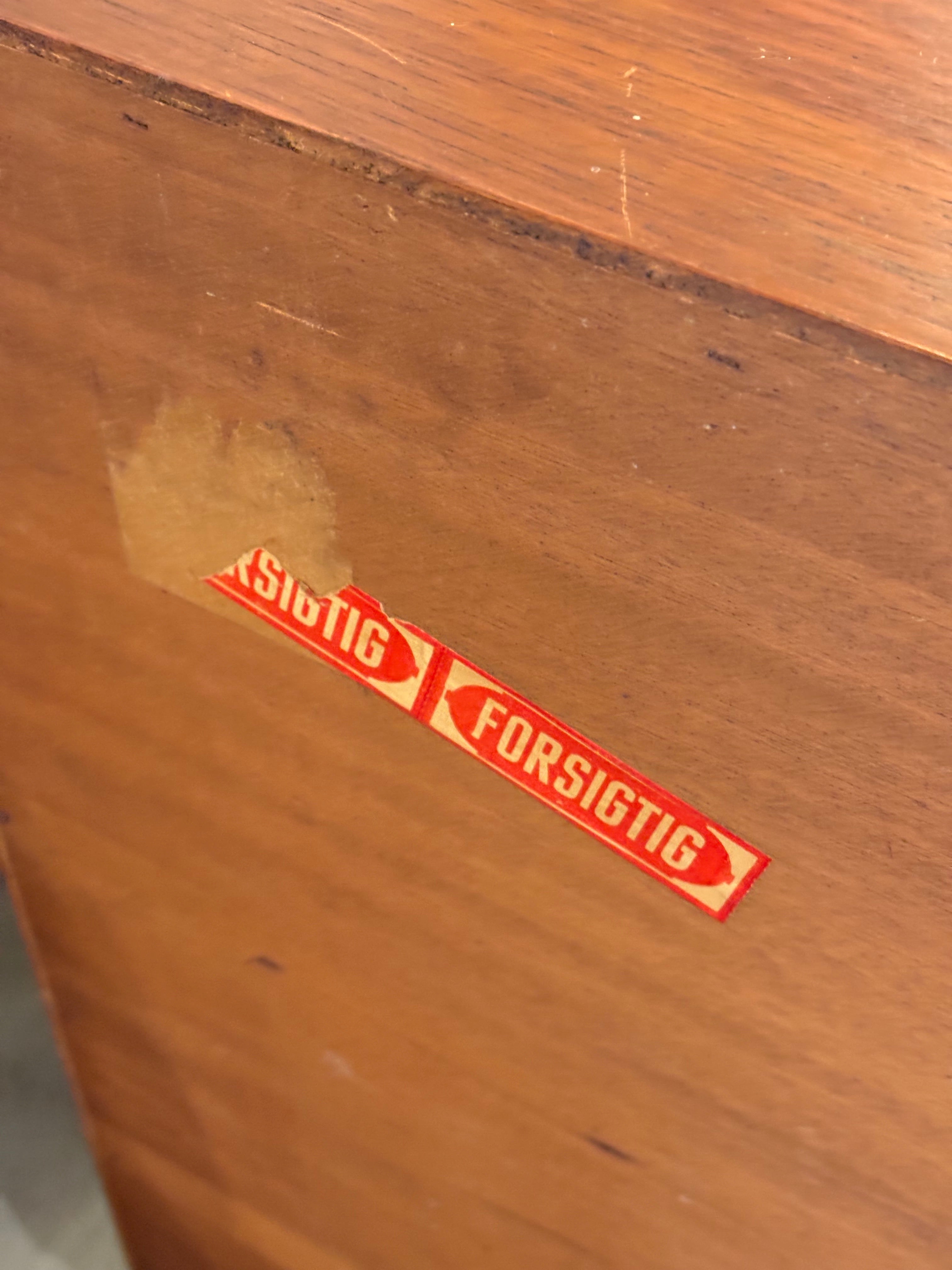 ボックス型のボディを支えるテーパードレッグは、この時代の北欧家具を象徴するディテールであり、重厚感のある本体に軽快なリズムを加えています。