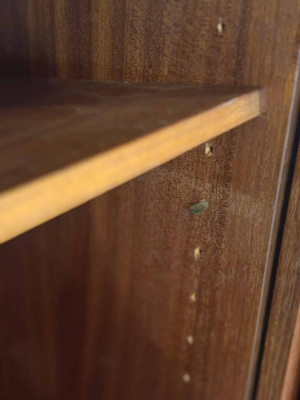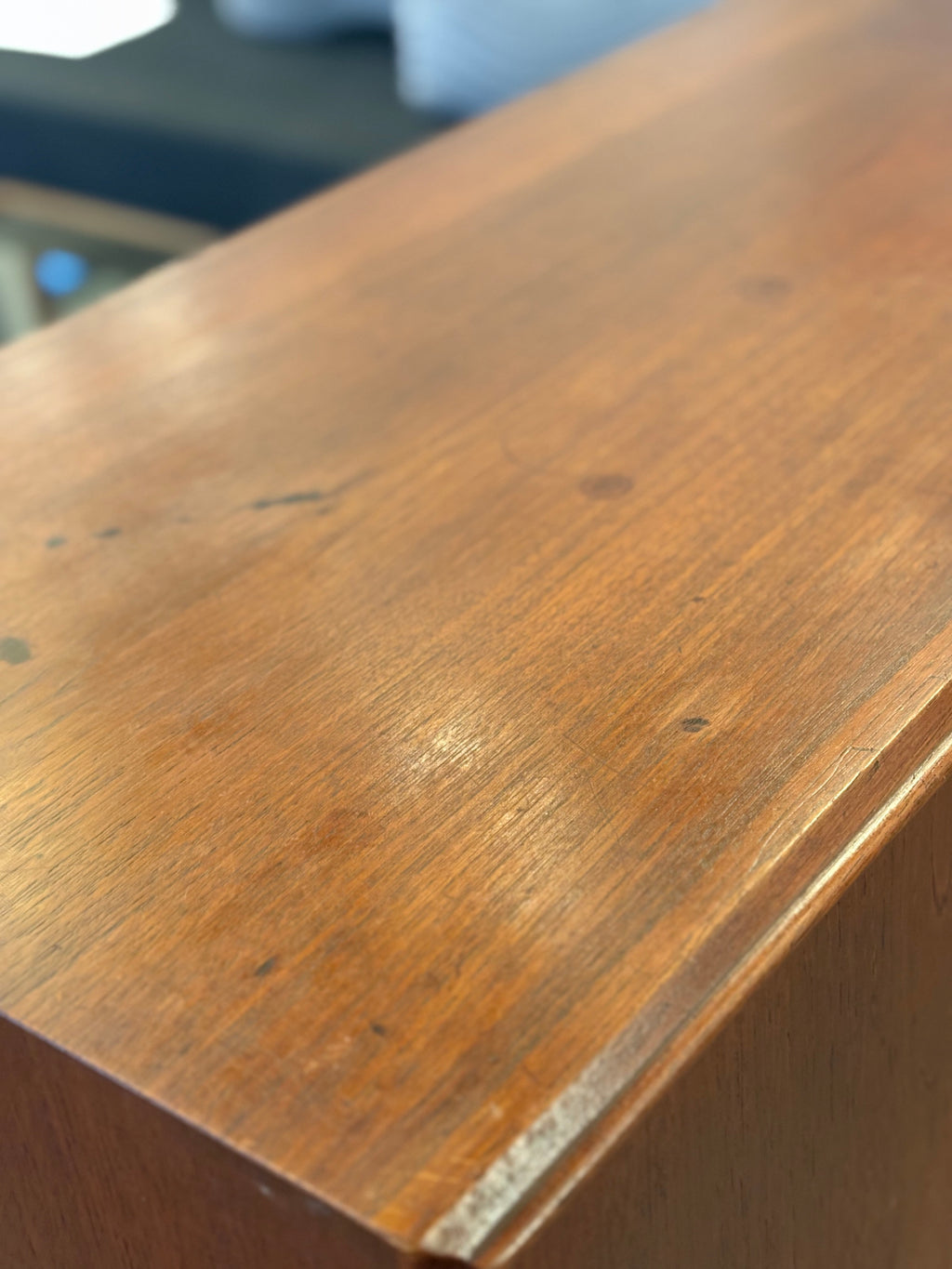 余計な装飾を排した究極にシンプルでモダンなデザインが、チーク材の豊かな木目と深い赤みを帯びた色艶を最大限に引き立てています。長い年月を経たチークの木肌は、周囲の光を柔らかく反射し、空間全体に温かい印象を与えます。