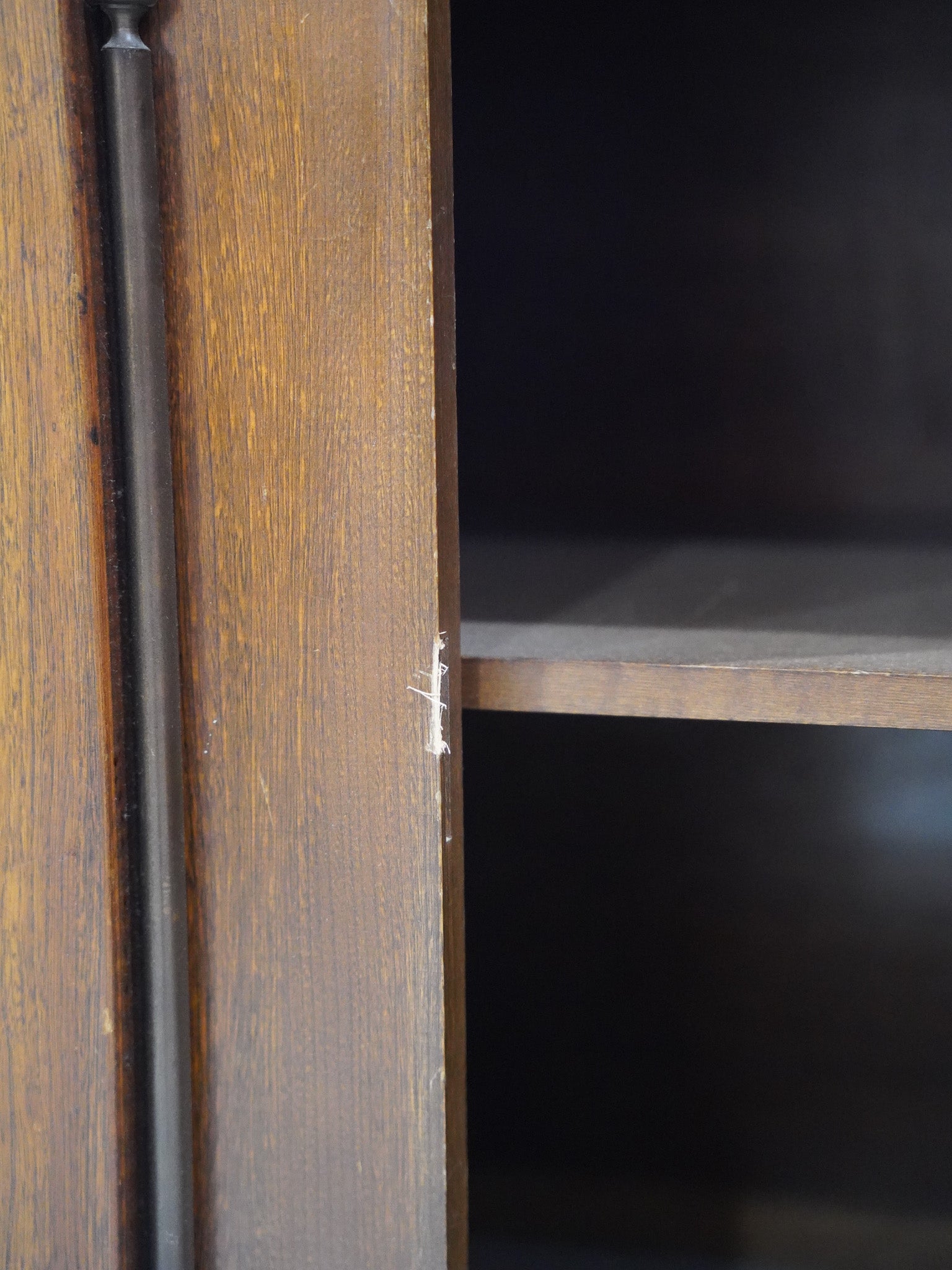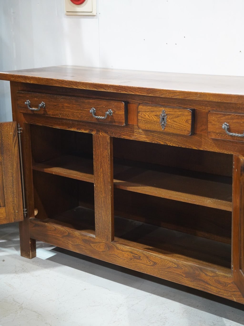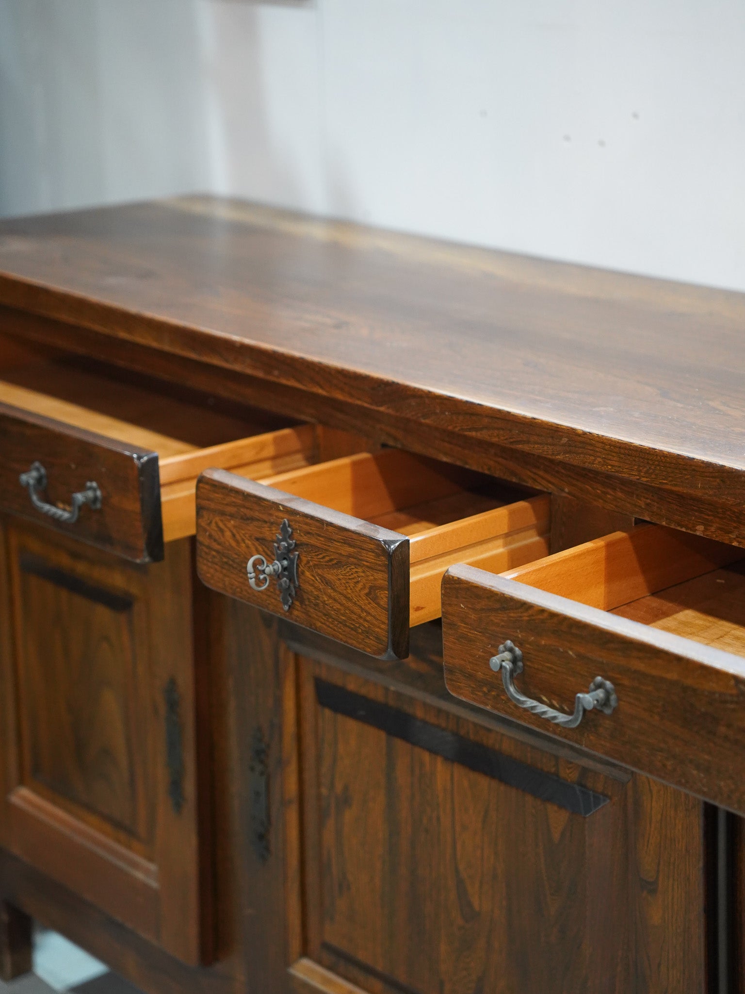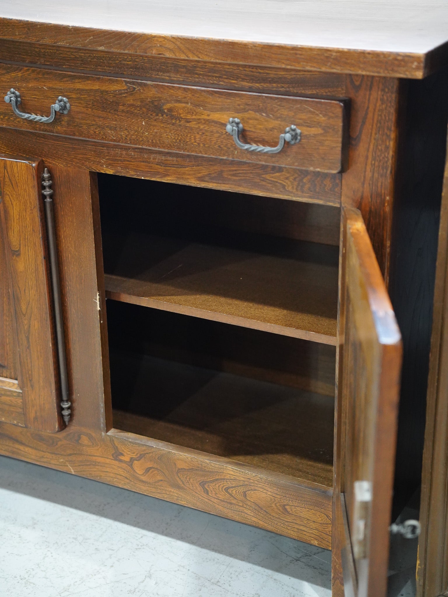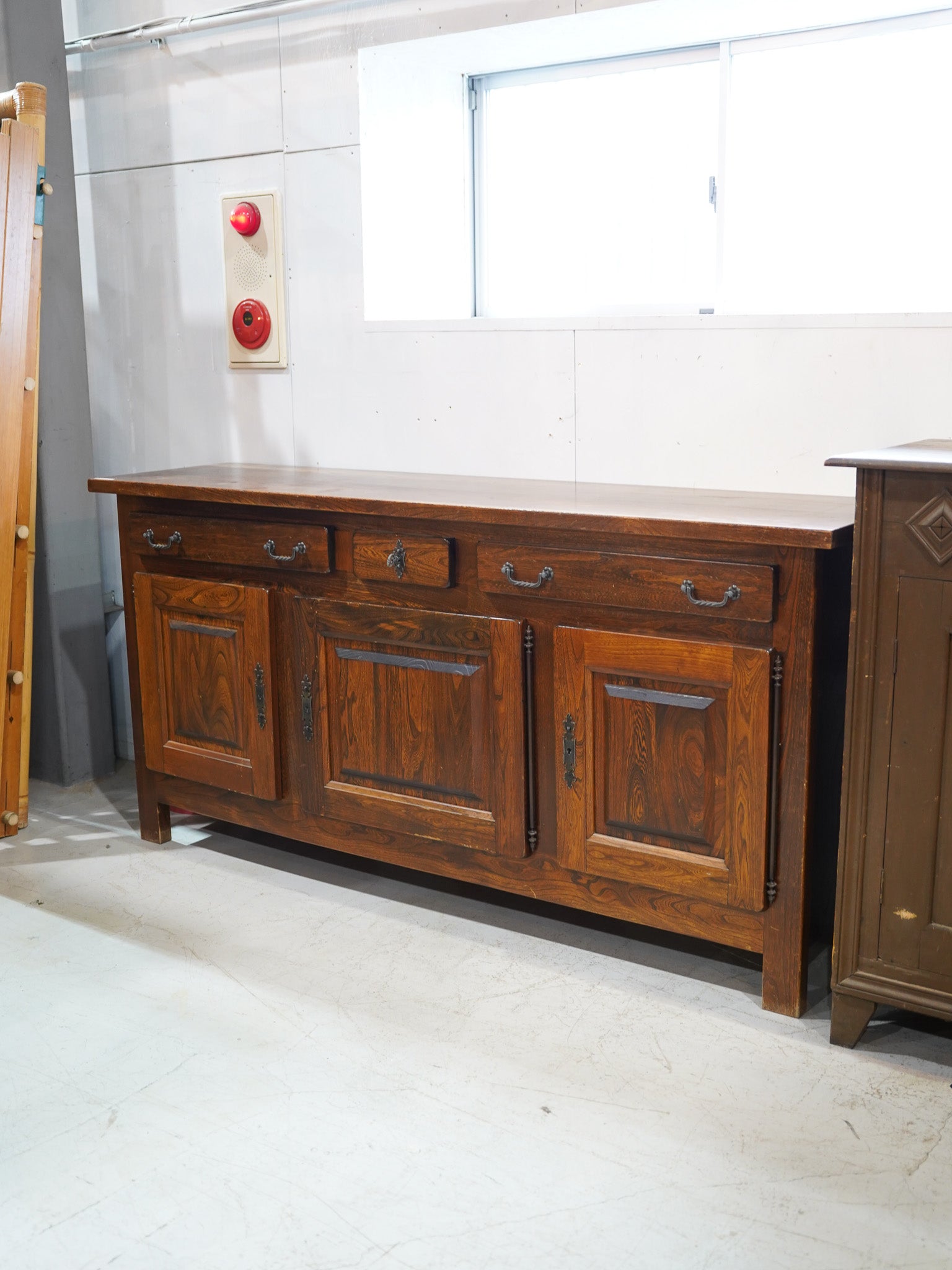 こちらは、素朴ながらも重厚な佇まいが魅力のアンティーク ローボード/キャビネットです。全体的に落ち着いたダークブラウンの色合いで、長年の使用によって培われた深みと艶が感じられます。