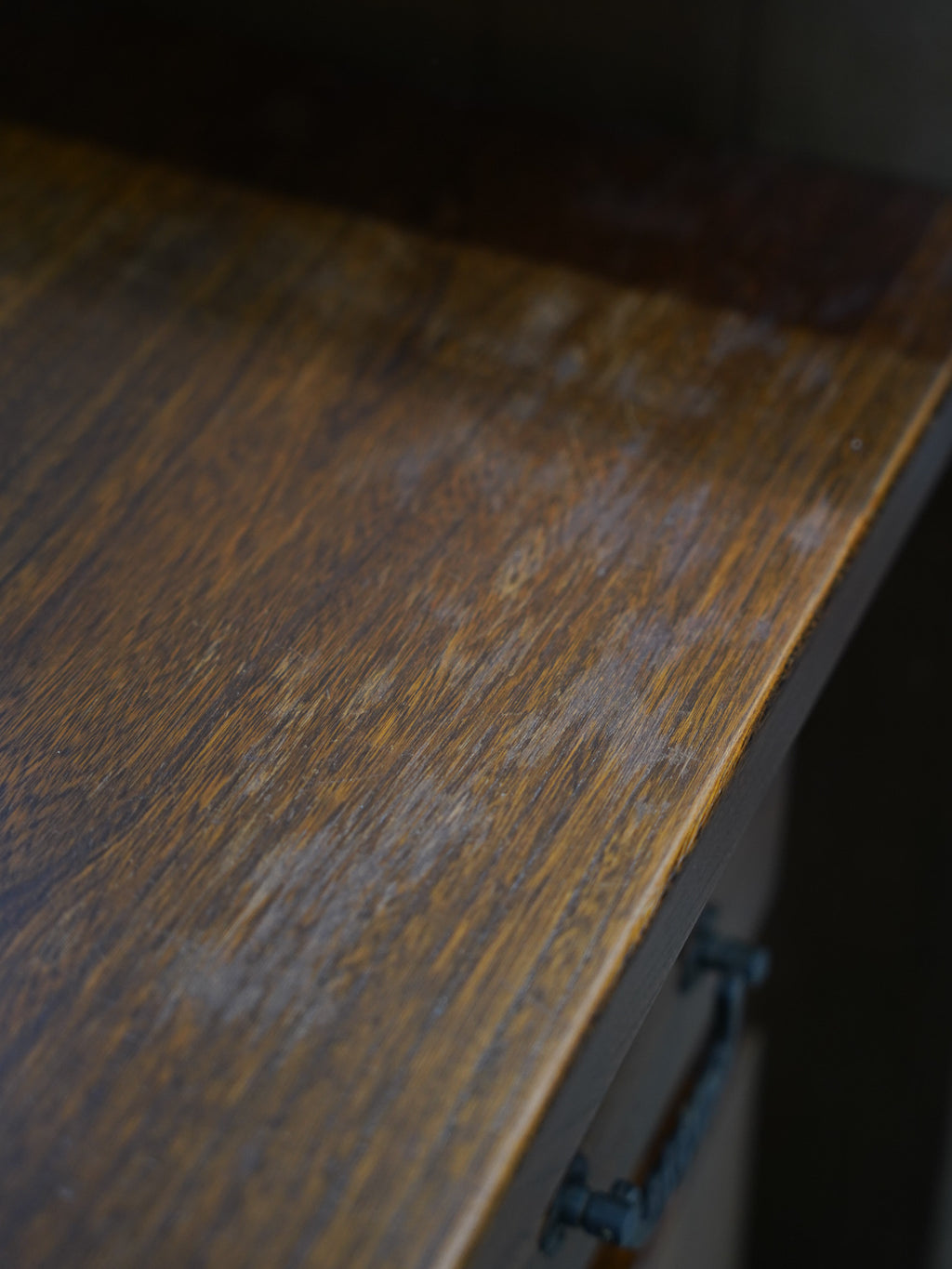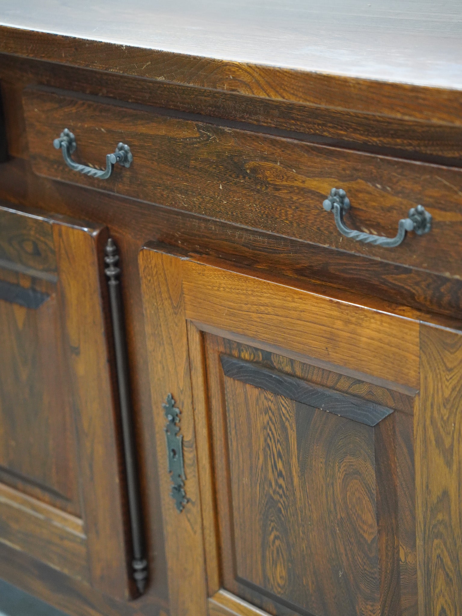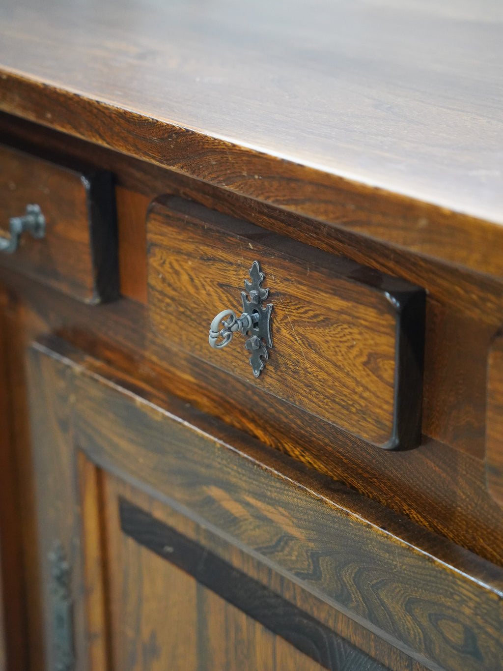 デザインは、中央に3つの引き出し、その下に3枚のキャビネット扉が配されたシンメトリーな構成。左右の引き出しにはエレガントなアイアンまたは真鍮製の取っ手が、中央の引き出しには趣のある鍵穴付きの装飾金具が取り付けられており、クラシカルなアクセントを加えています。扉のパネルにも立体的な加工が施され、全体のデザインに深みを与えています。