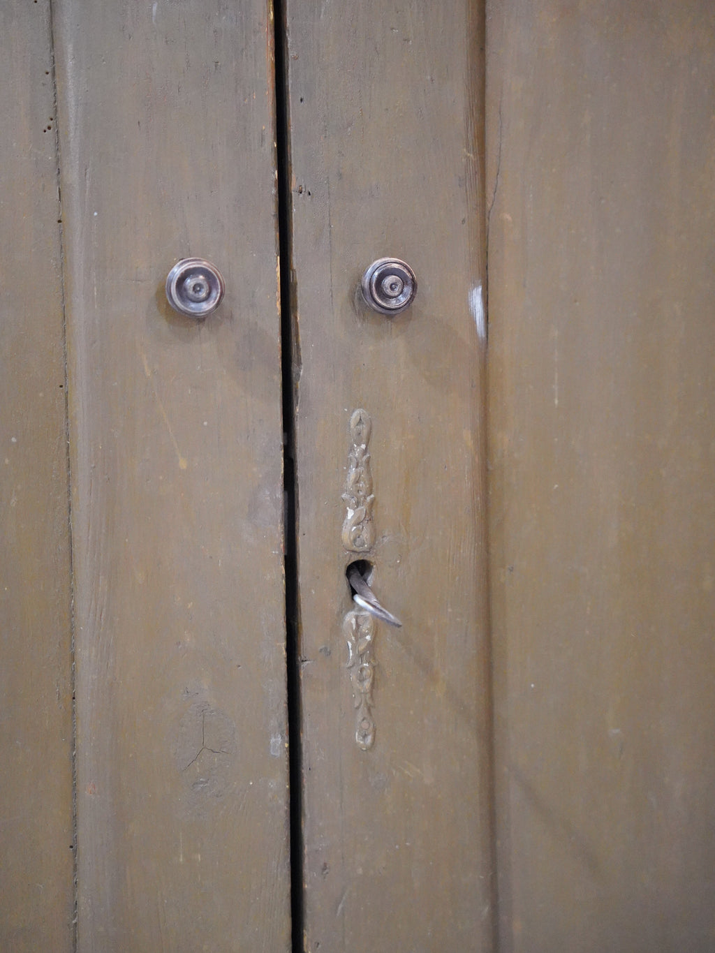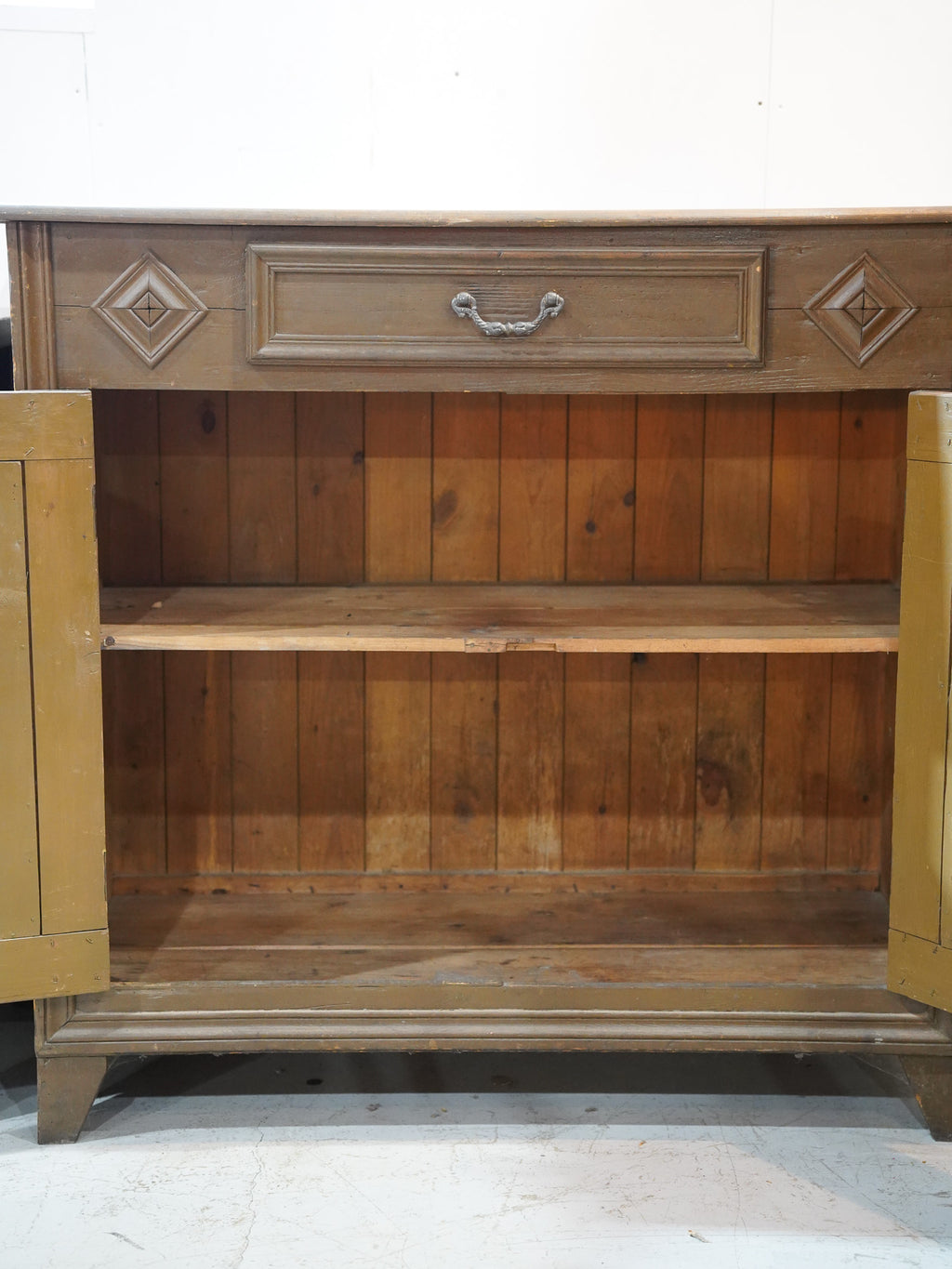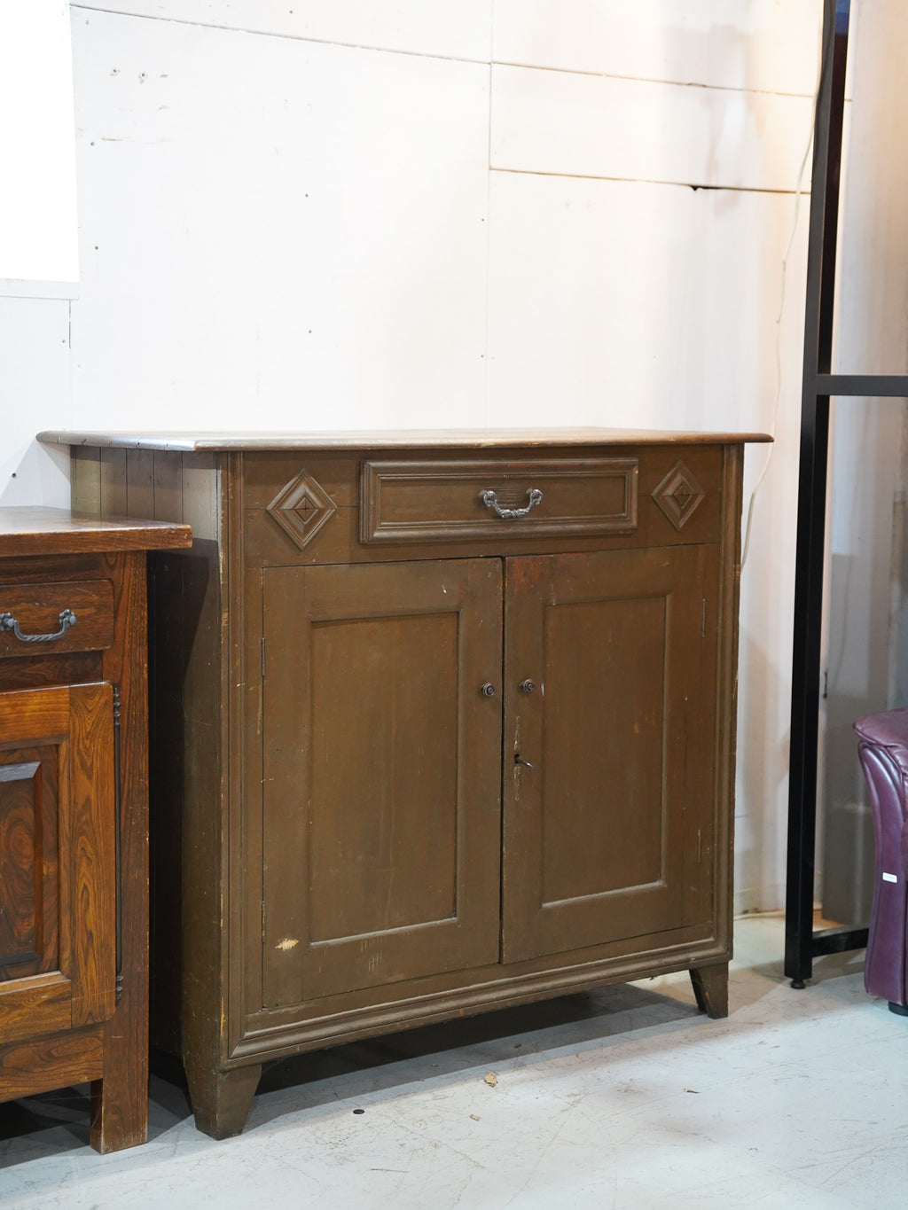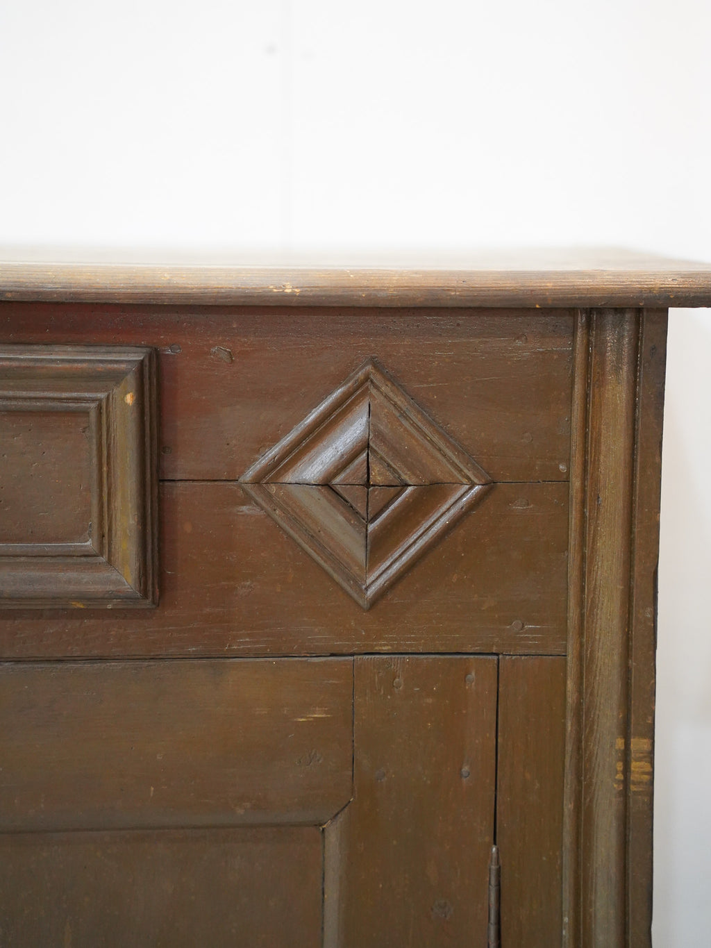 特に目を引くのは、扉上部両端にあしらわれたひし形(ダイヤ型)のレリーフ装飾です。この立体的な木工細工が、シンプルなデザインの中にクラシカルで温かみのあるアクセントを加えています。